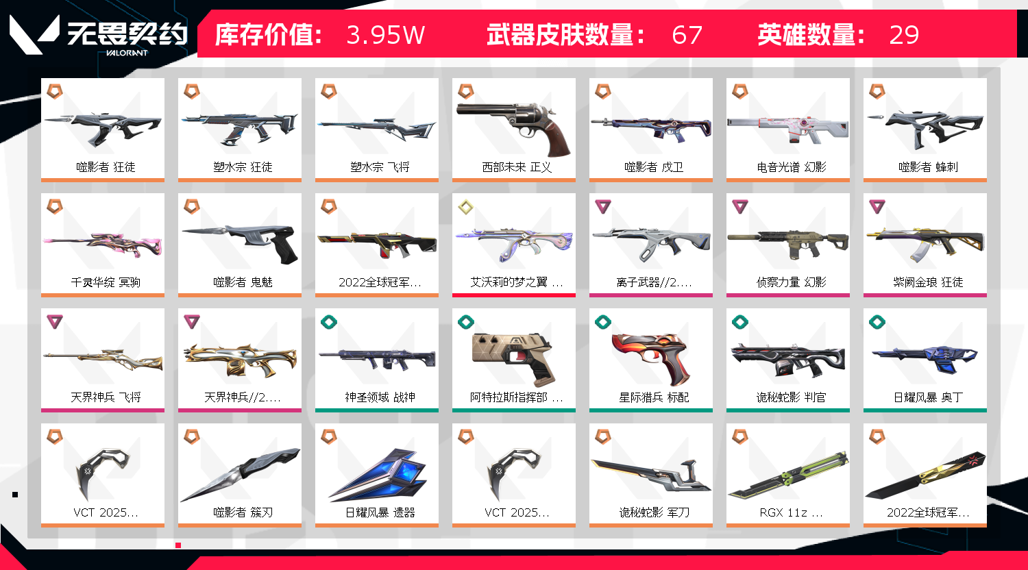 ❤️3.9w库存❤️22套❤️西部正义❤️侦察幻影❤️猫猫枪❤️vct25爪刀❤️;VCT 2025 爪刀,噬影者 狂徒,侦察力量 幻影,紫阙金琅 狂徒,塑水宗 狂徒,离子武器//2.0 狂徒,塑水宗 飞将,