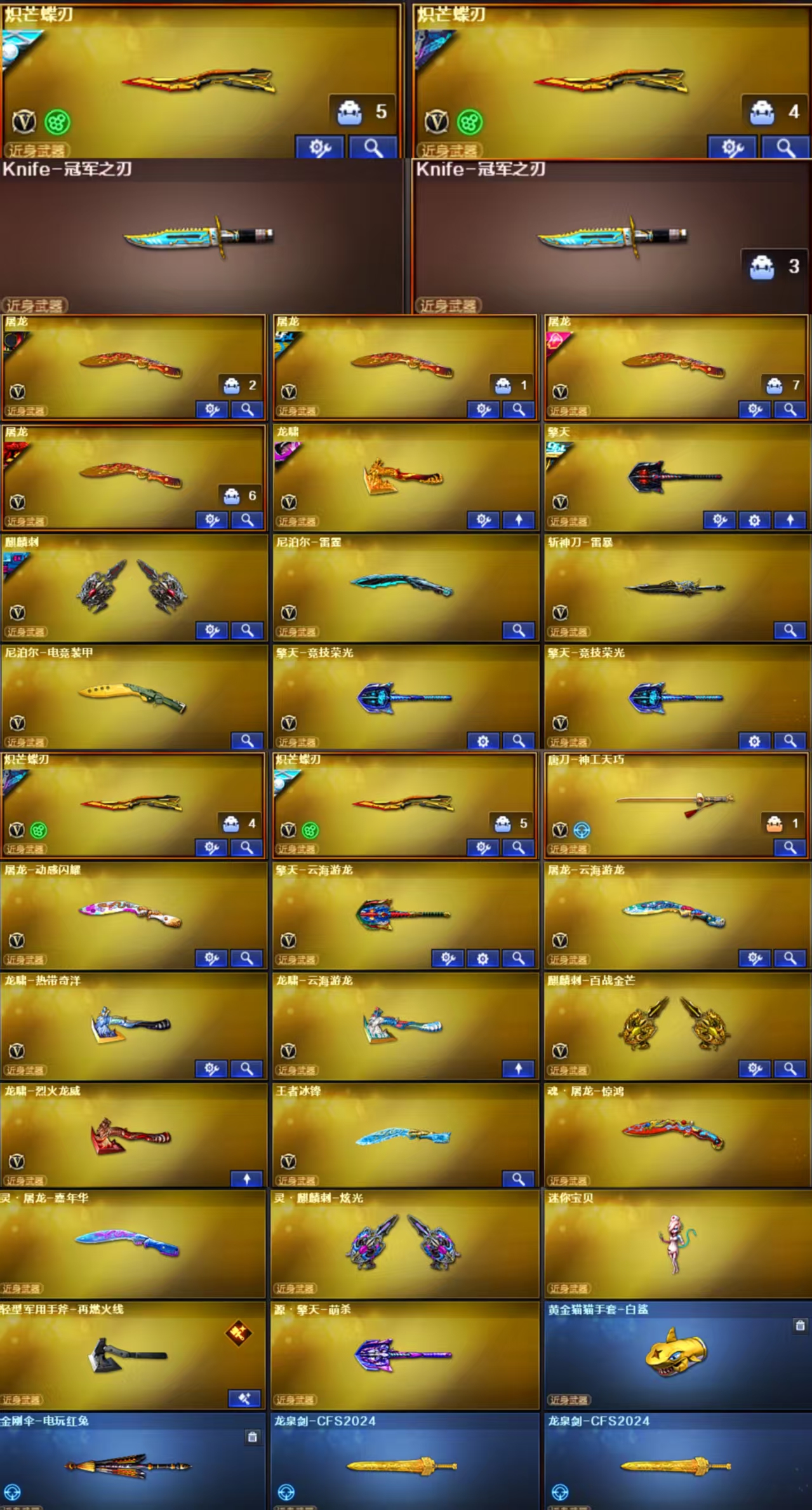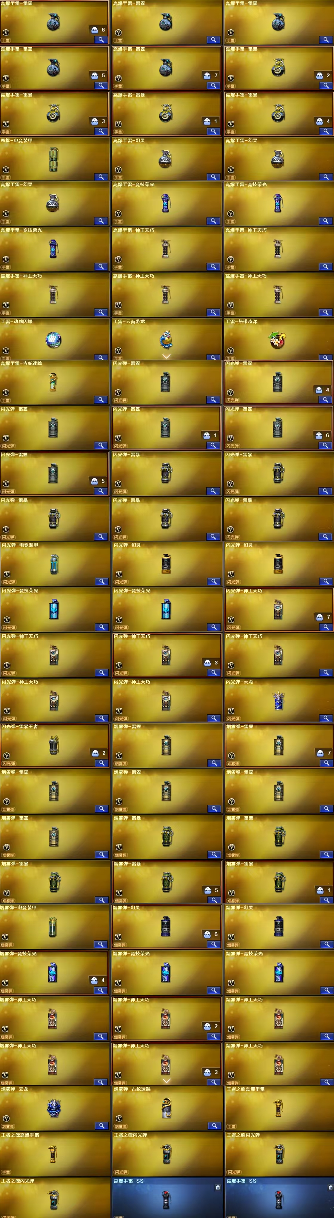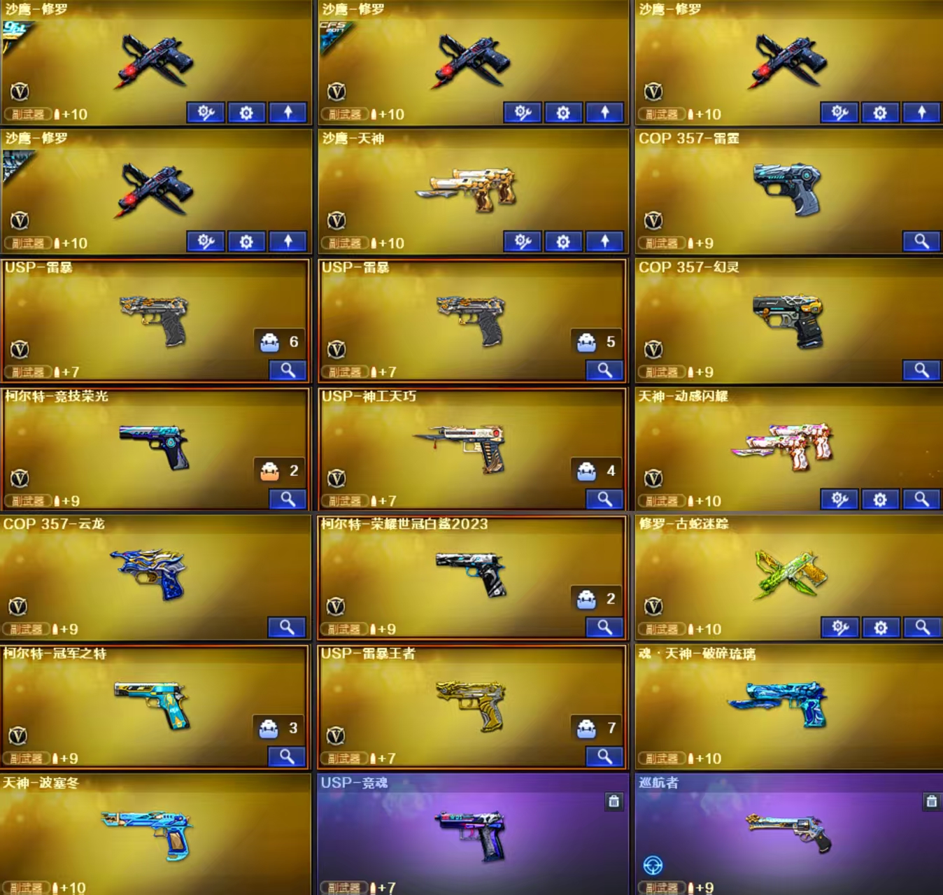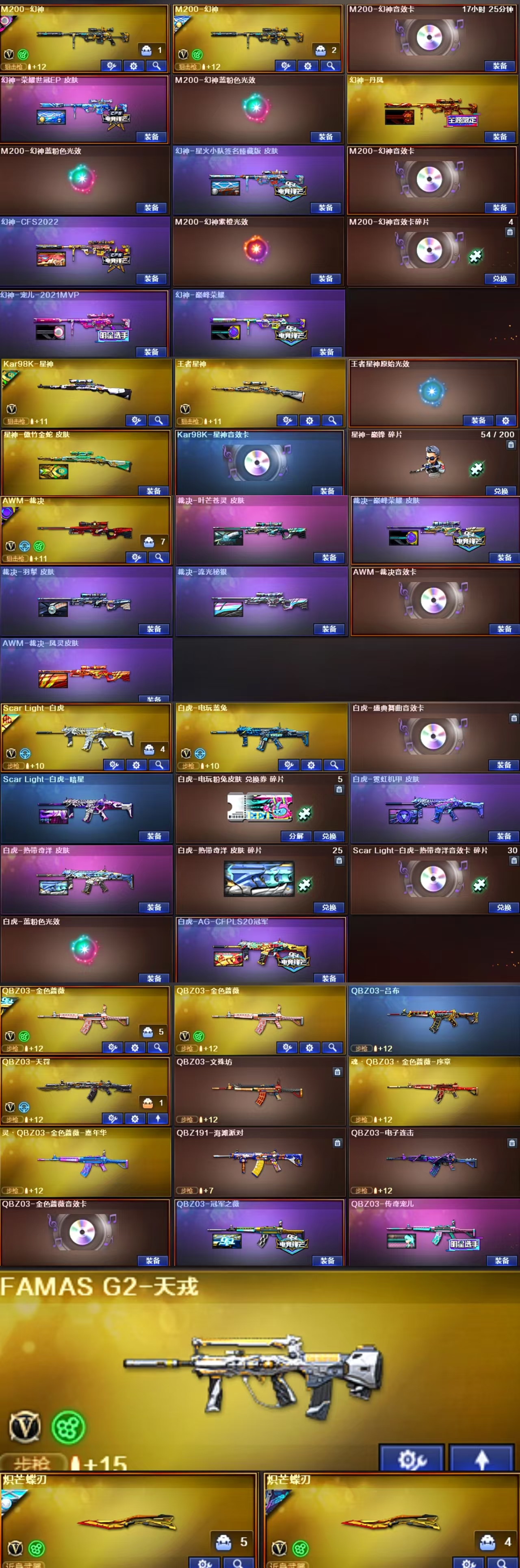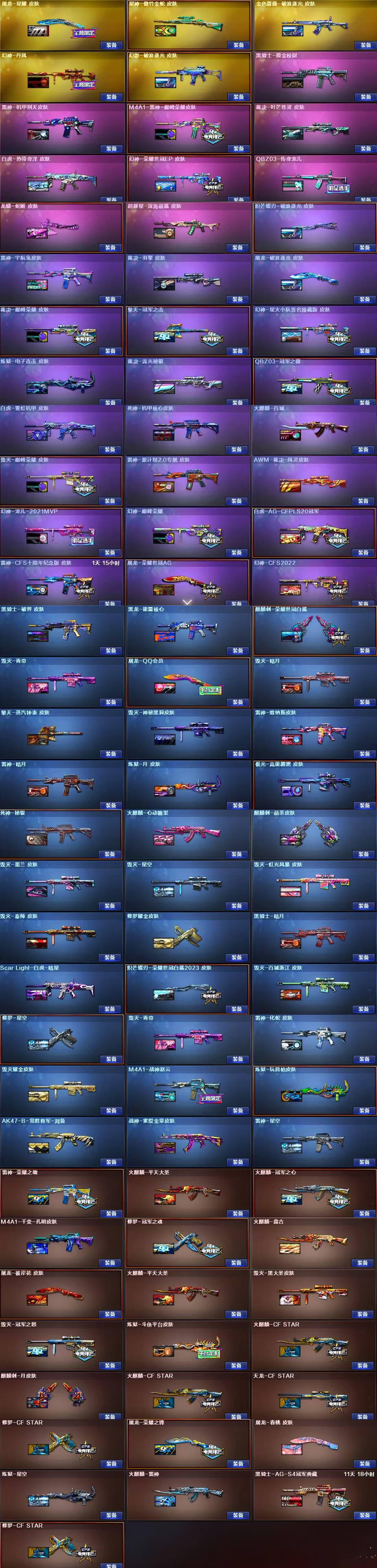 觉醒版;王者之魄闪光弹;王者之魄高爆手雷;王者之决-觉醒版;王者星神-觉醒版 英雄武器:Barrett-碧霄极光;机械迷城-穹宇;FAMAS G2-天戎;QBZ03-天罚;沙鹰-天神;M200-幻神;柯尔特-荣耀世冠白鲨2023;Kar98K-星神;黑骑士-海王;M4A1-雷神;屠龙;QBZ03-金色蔷薇;烟雾弹-云龙;AWM-裁决;RPK-盘龙;COP 357-云龙;Barrett-极光;闪光弹-云龙;雷霆之契;高爆手雷-雷霆;烟雾弹-雷霆;闪光弹-雷霆;雷霆之锋;USP-雷暴;高爆手雷-雷暴;烟雾弹-雷暴;闪光弹-雷暴;斩神刀-雷暴;超新星-热带奇洋;黑武士-锦绣游龙;龙啸-热带奇洋;炽芒蝶刃;手雷-热带奇洋;G36C-幻影;沙鹰-修罗;汤姆逊-烈龙;加特林-炼狱;AA-12-雷霆;屠龙-云海游龙;烈龙-云海游龙;手雷-云海游龙;擎天-云海游龙;烟雾弹-幻灵;高爆手雷-幻灵;闪光弹-幻灵;COP 357-幻灵;龙啸-烈火龙威;烈火-动感闪耀;屠龙-动感闪;USP-雷暴,USP-雷暴王者,柯尔特-荣耀世冠白鲨2023,柯尔特-冠军之特,炽芒蝶刃,Knife-冠军之刃,隼,