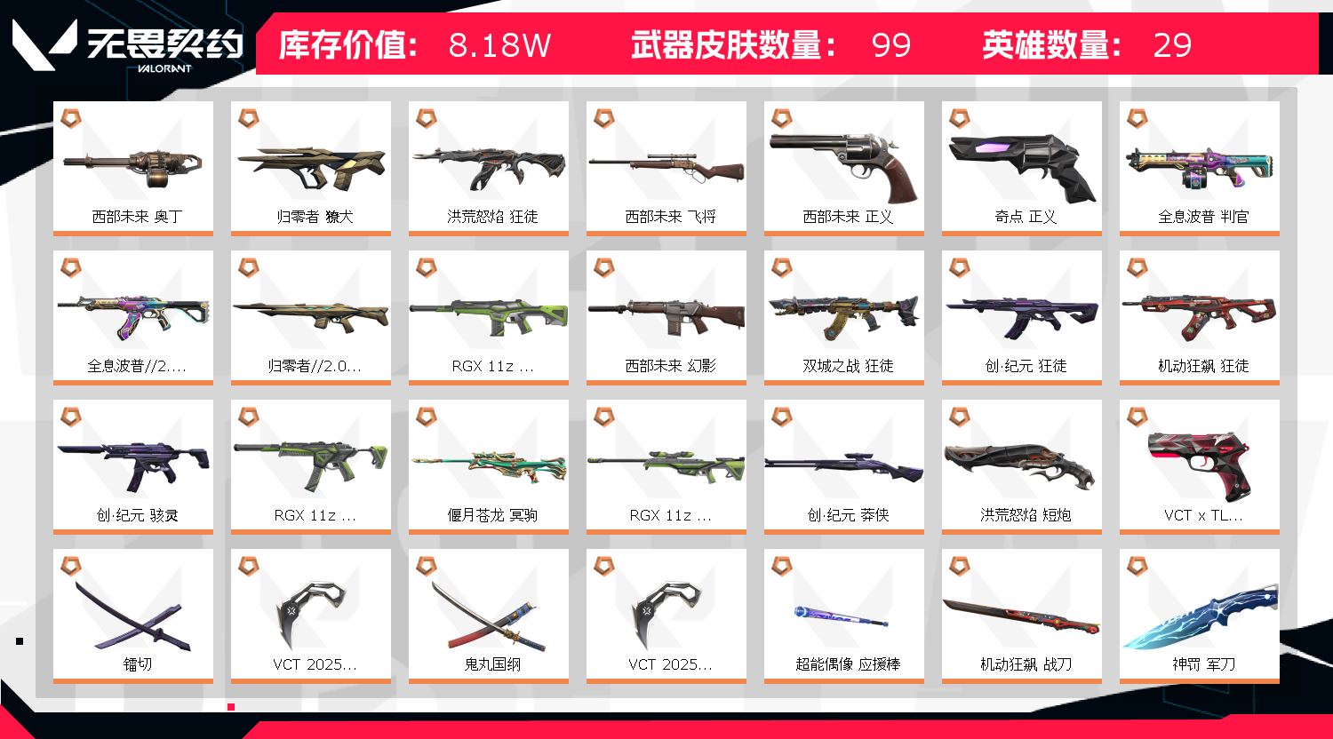 账号充值金额巨大 已备案 封号必究 不要炸鱼 不要骂人 多次重开提示后不要再重开了 炸鱼挂机导致禁赛 骂人导致禁言 永久拉黑 请勿乱使用r点 r点你乱用了 新出的新套装无r点升级 大家都文明使用账号 新套装出了大家即刻都能玩 补新套装的速度取决于号里有无r点;西部未来 奥丁,镭切,VCT 2025 爪刀,起源 雄鹿,归零者 獠犬,洪荒怒焰 狂徒,掠影 狂徒,