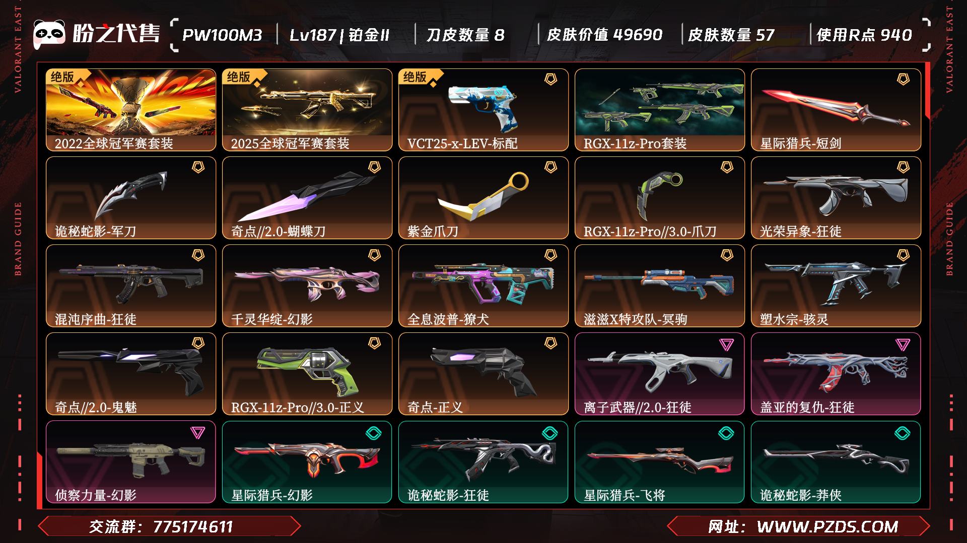 【皮肤资产价值】49690 【使用R点】940 【英雄数量】28 【皮肤数量】57 【卡面数量】111 【喷漆数量】74 【挂件数量】73 【拥有套装】2022全球冠军赛套装(2022全球冠军赛-幻影,2022全球冠军赛-蝴蝶刀)RGX-11z-Pro套装(RGX-11z-Pro-狂徒,RGX-11z-Pro-戍卫,RGX-11z-Pro-蜂刺,RGX-11z-Pro-狂怒,RGX-11z-Pro-战刀)2025全球冠军赛套装(2025全球冠军赛-狂徒,2025全球冠军赛-蝴蝶刀 ) 【拥有近战武器】星际猎兵-短剑,诡秘蛇影-军刀,奇点//2.0-蝴蝶刀,紫金爪刀,RGX-11z-Pro//3.0-爪刀, 【拥有步枪】光荣异象-狂徒,混沌序曲-狂徒,千灵华绽-幻影,全息波普-獠犬,离子武器//2.0-狂徒,盖亚的复仇-狂徒,侦察力量-幻影,星际猎兵-幻影,诡秘蛇影-狂徒,瑰梦艺语-狂徒,光环序列-戍卫,末日之翼-幻影,折光棱晶-戍卫, 【拥有狙击枪】滋滋X特攻队-冥驹,星际猎兵-飞将,诡秘蛇影-莽侠,光环序列-冥驹,末日之翼-飞将, 【拥有机枪】光环序列-战神,末日之翼-奥丁, 【拥有冲锋枪】塑水宗-骇灵,无限竞技-骇灵,瑰梦艺语-骇灵,折光棱晶-蜂刺, 【拥有霰弹枪】星际猎兵-判官,诡秘蛇影-判官,瑰梦艺语-雄鹿, 【拥有手枪】VCT25-x-LEV-标配,奇点//2.0-鬼魅,RGX-11z-Pro//3.0-正义,奇点-正义,幻心猎手-鬼魅,星际猎兵-标配,阿特拉斯指挥部-标配,日耀风暴-正义,诡秘蛇影-鬼魅,超限闪存-正义,瑰梦艺语-鬼魅,光环序列-狂怒,折光棱晶-标配,末日之翼-短炮,星云暗涌-鬼魅,纳米-正义, 【稀有挂件】章鱼烧先生挂饰,V25第六幕铂金挂饰,第九季黄金挂饰,终章猫猫木乃伊挂饰,致命一击挂饰,无畏契约GO卷贤者挂饰,无畏契约GO卷芮娜挂饰,无畏契约GO卷零挂饰,熔岩灯挂饰,袖珍捷风挂饰, 【卡面信息】势不可挡捷风卡面,星宿灿烂猎枭卡面,我眼中的世界卡面,双城之战拥抱卡面,;紫金爪刀,盖亚的复仇 狂徒,侦察力量 幻影,RGX 11z Pro 狂徒,混沌序曲 狂徒,光荣异象 狂徒,离子武器//2.0 狂徒,