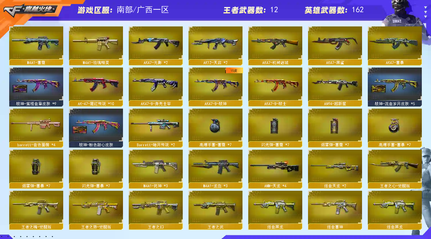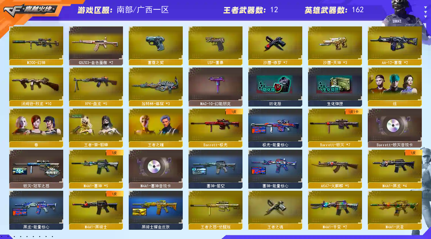 ⭐⭐⭐⭐⭐⭐⭐⭐⭐⭐⭐⭐⭐ ⭐ 国服第神豪账号 欢迎您的体验 ⭐ ⭐⭐⭐⭐⭐⭐⭐⭐⭐⭐⭐⭐⭐ ❤️❤️❤️❤️❤️本号持续更新中 欢迎收藏此号❤️❤️❤️❤️❤️ ✨本号会第时间紧跟官方更新最新皮肤和新枪,官方一旦有更新,本号会立刻跟进获得,让租客享受第时间享受新枪新皮肤带来的快乐!(请收藏此号,后续方便找到)✨❤❤ 6烈龙 ❤❤ 死亡之眼 ❤❤ 雷暴套装X7套 ❤❤ 雷霆套装X7套 ❤❤ M200-幻神 ❤❤ QBZ03-金色蔷薇 ❤❤ M4A1-雷霆 ❤❤ AK47-雷暴 ❤❤ USP-雷暴 ❤❤ 雷霆之契 ❤❤ 加特林-炼狱 ❤❤ RPK-盘龙 ❤❤ 汤姆逊-烈龙 ❤❤ 死亡之眼 ❤❤ 宋雨琦 ❤❤ 春 ❤❤ 葵 ❤❤ 零 ❤❤ 审判者 ❤❤ 王者-葵-貂蝉 ❤❤ 王者之瞳 ❤❤ 新海豹突击队 ❤❤ 炫 ❤❤ M4A1-雷神 ❤❤ 雷神-能量核心 ❤❤ 雷神-星空 ❤❤ M4A1-雷神音效卡 ❤❤ AK47-火麒麟 ❤❤ 火麒麟-CFSTAR ❤❤ 火麒麟-雷神 ❤❤ M4A1-黑骑士 ❤❤ 黑骑士耀金皮肤 ❤❤ 黑骑士-摸金校尉 ❤❤ M4A1-黑龙 ❤❤ 黑龙-能量核心 ❤❤ 黑龙-暗月 ❤❤ Barrett-毁灭 ❤❤ 毁灭-冠军之怒 ❤❤ Barrett-毁灭音效卡 ❤;USP-雷暴,RPK-盘龙,QBZ03-金色蔷薇,M200-幻神,