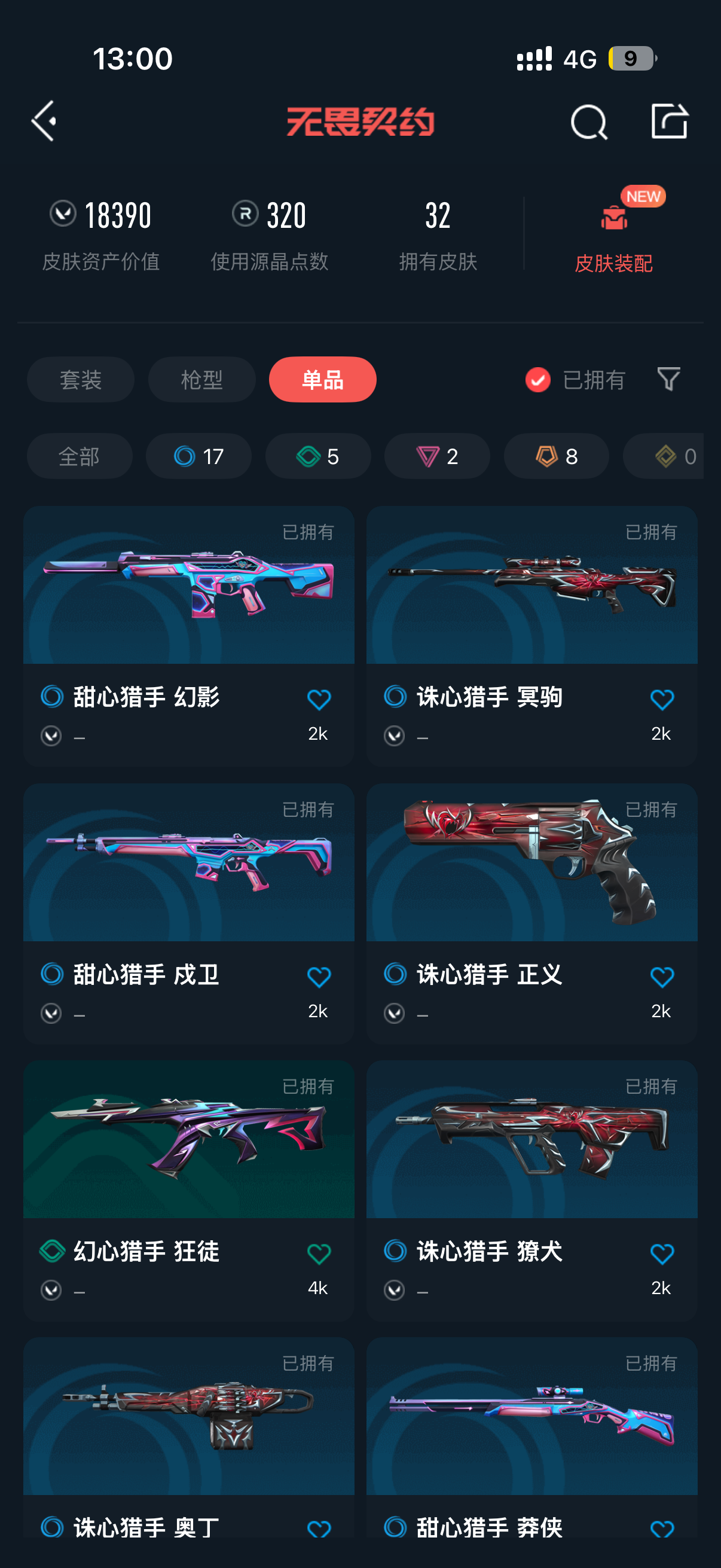 黄金III,,皮肤资产18390,甜心猎手、异鳞魔蛇、2025全球冠军赛、末日泡泡、VCT25 x KC标配、天界神兵//2.0、星际猎兵短剑、堕影者鬼魅、星际猎兵龙蛇这些热门皮肤全在,;