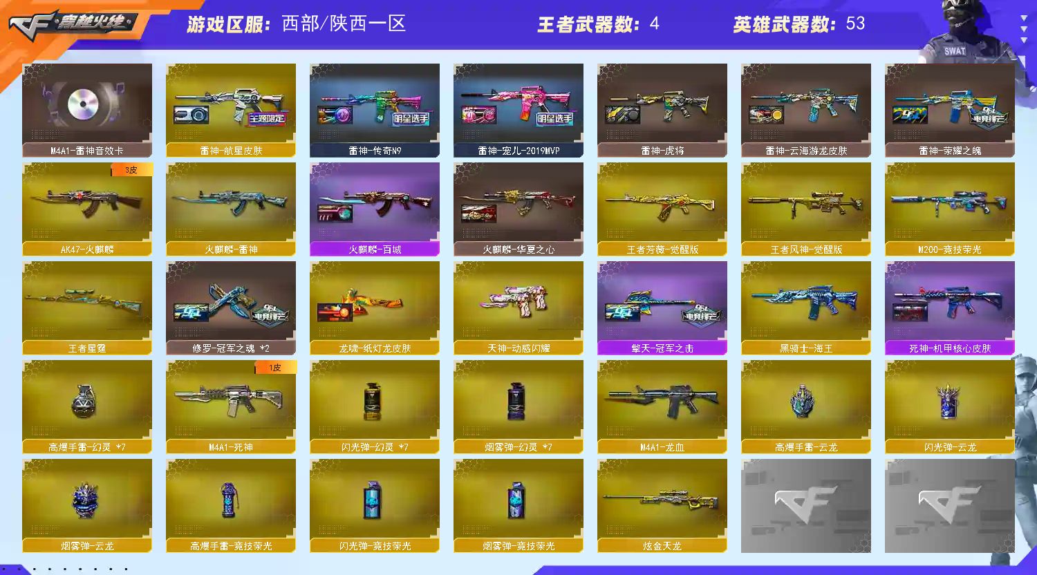 1传说】【传说影煞】【m200幻神+幻神宠儿+幻神传奇欧欧+幻神纸灯龙皮肤+幻神音效卡】【竞技柯尔特+冠军之特+cop幻灵+2cop云龙】【炽芒蝶刃】【觉醒王者风神】【m200竞技荣光】【觉醒王者星霆】【竞技荣光套】【青龙+白虎】【觉醒王者芳薇】【白虎冠军之虎皮肤+白虎电玩粉兔+金色蔷薇纸灯龙皮肤+qbz传奇宠儿+雷神宠儿皮肤+雷神传奇n9+雷神荣耀之魄+毁灭ag冠军+毁灭荣耀之怒+火麒麟华夏之心+炽芒蝶刃破浪逐光皮肤】【白虎音效卡+金色蔷薇音效卡+毁灭音效卡+雷神音效卡+雷神云海游龙音效卡】【机械姬+满配奇洋探员+乔伊教练+王者炽天使+王者潘多拉+满配云海玲珑】【金色蔷薇】【2烈龙+毒蜂】【牛牛ak47】【1911大黄蜂】;柯尔特-冠军之特,炽芒蝶刃,传说影煞,QBZ03-金色蔷薇,M200-幻神,Scar Light-白虎,