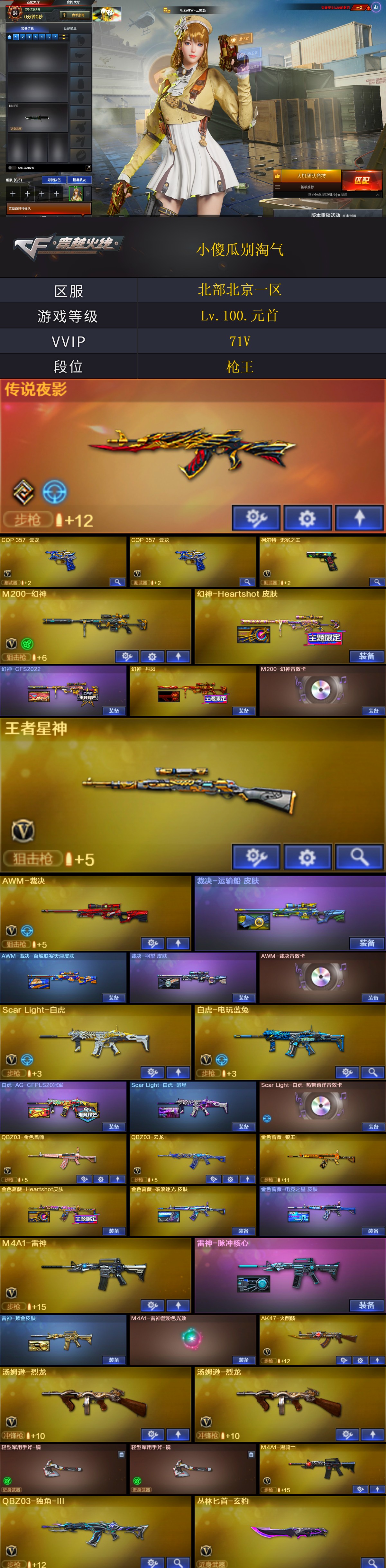 【商品标题】:北部北京一区-71V-可二次实名-【Lv.100.元首】-【段位:枪王】 【稀有武器】:传说夜影/M200-幻神/ScarLight-白虎/COP357-云龙(2)/柯尔特-无冕之王/修罗-古蛇迷踪/金色蔷薇-古蛇迷踪/QBZ03-云龙/QBZ03-金色蔷薇/AK47-火麒麟/M4A1-雷神(3)/M4A1-黑骑士/白虎-电玩蓝兔/Barrett-毁灭/Barrett-极光/AWM-裁决/汤姆逊-烈龙(2)/云龙扇 【王者武器】:王者之怒-觉醒版/王者星神-觉醒版 【热门角色】:电竞教官-云悠悠/魅影/奇洋探员/乔伊教练/蛇隐宗/王者潘多拉/潘多拉-X/兔囡囡/潘多拉 【热门音效卡】:M200-幻神音效卡/AWM-裁决音效卡 【热门皮肤】:幻神-Heartshot皮肤/幻神-CFS2022/幻神-丹凤/金色蔷薇-破浪逐光皮肤/金色蔷薇-Heartshot皮肤/裁决-羽掣皮肤/屠龙-荣耀世冠AG/白虎-AG-CFPLS20冠军/ScarLight-白虎-暗星/屠龙-荣耀之锋 【其他亮点】:贝雷塔687-射手座/金刚伞-电玩红兔 (截图展示段位不代表实际段位,如赛季更新等不可抗拒因素发生变化,其余道具看截图或咨询客服);柯尔特-无冕之王,电竞教官-云悠悠,QBZ03-金色蔷薇,M200-幻神,Scar Light-白虎,