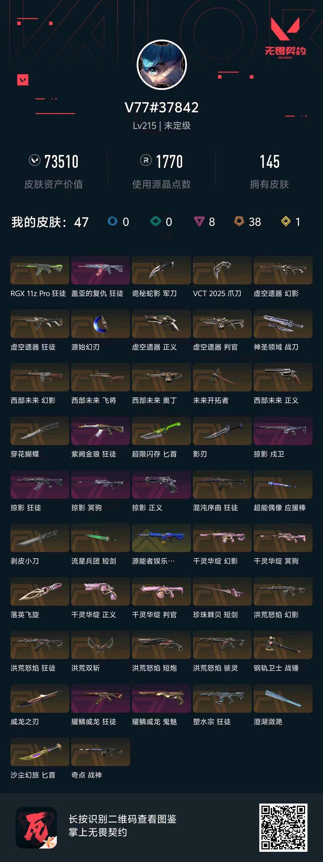 🈲炸鱼🈲挂机🔥7.3w库存🔥西部套🔥虚空套掠影套莲花套🔥流脓套热门等,看图有介绍;西部未来 奥丁,奇点 战神,剥皮小刀,威龙之刃,VCT 2025 爪刀,盖亚的复仇 狂徒,虚空遗器 狂徒,
