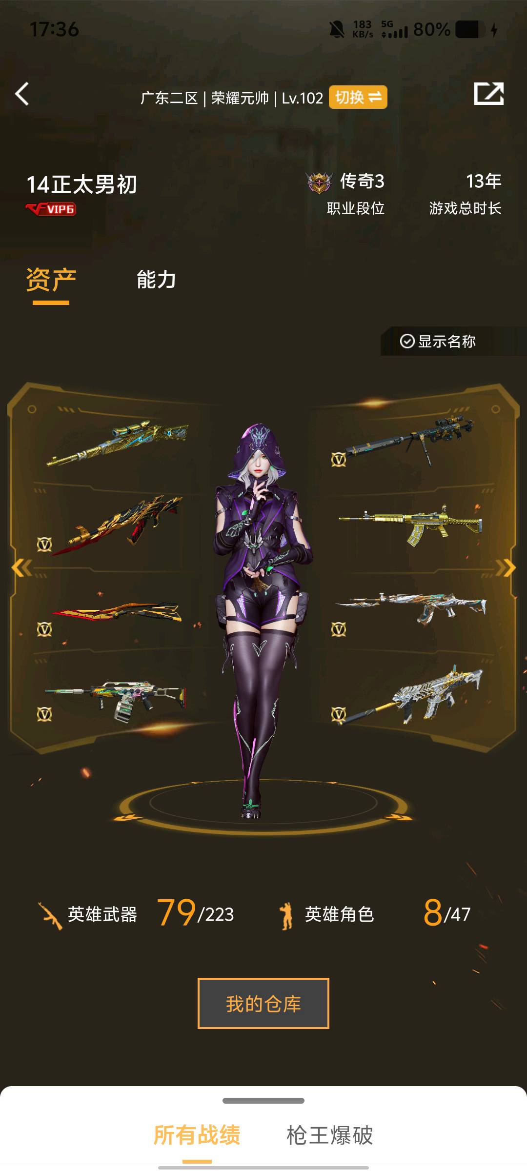 爆破号/幻神+俩皮/王者星霆/G36C幻影/白虎/炽芒蝶刃/裁决+皮/7套英雄投掷/传说qbz+AK