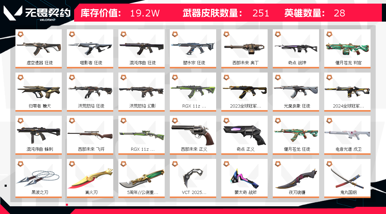 允许 英雄28 武器皮肤数量238极品多ak皮肤号;西部未来 奥丁,奇点 战神,黑波之刃,离火刃,5周年//公测重制版 苍龙之刃,VCT 2025 爪刀,起源 雄鹿,