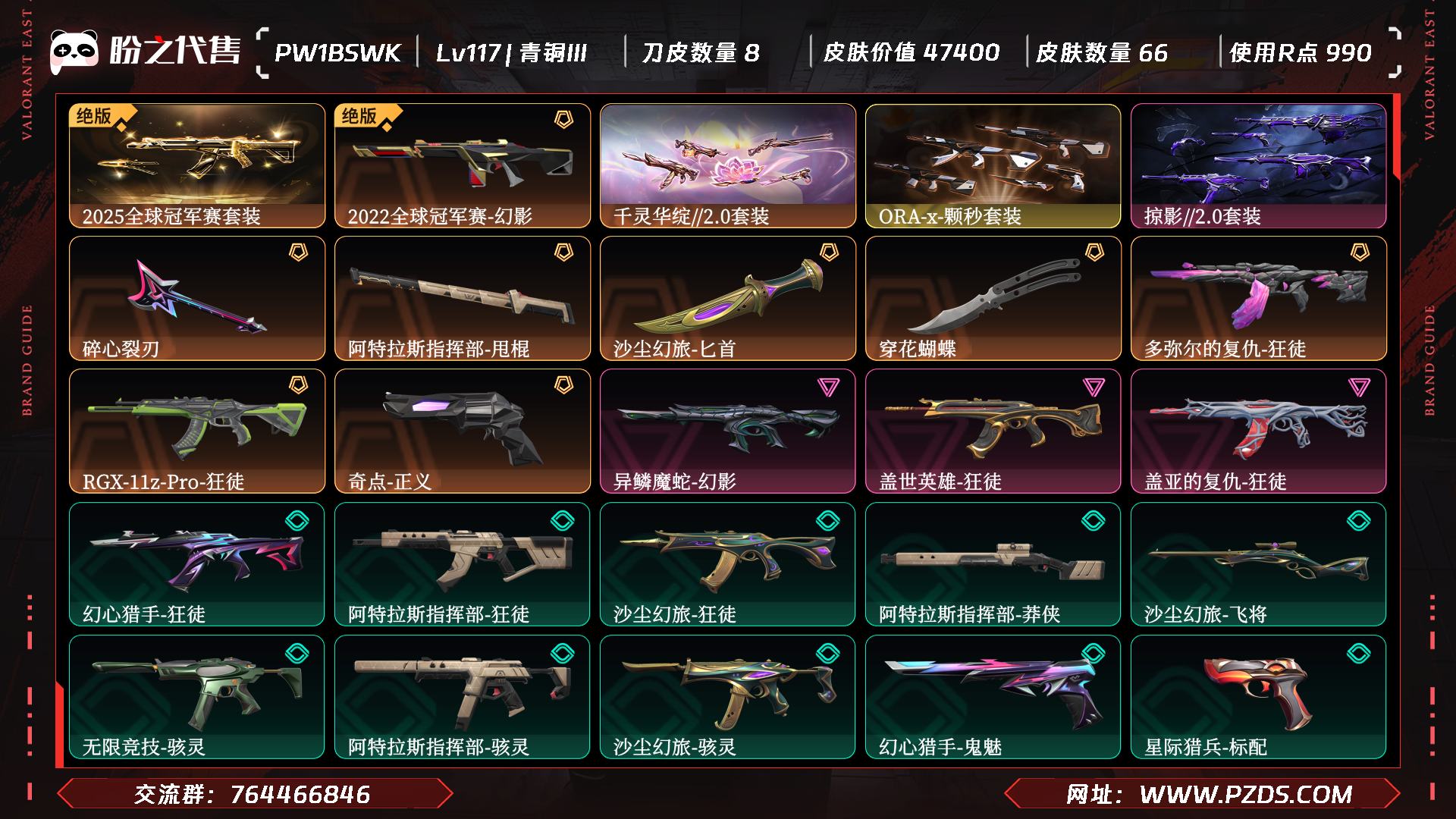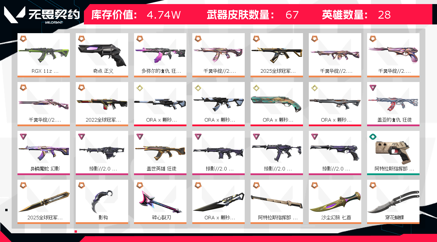 【皮肤资产价值】47400 【使用R点】990 【英雄数量】28 【皮肤数量】66 【卡面数量】97 【喷漆数量】85 【挂件数量】76 【拥有套装】ORA-x-颗秒套装(ORA-x-颗秒-狂徒,ORA-x-颗秒-幻影,ORA-x-颗秒-冥驹,ORA-x-颗秒-正义,ORA-x-颗秒-军刀)掠影//2.0套装(掠影//2.0-幻影,掠影//2.0-奥丁,掠影//2.0-骇灵,掠影//2.0-鬼魅,影钩)千灵华绽//2.0套装(千灵华绽//2.0-狂徒,千灵华绽//2.0-战神,千灵华绽//2.0-莽侠,千灵华绽//2.0-鬼魅,流风回雪)2025全球冠军赛套装(2025全球冠军赛-狂徒,2025全球冠军赛-蝴蝶刀 ) 【拥有近战武器】碎心裂刃,阿特拉斯指挥部-甩棍,沙尘幻旅-匕首,穿花蝴蝶, 【拥有步枪】多弥尔的复仇-狂徒,2022全球冠军赛-幻影,RGX-11z-Pro-狂徒,异鳞魔蛇-幻影,盖世英雄-狂徒,盖亚的复仇-狂徒,幻心猎手-狂徒,阿特拉斯指挥部-狂徒,沙尘幻旅-狂徒,甜心猎手-幻影,诛心猎手-獠犬,甜心猎手-戍卫,悠闲猫生-獠犬,太空穿梭-戍卫,悠闲猫生-幻影,萌彩剪影-戍卫,胡桃狂想-獠犬, 【拥有狙击枪】阿特拉斯指挥部-莽侠,沙尘幻旅-飞将,诛心猎手-冥驹,甜心猎手-莽侠,悠闲猫生-飞将,胡桃狂想-冥驹, 【拥有机枪】诛心猎手-奥丁,太空穿梭-战神,萌彩剪影-战神, 【拥有冲锋枪】无限竞技-骇灵,阿特拉斯指挥部-骇灵,沙尘幻旅-骇灵,甜心猎手-蜂刺,胡桃狂想-蜂刺, 【拥有霰弹枪】太空穿梭-判官,萌彩剪影-判官, 【拥有手枪】奇点-正义,幻心猎手-鬼魅,星际猎兵-标配,阿特拉斯指挥部-标配,超能偶像-标配,沙尘幻旅-正义,甜心猎手-短炮,诛心猎手-正义,太空穿梭-正义,悠闲猫生-短炮,萌彩剪影-狂怒,胡桃狂想-鬼魅, 【稀有挂件】千灵华绽20挂饰,晴空飞猪挂饰,无畏契约GO卷捷风挂饰,无畏契约GO卷零挂饰,V25第六幕青铜挂饰,第九季黄金挂饰,袖珍捷风挂饰,糖葫芦挂饰,迷你浓缩挂饰,第八季黄金挂饰,第七季白银挂饰, 【卡面信息】月光灵狐卡面,千灵华绽20卡面,万圣夜卡面,我见识过的恐惧卡面,势不可挡捷风卡面,我眼中的世界卡面;盖亚的复仇 狂徒,异鳞魔蛇 幻影,RGX 11z Pro 狂徒,奇点 正义,