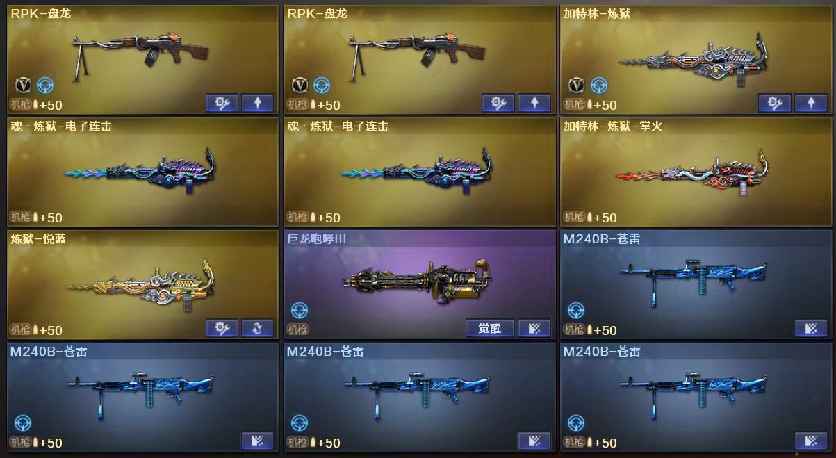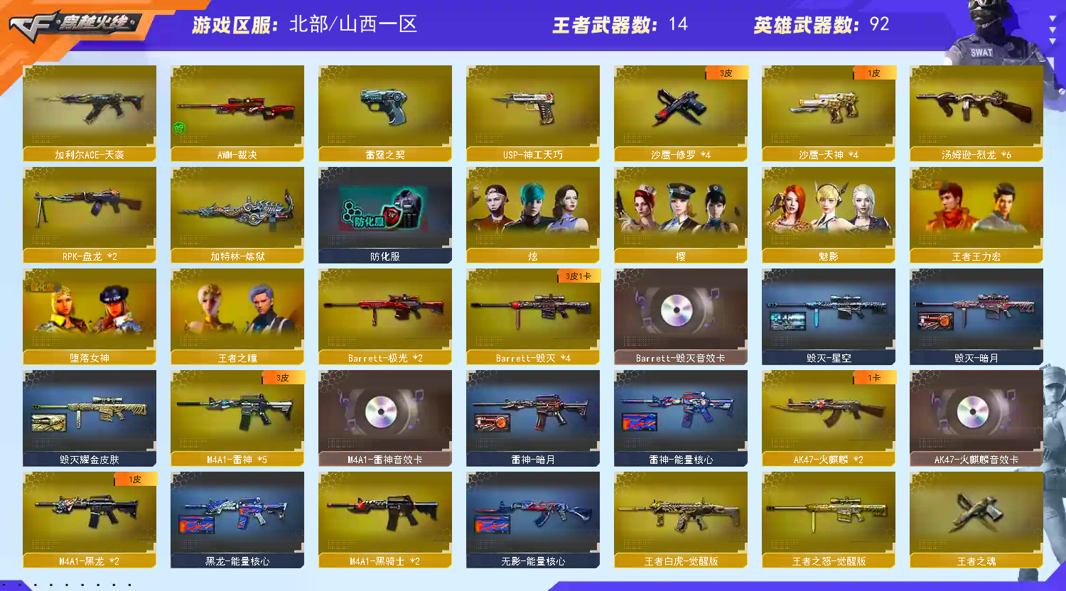 王者武器:王者白虎-觉醒版;王者之怒-觉醒版;炫金修罗;炫金火麒麟;王者之翼;王者之武;王者之锋;王者之魄-觉醒版;王者之光;王者之锋-觉醒版;炫金天龙;炫金黑龙;炫金雷神;王者之魂;炼狱-悦蓝;烈龙-悦心 英雄武器:COP雷霆无影-神兵利器;AK47-黑鲨;AN94-超新星;Barrett-暗月传说;AK-47-猩红传说;雷霆之契;M4A1-雷霆;高爆手雷-雷霆;烟雾弹-雷霆;闪光弹-雷霆;雷霆之锋;M4A1-雷神;M4A1-黑龙;Barrett-毁灭;Barrett-极光;屠龙;沙鹰-天神;9A91-烈火;麒麟刺;AK47-无影;M4A1-死神;AK12-天启;M4A1-千变;M4A1-玫瑰精灵;M4A1-黑骑士;AK47-麒麟;RPK-盘龙;龙啸;汤姆逊-烈龙;M4A1-猎神;AWM-裁决;AK47-黑武士;加特林-炼狱;沙鹰-修罗;AK47-火麒麟;擎天;AWM-天龙 角色:樱;魅影;炫;猎狐者;飞虎队;刀锋;潘多拉;黑鹰;曼陀罗;幻影;雷霆-β;白狼;波塞冬;复仇者;堕天使;活力灵狐;兰;G.E.M.邓紫棋;王者之瞳;夜玫瑰;威锋;娜塔莎;救世复仇;救世主;灵狐者;烈锋;;RPK-盘龙,加利尔ACE-天袭,