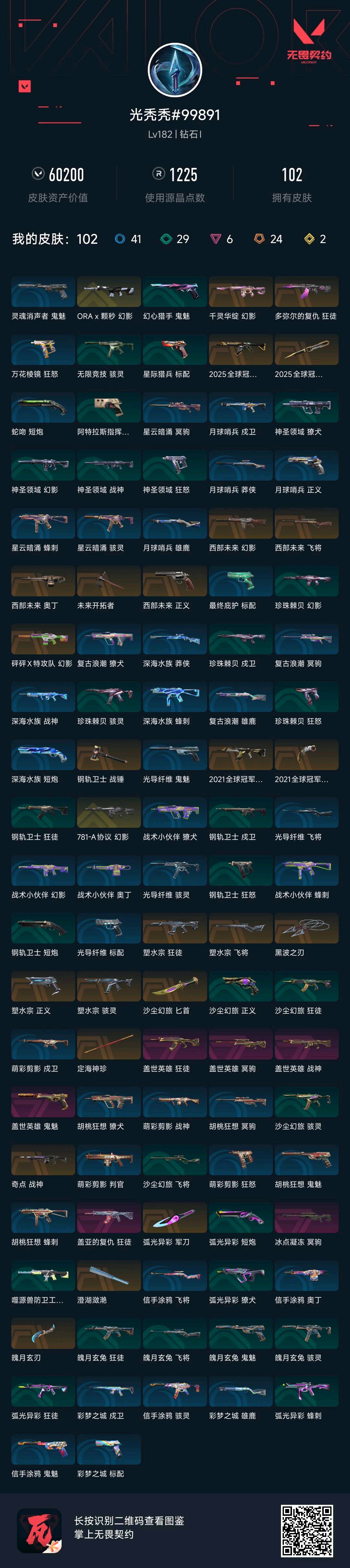 英雄28 武器皮肤数量102;西部未来 奥丁,奇点 战神,黑波之刃,盖亚的复仇 狂徒,塑水宗 狂徒,2021全球冠军赛 狂徒,塑水宗 飞将,