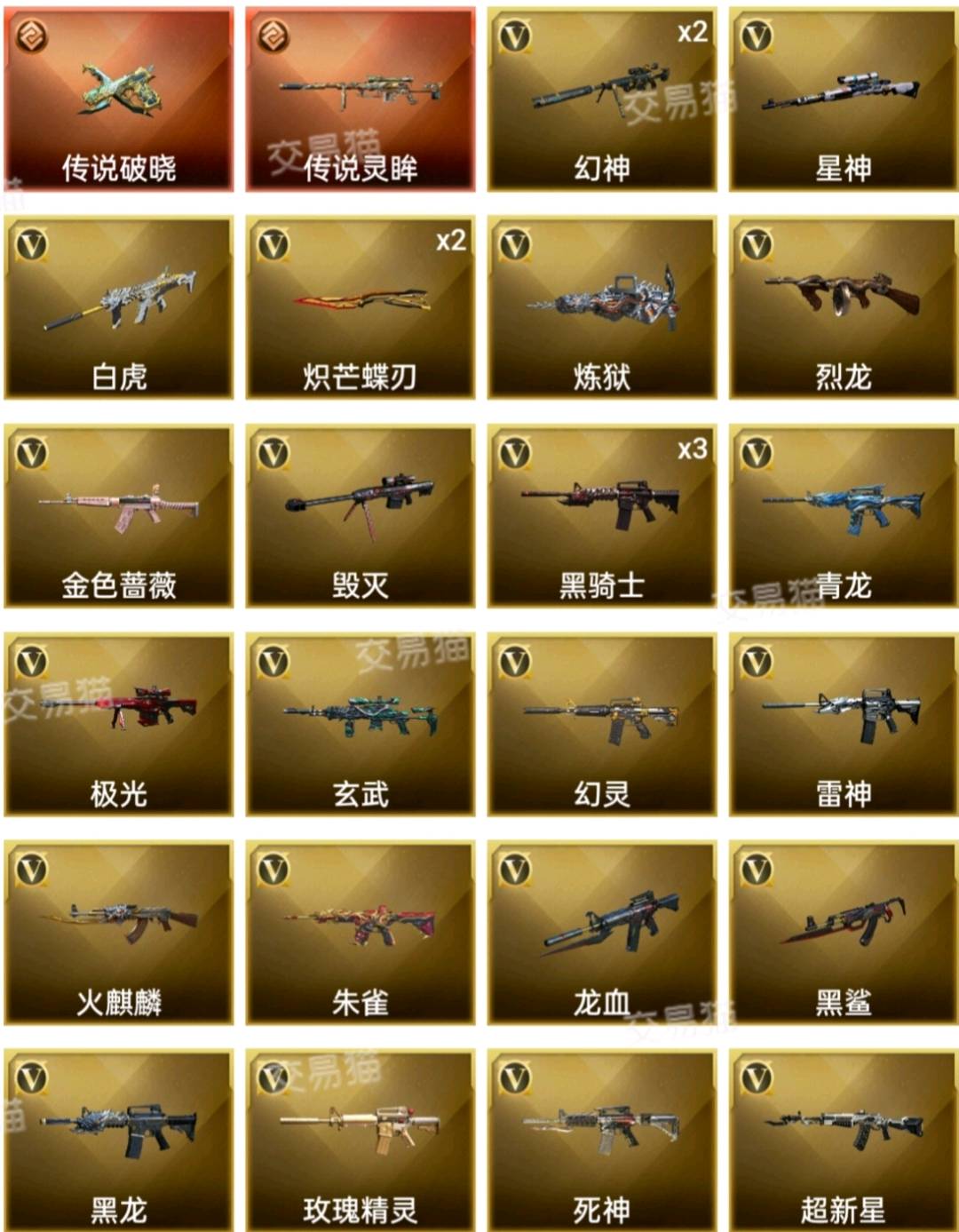 传说灵眸/幻神三件套/星神三件套/白虎三件套/毁灭三件套/雷神三件套/黑骑士三件套/;炽芒蝶刃,QBZ03-金色蔷薇,M200-幻神,Scar Light-白虎,传说灵眸,Kar98K-星神,