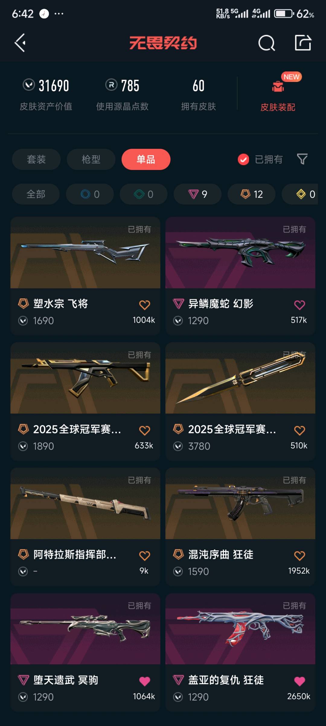 ✨ 皮肤资产价值31690,坐拥60款优质皮肤,含奇点2.0蝴蝶刀、2025全球冠军赛套、混沌序曲狂徒等热门典藏/紫色品质皮肤,具体珍稀皮肤如下: - 近战:奇点//2.0蝴蝶刀、2025全球冠军赛近战武器、日耀风暴遗器 ​ - 步枪/狙击:混沌序曲狂徒、盖亚的复仇狂徒、洪荒怒焰狂徒、2025全球冠军赛步枪、塑水宗飞将、盖世英雄冥驹、堕天遗武冥驹等 ​ - 手枪:紫阙金琅标配、耀鳞威龙鬼魅、西部未来正义 📌 账号优势 1. 典藏/紫色品质皮肤占比高,热门武器皮肤全覆盖 ​ 2. 无封禁记录,账号状态良好,登录流畅 ​ 3. 可体验2025全球冠军赛限定、奇点2.0等稀缺皮肤 💡 租赁说明 - 支持按时/按天租赁,价格实惠,可小刀 ​ - 租前沟通确认上线时间,保证独享体验 ​ - 禁止开挂、毁号等违规操作,违者追责;盖亚的复仇 狂徒,虚空遗器 狂徒,洪荒怒焰 狂徒,异鳞魔蛇 幻影,侦察力量 幻影,混沌序曲 狂徒,塑水宗 飞将,