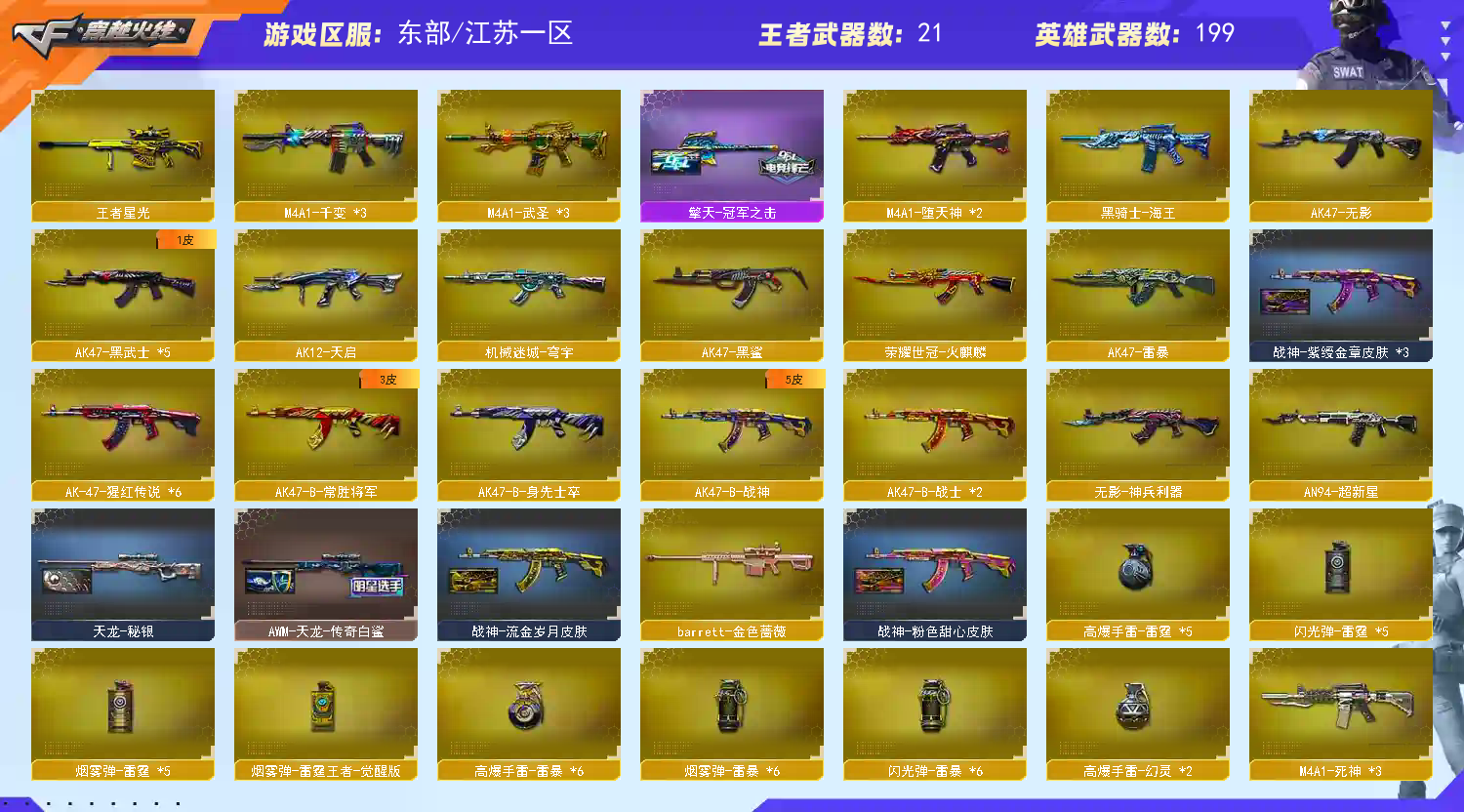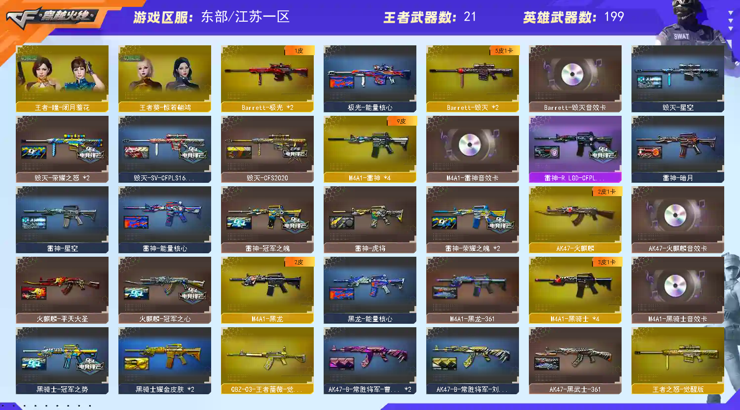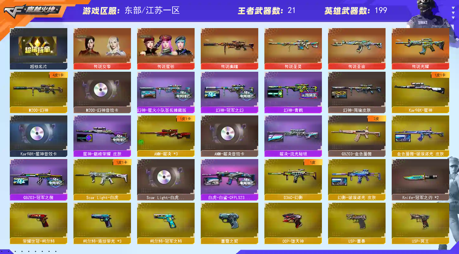 四防女帝星骇泡泡象✅六传说幻神4皮带卡星神三件套裁决三件套白虎三件套✅幻影✅6烈龙蝴蝶6盘龙炼狱泡泡象✅蝴蝶刀X3✅冠军之刃X3✅USP冥王冠军之特USP雷暴✅4把柯尔特 稀有传说幽瞳/传说圣谕/传说圣灵/传说光耀/G36C幻影/M200幻神/98K星神/USP冥王/柯尔特冠军之特/USP雷暴/柯尔特竞技荣光X3/荣耀世冠柯尔特/COP357雷霆/COP堕天神 稀有6烈龙斯泰尔蝴蝶/6盘龙加特林炼狱/炼狱泡泡象奇幻宇宙万象/5黑骑士白虎挑战无敌/M4A1堕天神X2/AK47雷暴/MAC10千针棘鲨/黄金猫猫手套白鲨//炽芒蝶刃X3/Knife冠军之刃X2 稀有传说女帝(爆破四防)/传说星骇(生化四防/捕食者之眼/佣兵觉醒/生化背包变更)/星际战将/电竞教官云悠悠/灵狐者职业经理(爆破四防)/职业选手(绝迹语音包)/炫/新海豹突击队/空 王者迷迭香(爆破四防)/王者葵貂蝉(爆破四防)/王者春(爆破四防)/王者魅影(爆破四防)/王者玲珑小乔(爆破四防)/王者葵惊若翩鸿(爆破四防)/王者瞳闭月羞花/EP战队炫彩背包/KZ战队炫彩背包/鲨鲨水溅跃背包 幻神音效卡/星神音效卡/白虎音效卡/裁决音效卡/雷神音效卡/毁灭音效卡/火麒麟音效卡/黑骑士音效卡/雷霆套装/雷暴套装/堕天神套装/幻灵套装/竞技荣光套装/玄豹套装/机械猎手幻灵猎姬 幻神星火小队签名臻藏版皮肤冠军之幻皮肤周瑜皮肤青鹤皮肤/星神巅峰荣耀皮肤/裁决流光秘银皮肤/幻影破浪逐光皮肤/雷神冠军之魄皮肤荣耀之魄皮肤R.LGD-CFPLS18冠军皮肤虎将皮肤星空皮肤 QBZ03冠军之薇皮肤破浪逐光皮肤/毁灭荣耀之怒皮肤SVCFPLS16冠军皮肤CFS2018皮肤CFS2020皮肤星空皮肤/火麒麟冠军之心皮肤CFS2018皮肤AG战队皮肤平天大圣皮肤/白虎白鲨CFPLS23冠军皮肤 黑骑士冠军之势皮肤耀金皮肤白马银枪皮肤/炼狱星空皮肤/天龙传奇白鲨皮肤/黑武士361皮肤/黑龙361皮肤/屠龙星耀皮肤荣耀之锋皮肤破浪逐光皮肤/擎天冠军之击皮肤/炽芒蝶刃冠军炽芒皮肤破浪逐光皮肤 QBZ03王者蔷薇觉醒/王者星光觉醒/王者之心觉醒/王者之幻觉醒/王者之戮觉醒/王者之魄觉醒/王者之势觉醒/王者之烈觉醒/王者之力觉醒/王者之怒觉醒/王者之锋觉醒X2/王者之击觉醒X2/王者之啸觉醒 王者之魄高爆手雷/王者之魄闪光弹X3/烟雾弹雷霆王者觉醒/炼狱悦蓝觉醒/炫金天龙X2/炫金骑士X3/炫金武士/荣耀世冠火麒麟/荣耀世冠龙啸/M4A1雷神精英刀锋/CAT猫猫枪/M37葵/COP旗袍/巴雷特零水下丽影 冰龙粉碎者白马银枪/机甲撕裂者3/激光毁灭者3/巨龙咆哮/神圣爆裂者3/阐释者3/QBZ03吕布/胡萝卜匕首/龙鳞/猫猫手套/手斧镜X2/屠龙秘银/迷你生化手雷 14个背包/最高荣誉元帅/CFVIP6/安全分100分/各种道具几百天到永久不等;USP-雷暴,荣耀世冠-柯尔特,柯尔特-冠军之特,炽芒蝶刃,Knife-冠军之刃,传说星骇,传说女帝,