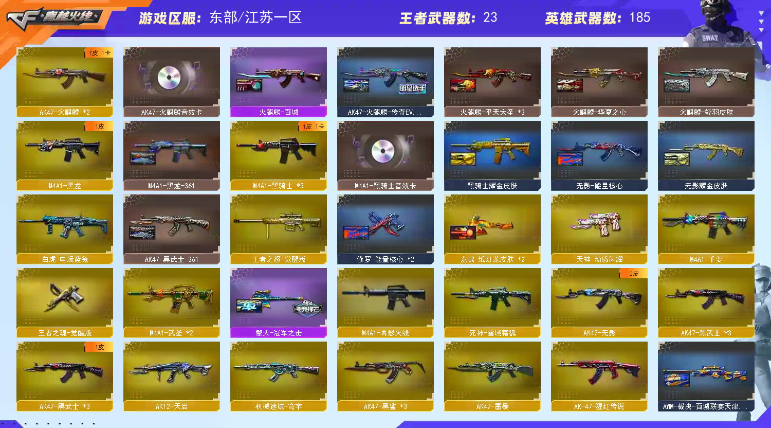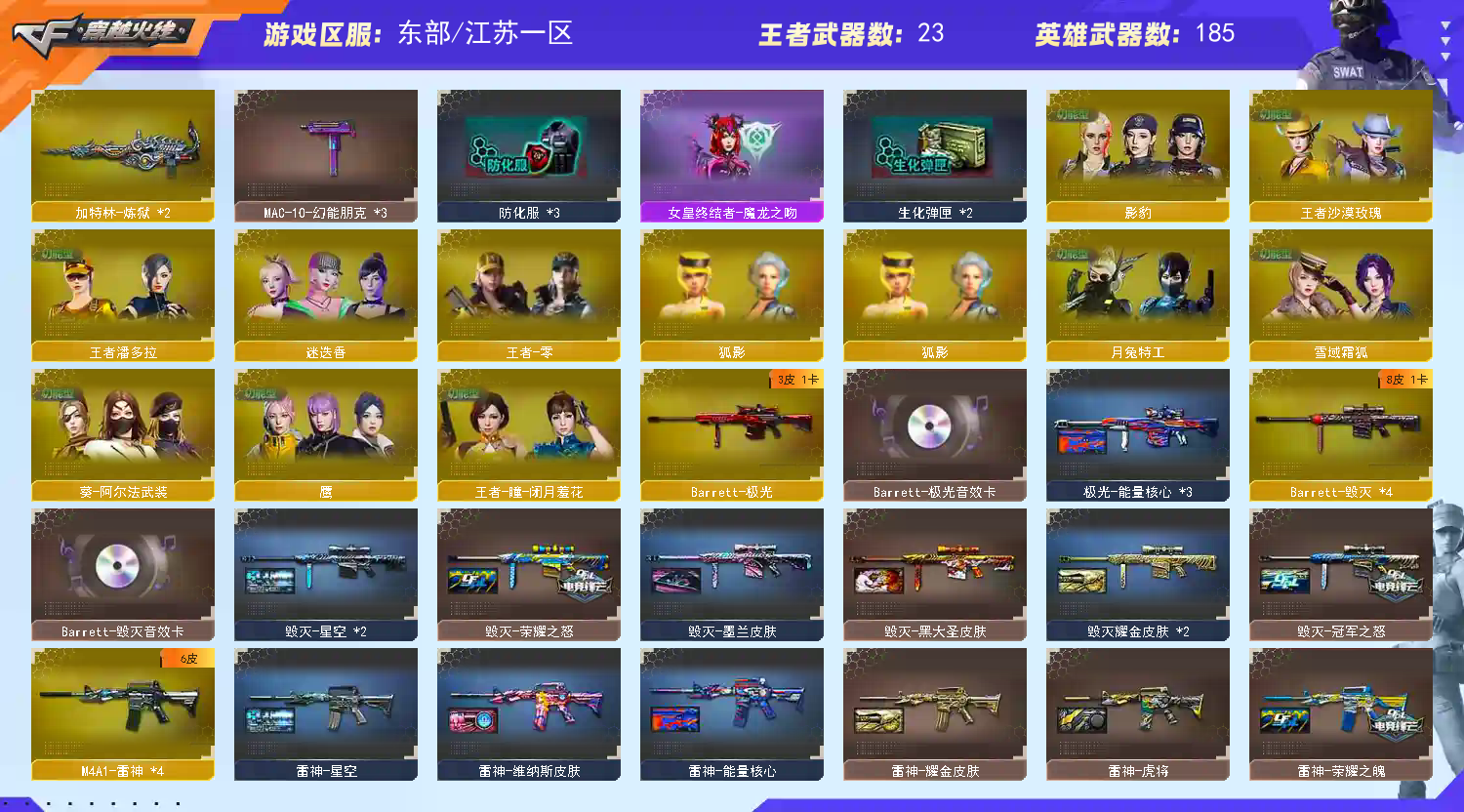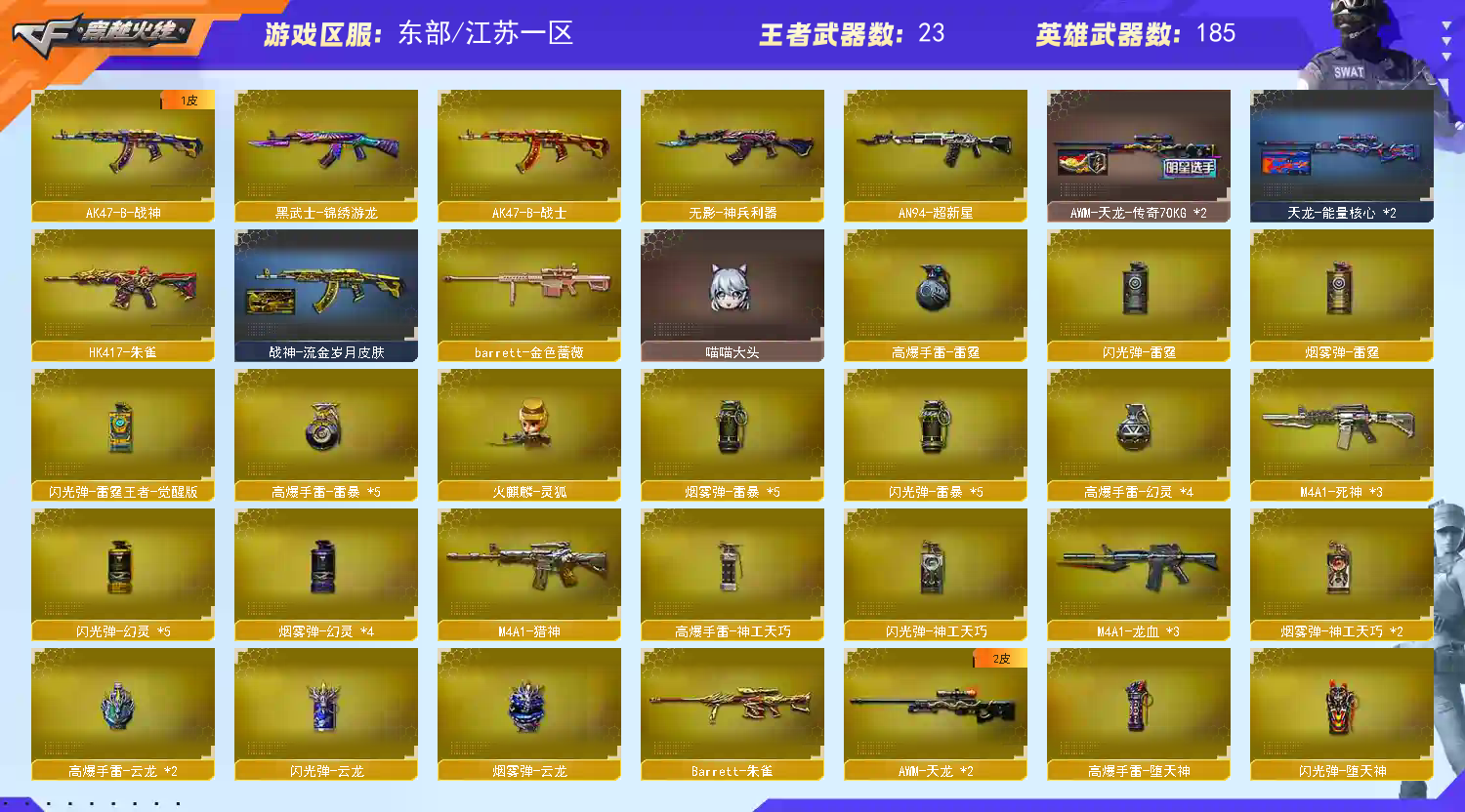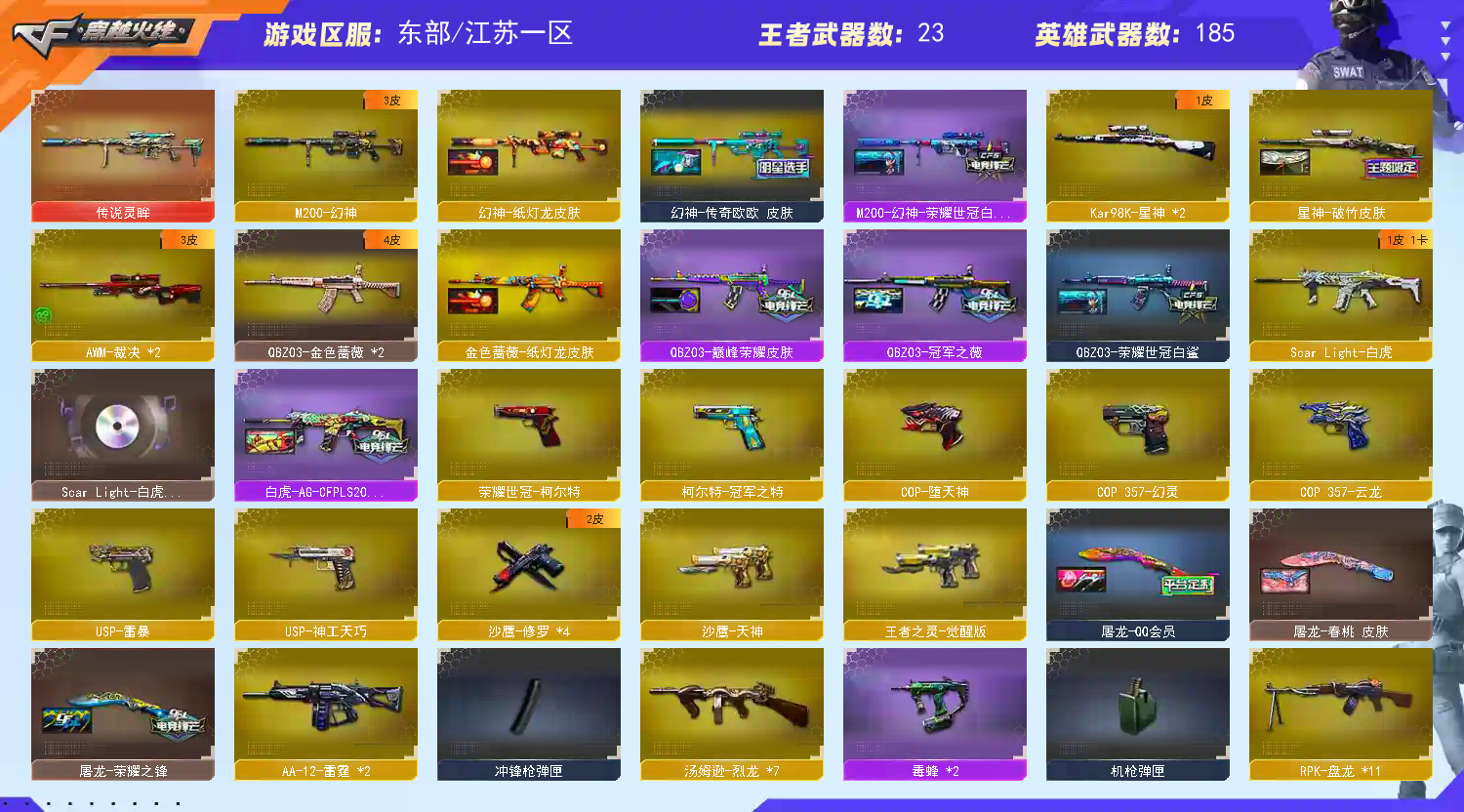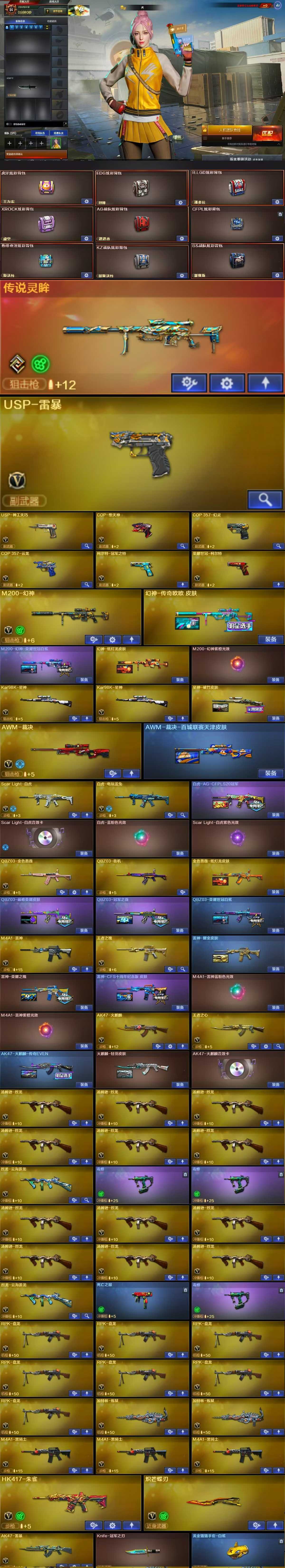 传说灵眸✅幻神三皮肤✅星神破竹✅QBZ四皮肤雷神十周年✅7烈龙毒蜂7盘龙炼狱✅炽芒蝶刃✅冠军之刃✅黄金鲨臂✅USP雷暴✅冠军之特✅2把COP✅生化爆破全能号 传说灵眸/M200幻神/98K星神X2/7烈龙斯泰尔毒蜂/7盘龙加特林炼狱/Scar白虎/USP雷暴/柯尔特冠军之特/USP神工天巧/COP357云龙/荣耀世冠柯尔特/COP357幻灵/炽芒蝶刃/冠军之刃/黄金猫猫手套白鲨/HK417朱雀/Barrett朱雀/COP白鲨 鹰/影豹/月兔特工(生化四防/捕食者之眼/佣兵觉醒/生化背包变更/生化觉醒)/迷迭香/王者潘多拉(爆破四防)/王者沙漠玫瑰(生化四防)/王者瞳闭月羞花/狐影/幽/职业选手/雅典娜/五号兵器赛博朋克/钢铁终结者溟灭之柱/女皇终结者魔龙之吻/救世主黑桃战神 白虎音效卡/火麒麟音效卡/毁灭音效卡/极光音效卡/黑骑士音效卡/死神雪域霜狐音效卡/天神动感闪耀音效卡/AG战队炫彩背包/BS战队炫彩背包/CFPLS炫彩背包/EDG炫彩背包/KZ战队炫彩背包/R.LGD炫彩背包/XROCK炫彩背包/CFS限定背包/虎牙炫彩背包 幻神传奇欧欧皮肤荣耀世冠白鲨皮肤纸灯笼皮肤/QBZ03冠军之薇皮肤巅峰荣耀皮肤荣耀世冠白鲨皮肤纸灯笼皮肤/白虎AGCFPLS20冠军皮肤/雷神CFS十周年纪念版皮肤荣耀之魄皮肤白鲨CFPLS14冠军皮肤虎将皮肤星空皮肤耀金皮肤维纳斯皮肤神秘按键皮肤 星神破竹皮肤/裁决百城联赛天津皮肤/火麒麟传奇EVEN皮肤华夏之心皮肤AG战队皮肤CFS2018皮肤轻羽皮肤百城皮肤平天大圣皮肤/毁灭荣耀之怒皮肤冠军之怒皮肤CFS2018皮肤AGCFPLS15冠军皮肤星空皮肤耀金皮肤黑大圣皮肤墨兰皮肤英雄计划皮肤虹光风暴皮肤 炼狱电子连击皮肤/烈龙星空皮肤/无影耀金皮肤/千变孔明皮肤/黑龙361皮肤/天龙传奇70KG皮肤/黑武士361皮肤/龙啸纸灯笼皮肤/擎天冠军之击皮肤/屠龙荣耀之锋皮肤春桃皮肤惊鸿皮肤/麒麟刺荣耀世冠白鲨皮肤 王者之心觉醒/王者之幻觉醒/王者之魄觉醒/王者之势觉醒/王者之武觉醒/王者之光觉醒/王者之怒觉醒/王者之魂觉醒/王者之灵觉醒/王者之锋觉醒/王者之击觉醒/高爆手雷雷霆王者觉醒/闪光弹雷霆王者觉醒/超新星悦享/炫金毁灭/炫金武士/白虎电玩蓝兔 HK417朱雀蛇隐踪/M4A1雷神精英刀锋/火麒麟灵狐/冰龙粉碎者白马银枪/激光毁灭者3/激光毁灭者3白马银枪/KAC青曜/KAC圣炎切割者3/巨龙咆哮3/VEPR12金魔/神圣爆裂者末日3/神圣堡垒这3蛇姬/神圣爆裂者3/巡航者/金色小号/COP旗袍/MAC10幻能朋克 CFPLS19赛季荣耀之证/胡萝卜匕首/猫猫手套/龙鳞/手斧镜/屠龙秘银/招财猫枪王排位/迷你生化手雷/雷霆套装/雷暴套装/堕天神套装/幻灵套装/夜魔套装/云龙套装/神工天巧套装 14个背包/最高荣誉元帅/CFVIP6/安全分100分/各种道具几百天到永久不等;USP-雷暴,荣耀世冠-柯尔特,柯尔特-冠军之特,炽芒蝶刃,Knife-冠军之刃,王者沙漠玫瑰,RPK-盘龙,