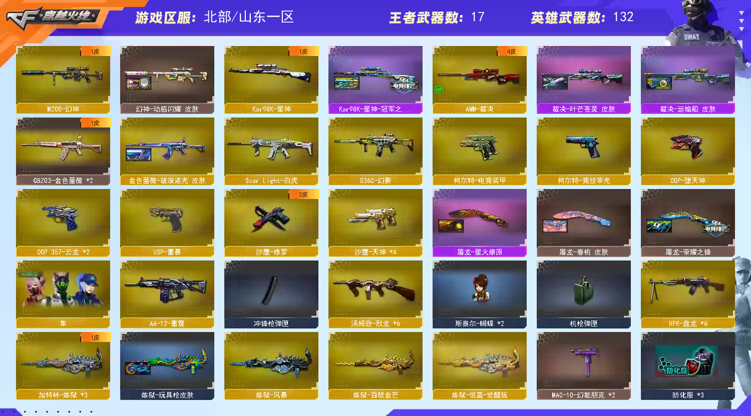 百V号,战场、排位、爆破、生化、挑战全模式通用,装备直接看截图,登录游戏查看更多,战场+10满卡满钻。;USP-雷暴,隼,电竞教官-云悠悠,RPK-盘龙,QBZ03-金色蔷薇,G36C-幻影,M200-幻神,