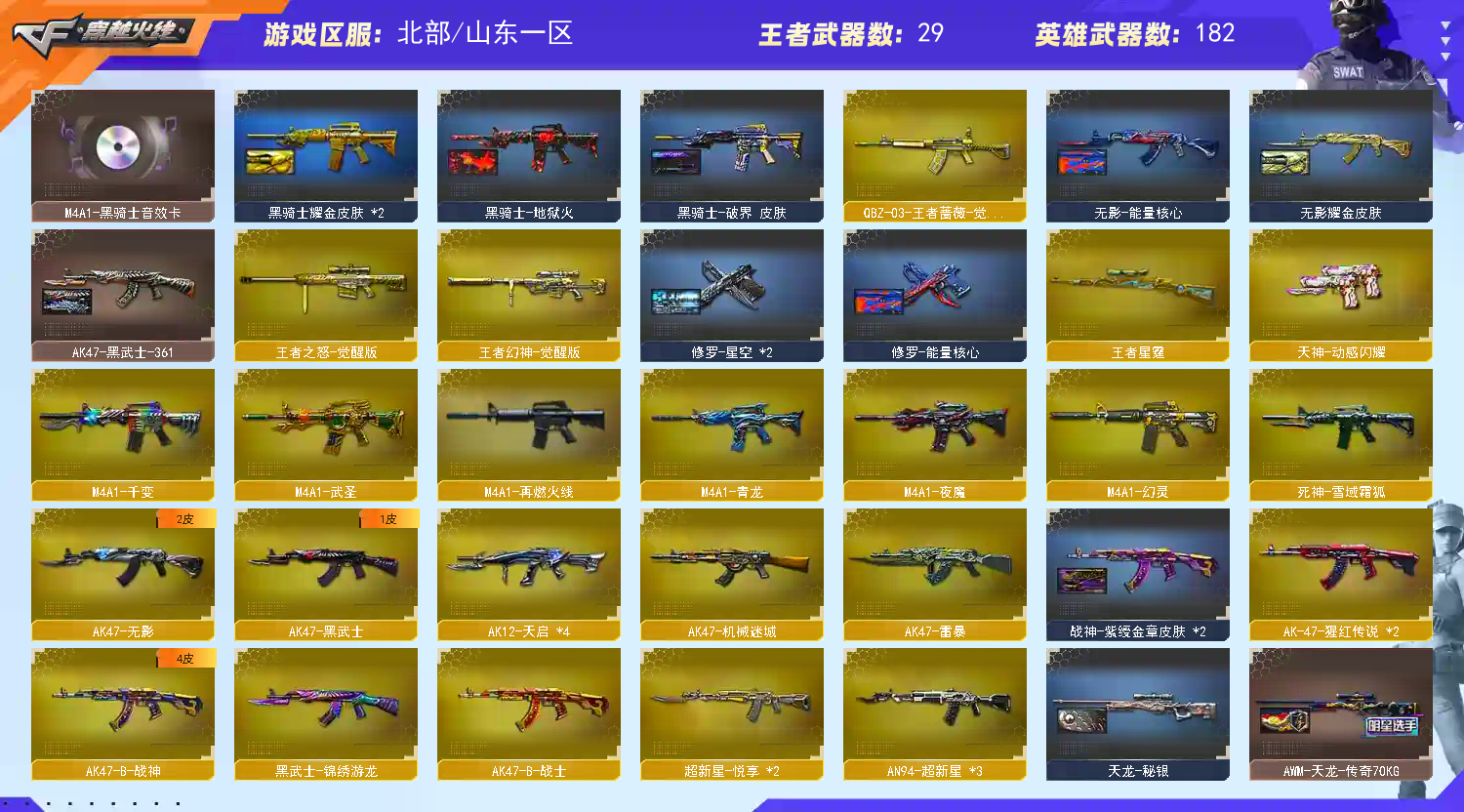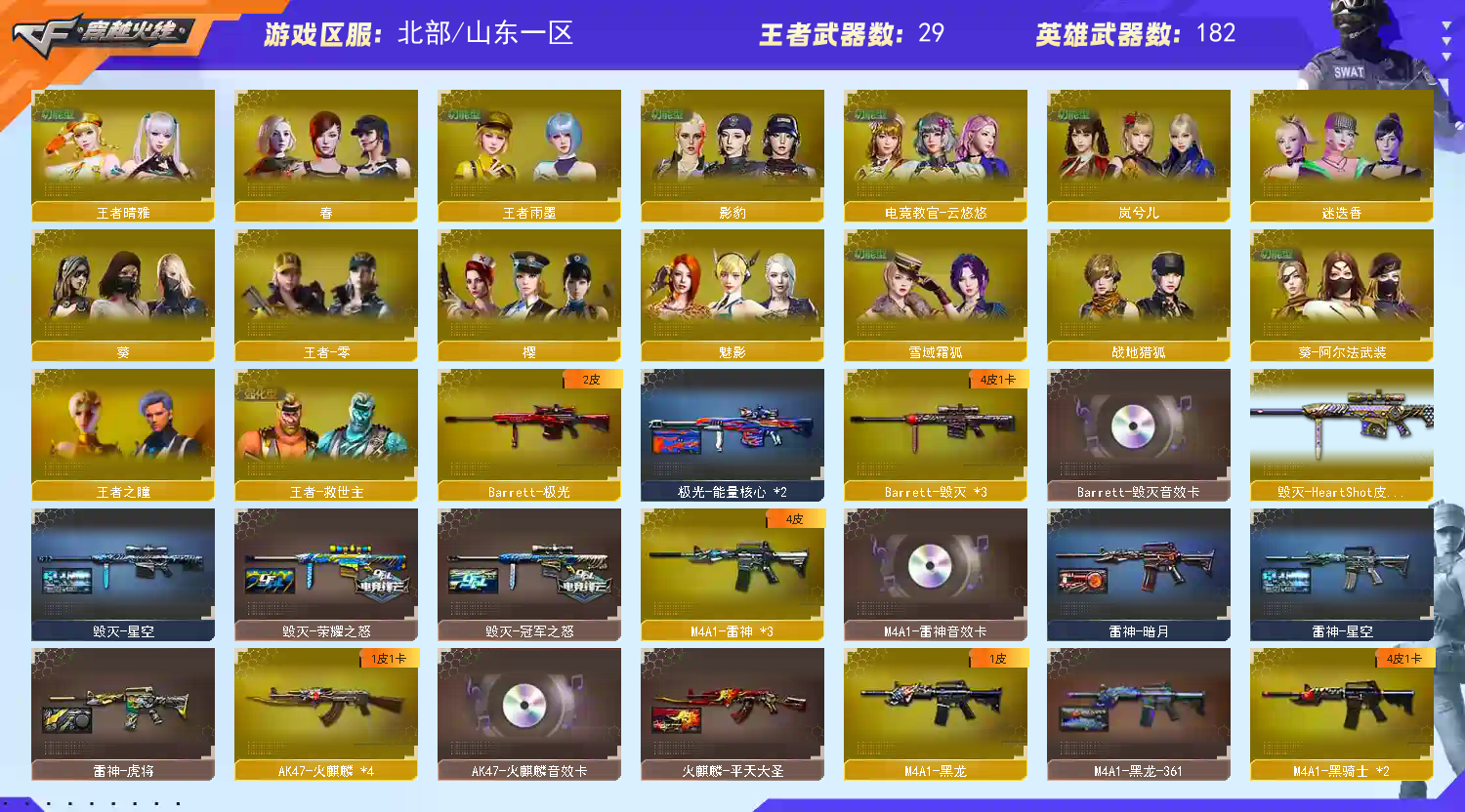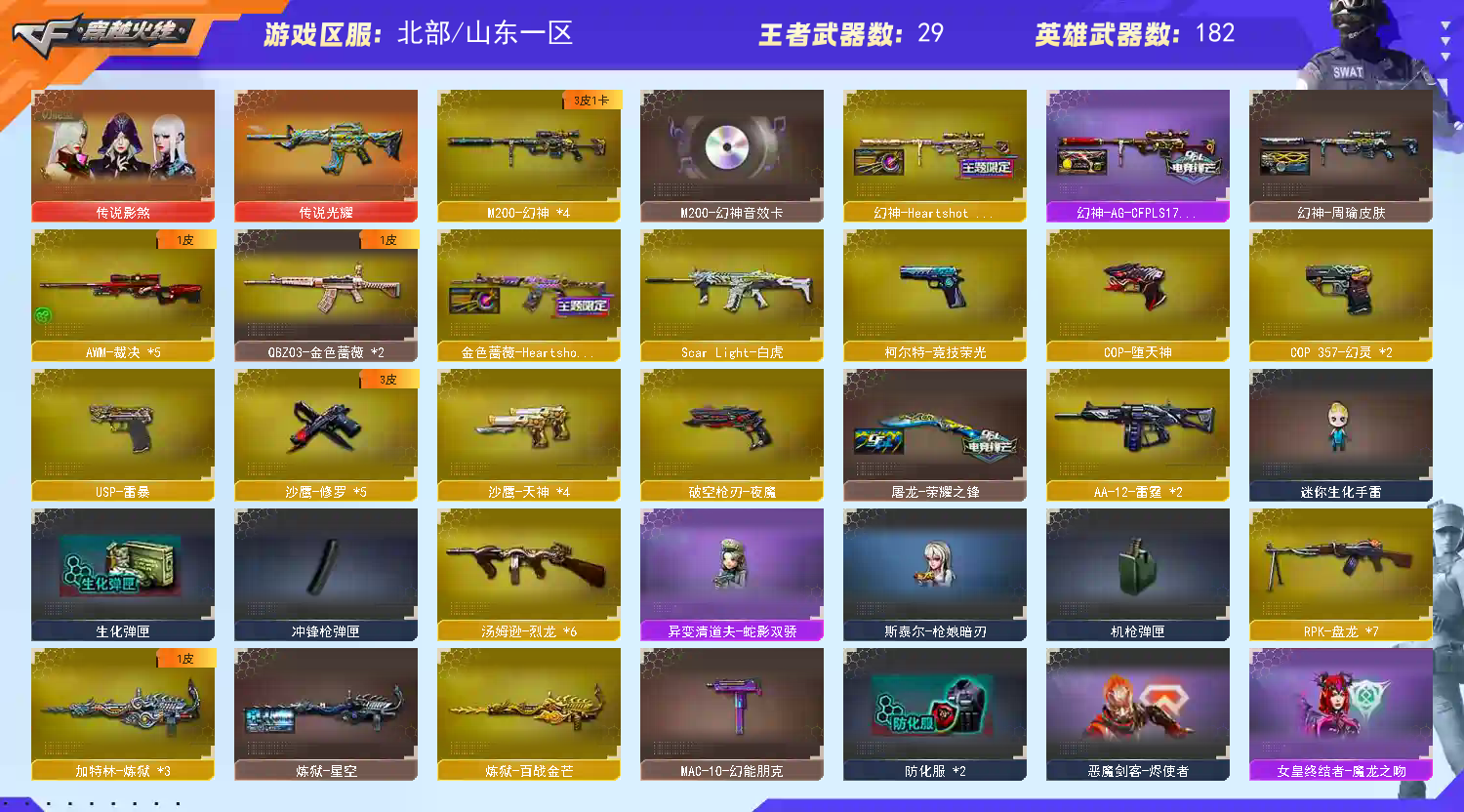 四防影煞✅幻神3质量皮带音效卡✅王者星霆王者幻神✅6烈龙蝴蝶清道夫6盘龙炼狱✅USP雷暴✅3把COP✅王者晴雅✅王者雨墨✅生化爆破全装号 稀有传说光耀/M200幻神X4(HeartShot皮肤+AGCFPLS17冠军皮肤+周瑜皮肤+音效卡)/王者星霆/王者幻神/USP雷暴/柯尔特电竞装甲/COP357幻灵X2/COP堕天神/破空枪刃夜魔 稀有6烈龙斯泰尔蝴蝶/异变清道夫蛇影双骄/7盘龙加特林炼狱/Scar白虎/M4A1夜魔/M4A1幻灵/M4A1青龙/AK47雷暴/Barrett朱雀/金色小号/火麒麟零纪元/雷神小红/M4A1雷神精英刀锋//天龙曼陀罗 稀有传说影煞(生化四防/捕食者之眼/佣兵觉醒/生化背包变更)/王者晴雅(爆破四防)/王者雨墨(生化四防)/影豹(爆破四防)/电竞教官云悠悠/岚兮儿/迷迭香/春/魅影/新海豹突击队/灵狐者职业经理/雅典娜/空 幻神音效卡/毁灭音效卡/雷神音效卡/火麒麟音效卡/黑骑士音效卡/炼狱百战金芒庆典舞曲音效卡/碧霄极光音效卡/昌龙怀旧音效卡/死神雪域霜狐音效卡/雷暴套装/夜魔套装/幻灵套装/竞技荣光套装/云龙套装 幻神HeartShot皮肤AGCFPLS17冠军皮肤周瑜皮肤/毁灭HeartShot皮肤冠军之怒皮肤荣耀之怒皮肤星空皮肤/雷神白鲨CFPLS14冠军皮肤虎将皮肤星空皮肤源计划2.0专属皮肤/黑骑士地狱火皮肤耀金皮肤破界皮肤 金色蔷薇HeartShot皮肤/火麒麟AG战队皮肤平天大圣皮肤/无影耀金皮肤/千变孔明皮肤/天龙传奇白鲨皮肤传奇70KG皮肤/黑武士361皮肤/黑龙361皮肤/炼狱星空皮肤/修罗星空皮肤/屠龙荣耀之锋皮肤/龙啸蛇姬皮肤 王者幻神觉醒/王者星霆觉醒/QBZ03王者蔷薇觉醒/王者火魄觉醒/王者雷怒觉醒/王者炎心觉醒/王者之心觉醒/王者之幻觉醒/王者之魄觉醒/王者之武觉醒/王者之力觉醒/王者之怒觉醒/王者之刺觉醒/王者之锋觉醒/ 王者之击觉醒/王者之啸觉醒/王者之势/王者之影/王者之幻X2/王者之戮/王者之武/王者之光/王者之灵/王者之锋X2/超新星悦享X2/炫金毁灭X2/炫金天龙/炫金雷神/炫金火麒麟/炫金武士X3/炫金骑士X2/炫金超新星 HK417朱雀蛇影踪/机甲撕裂者3/激光毁灭者3白马银枪/KAC圣炎切割者3/巨龙咆哮3/VEPR12金魔/神圣堡垒这末日3/神圣爆裂者3蛇姬/神圣爆裂者3/阐释者3/街机小灰机/巴雷特赏金猎人/MAC10幻能朋克/手斧镜 蝴蝶刀枪王排位/屠龙秘银/招财猫枪王排位/迷你生化手雷/女皇终结者魔龙之吻/钢铁终结者溟灭之柱/救世主黑桃战神/14个背包/最高荣誉元帅/;USP-雷暴,传说影煞,电竞教官-云悠悠,RPK-盘龙,QBZ03-金色蔷薇,M200-幻神,Scar Light-白虎,