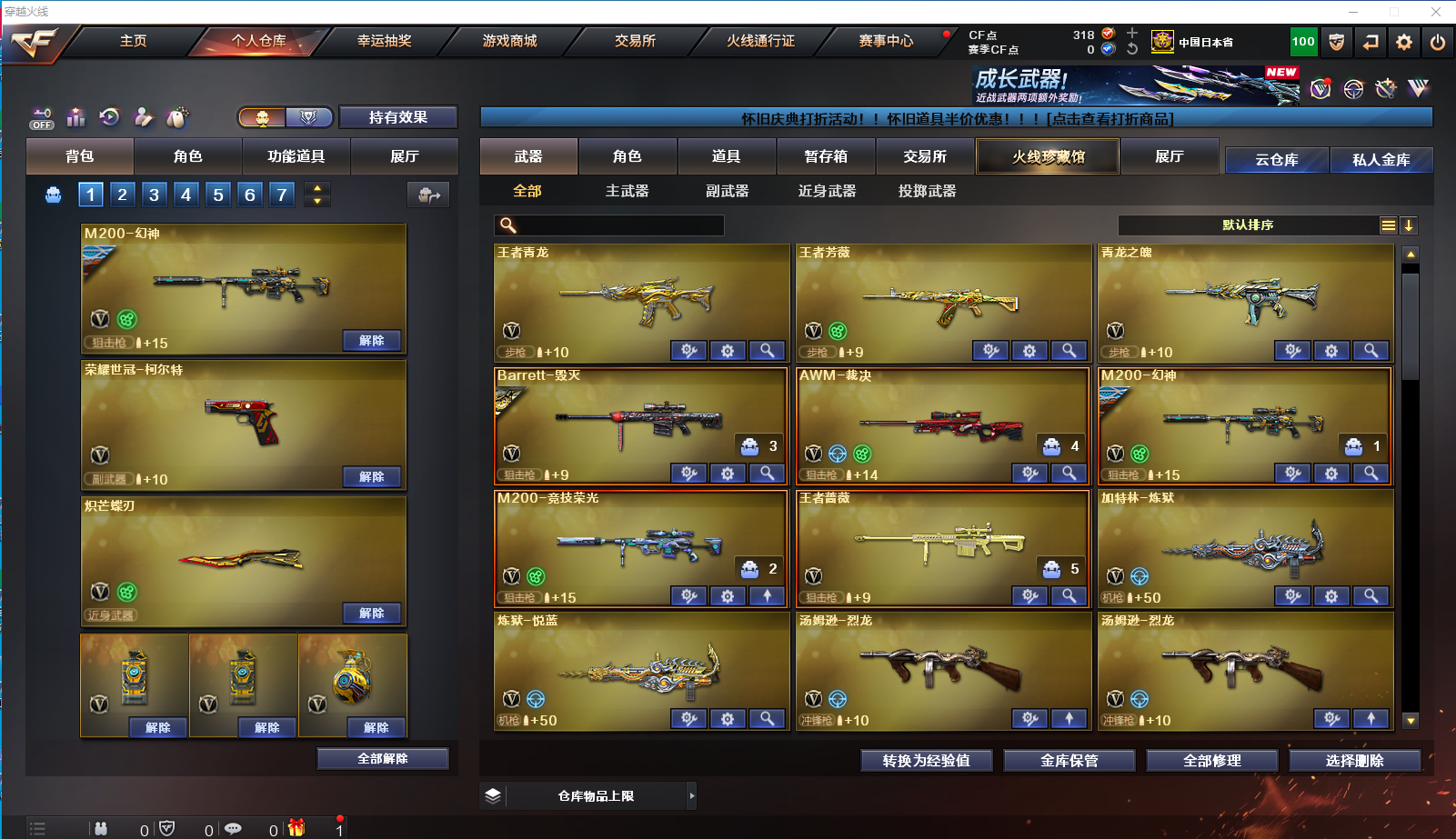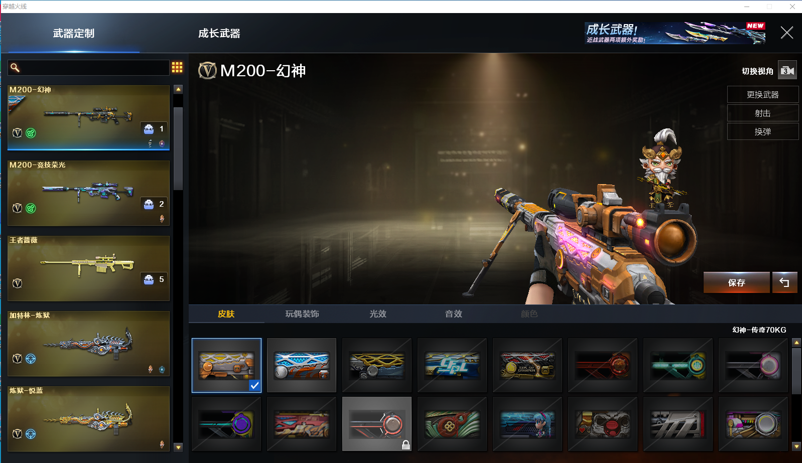 幻神+2皮肤,竞技荣光,四烈龙,斯太尔枪娘暗刃,油炸炼狱,裁决+音效卡,防弹全套,四防角色,;荣耀世冠-柯尔特,炽芒蝶刃,QBZ03-金色蔷薇,M200-幻神,Scar Light-白虎,Kar98K-星神,