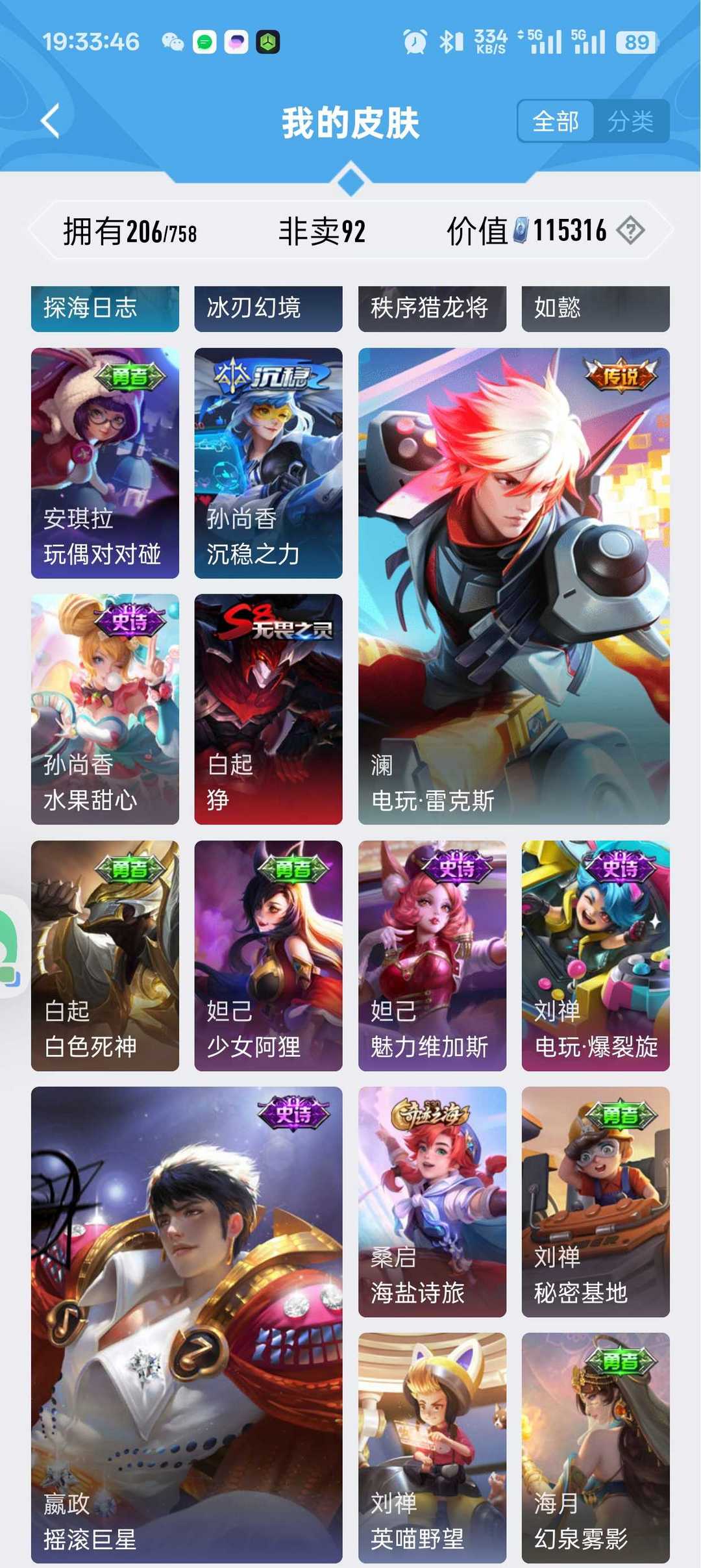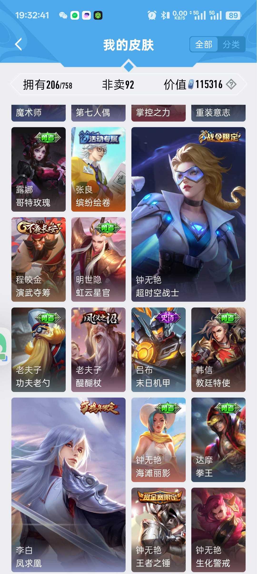 v10、12水555皮、死亡执政官、刘备星传说时之思念、小兵皮肤大耳狗甜茶、瑶无双真我赫兹、愿照·九州拓、怪盗基德、画中仙、至尊宝、凤求凰、神威、天魔缭乱