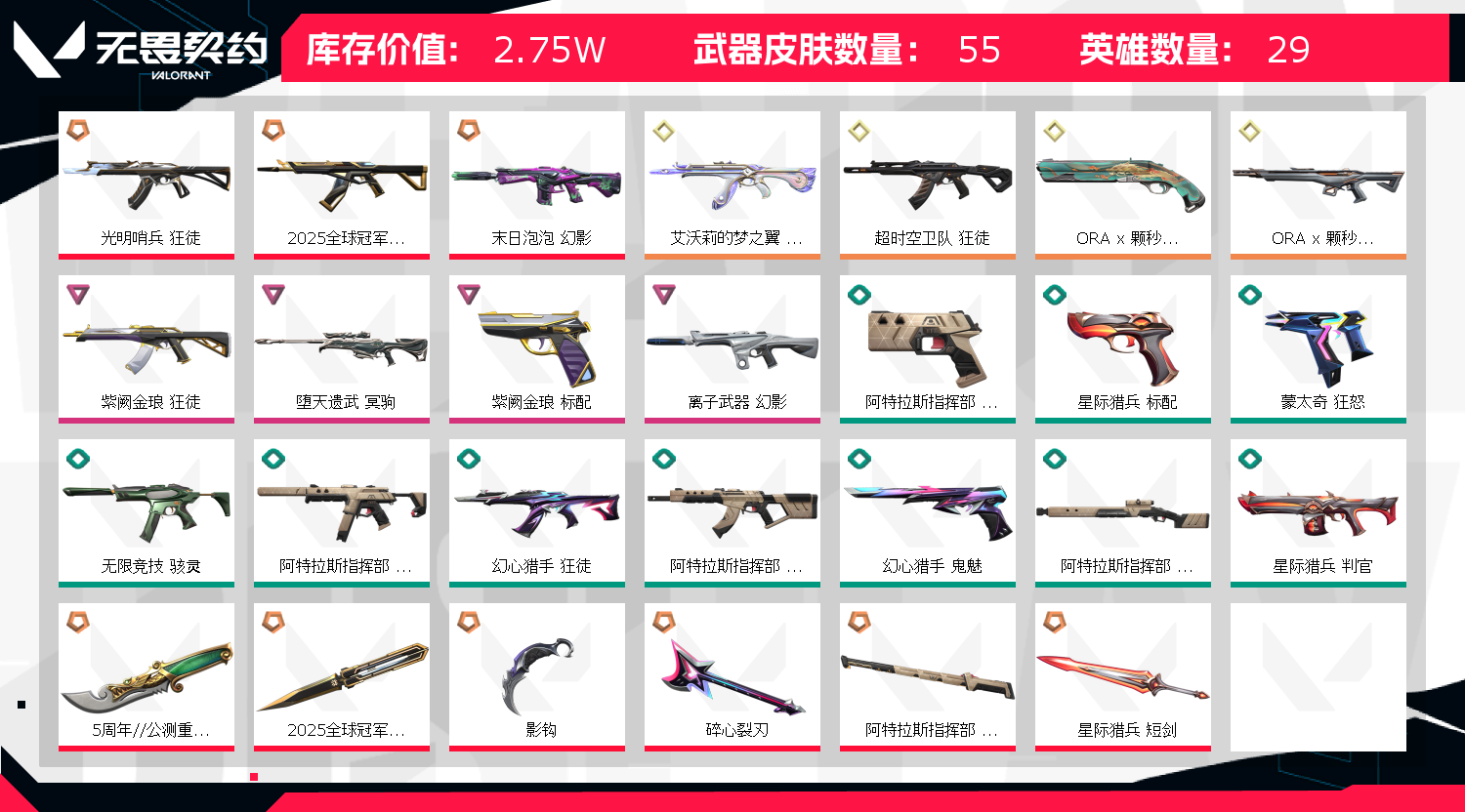 首页 > 租号大厅 > 无畏契约-wegame > wegame/wegame > 冻结秒解⚡3w库存25冠军套青龙刀⚡ak:超时空+猫猫+紫金⚡颗秒正义+幻影⚡影钩+堕天狙