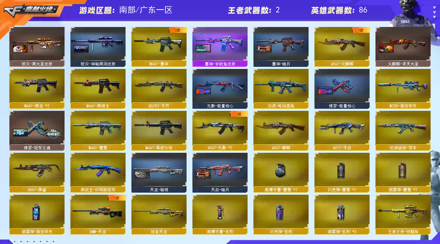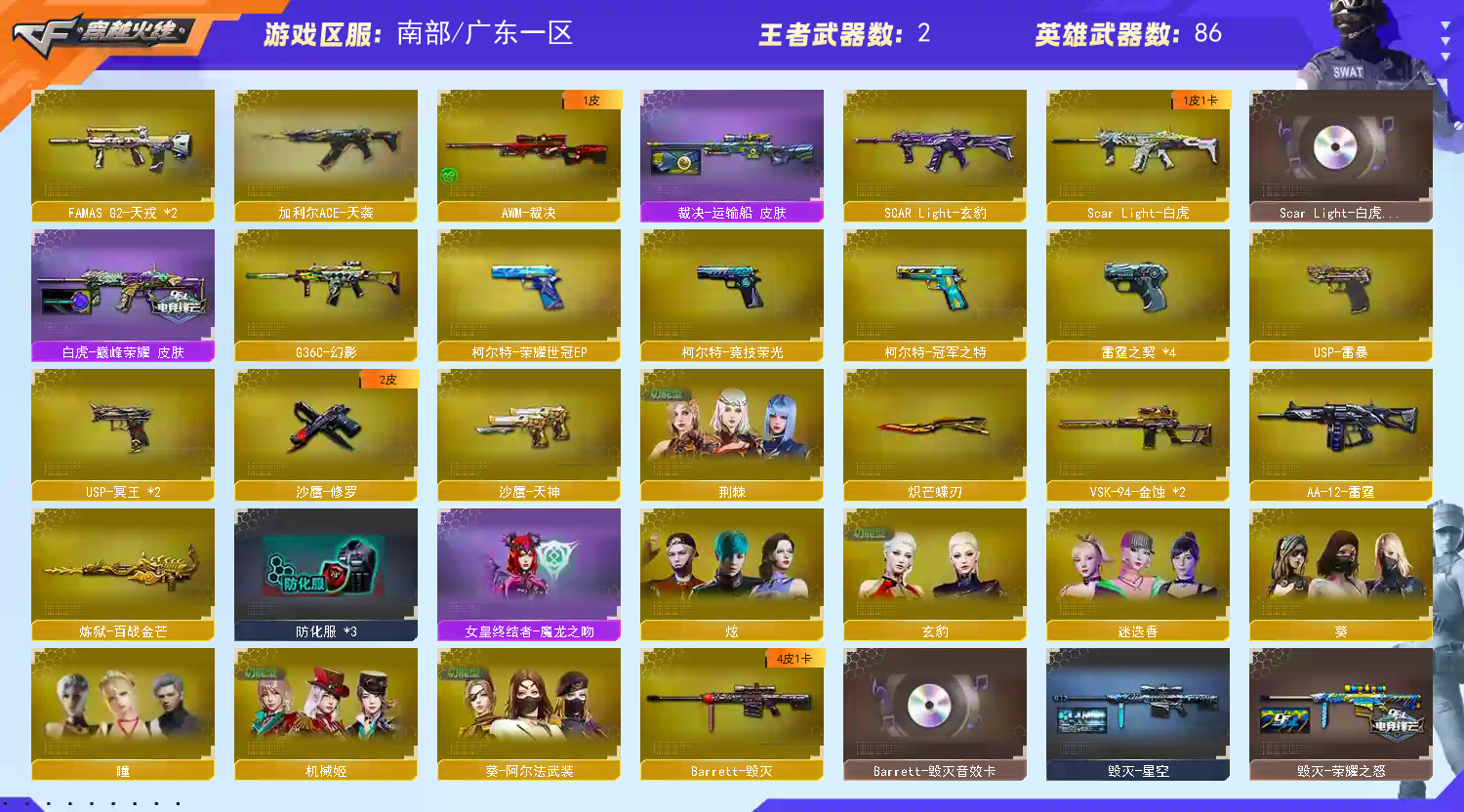 狙的比较捞一点,只有荣幻和残疾裁决,但步枪和手枪体验拉满,有音效卡的就只有毁灭天罚白虎,英雄角色都是三防只有一个职业灵狐四防,能爆破,生化和挑战也能将就用一下,防弹都有,弹匣有需要的可以用赛季cf点购买,恳请各位彭于晏吴彦祖文明游戏,不要挂机强退,愿游玩愉快😊;USP-雷暴,柯尔特-冠军之特,炽芒蝶刃,G36C-幻影,Scar Light-白虎,加利尔ACE-天袭,