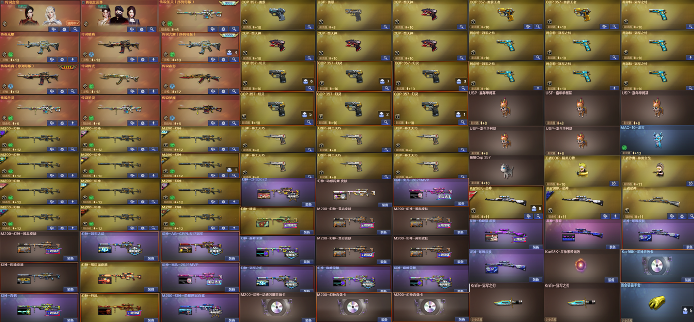 传说女帝 传说艾丽莎 ③豹子序列号 传说光耀5555 传说暗裔2222 传说圣灵3333 ⑫把幻神 ⑳幻神皮肤 ④幻神卡 ⑧冠军特 ②雷霆王者cop ⑦幻灵cop ④堕天神cop usp雷暴 ⑦神工天巧usp ②冠军之刃 柯基 猛虎 王者cat 黄金牛牛 雷神十周年臻藏皮肤 雷神主播战皮肤 六烈六盘 炼狱虎牙斗鱼皮肤满音效卡 快手qbz 冠军之薇 qbz音效卡 幻神二十皮肤幻神音效卡三张 裁决皮肤 裁决音效卡 虎牙白虎 AG白虎 白虎音效卡 蝴蝶刀(炽芒蝶刃)两把 王者玉峰四把;USP-雷暴,荣耀世冠-柯尔特,柯尔特-冠军之特,炽芒蝶刃,Knife-冠军之刃,沙漠玫瑰,传说女帝,