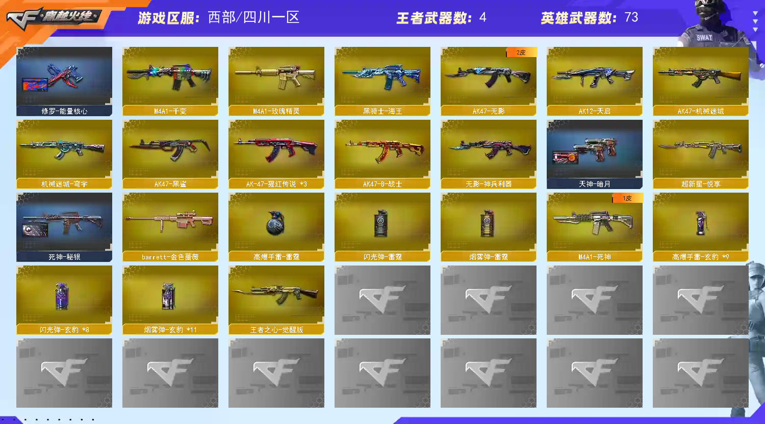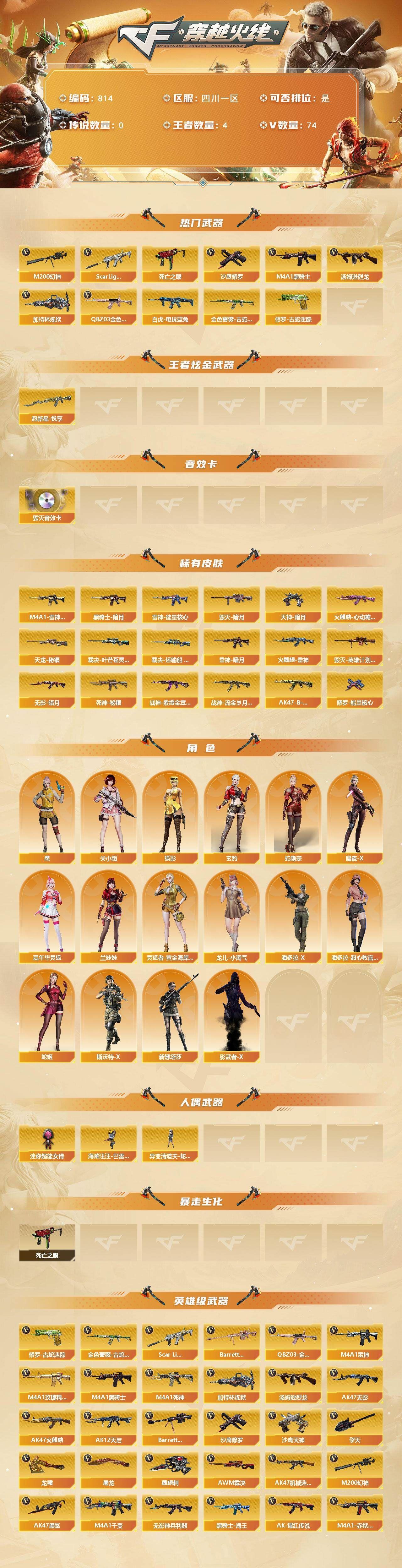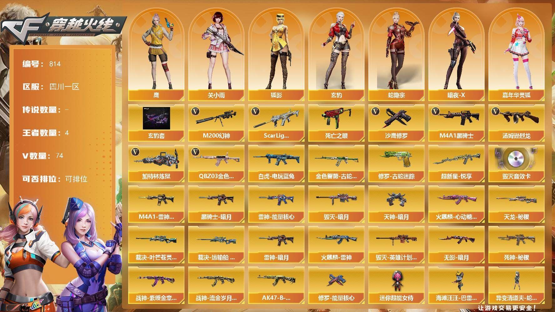 【热门武器】:M200-幻神,QBZ03-金色蔷薇,Scar Light-白虎,金色蔷薇-古蛇迷踪,修罗-古蛇迷踪,死亡之眼,白虎-电玩蓝兔,M4A1-黑骑士,汤姆逊-烈龙,加特林-炼狱,沙鹰-修罗*4【稀有套装】:玄豹套【王者炫金武器】:超新星-悦享【音效卡】:Barrett-毁灭音效卡【皮肤】:裁决-叶芒苍灵 皮肤,裁决-运输船 皮肤,雷神-暗月,雷神-能量核心,M4A1-雷神-CFS 2019,火麒麟-雷神,火麒麟-心动糖果,毁灭-暗月,毁灭-英雄计划 皮肤,黑骑士-暗月,无影-暗月*2,死神-秘银,战神-紫绶金章皮肤*2,战神-流金岁月皮肤,AK47-B-常胜将军-孙权,天龙-秘银,修罗-能量核心,天神-暗月【角色】:四防鹰,关小雨,玄豹,狐影,满配蛇隐宗,暗夜-X,嘉年华灵狐,兰妹妹,灵狐者-黄金海岸,龙儿-小淘气,潘多拉-X,潘多拉-甜心教官,蛇姬,斯沃特-X,新娜塔莎,影武者-X【人偶武器】:异变清道夫-蛇影双骄,海滩汪汪-巴雷特,迷你超能女侍【暴走生化】:死亡之眼【英雄级武器】:M4A1-千变,AK47-火麒麟*2,M4A1-雷神,M4A1-黑骑士,AK47-无影,M4A1-死神,AK12-天启,AK47-机械迷城,AK47-黑鲨,Scar Light-白虎,无影-神兵利器,金色蔷薇-古蛇迷踪,SCAR Light-玄豹,M4A1-玫瑰精灵,QBZ03-金色蔷薇,王者之心-觉醒版,AK-47-猩红传说*3,黑骑士-海王,白虎-电玩蓝兔,Barrett-毁灭,AWM-裁决,M200-幻神,Barrett-金色蔷薇,王者星神-觉醒版,加特林-炼狱,炼狱-悦蓝-觉醒版,汤姆逊-烈龙,沙鹰-修罗*4,沙鹰-天神,Anaconda-玄豹,修罗-古蛇迷踪,屠龙,龙啸,擎天,麒麟刺,丛林匕首-玄豹,高爆手雷-雷霆,高爆手雷-古蛇迷踪,高爆手雷-玄豹*9,闪光弹-雷霆,闪光弹-玄豹*8,烟雾弹-雷霆,烟雾弹-古蛇迷踪,烟雾弹-玄豹*11,M4A1-赤狱骑士【道具】:古蛇迷踪炫彩背包,战舰背包,炫彩背包,超级背包,女皇终结者-魔龙之吻,救世主-黑桃战神,妩媚妖姬,绿色巨人,灵魂忍者,变异宝贝,迷雾幽灵,夺命之镰,防化服*3,金色流光-枪王排位*2,枪王排位29赛季金色流光,古蛇迷踪特效,蛇隐宗表情,电玩兔兔表情,EP战队名片,防弹头盔*4,防弹衣*3,C4工具钳*3,手雷包*3;QBZ03-金色蔷薇,M200-幻神,Scar Light-白虎,
