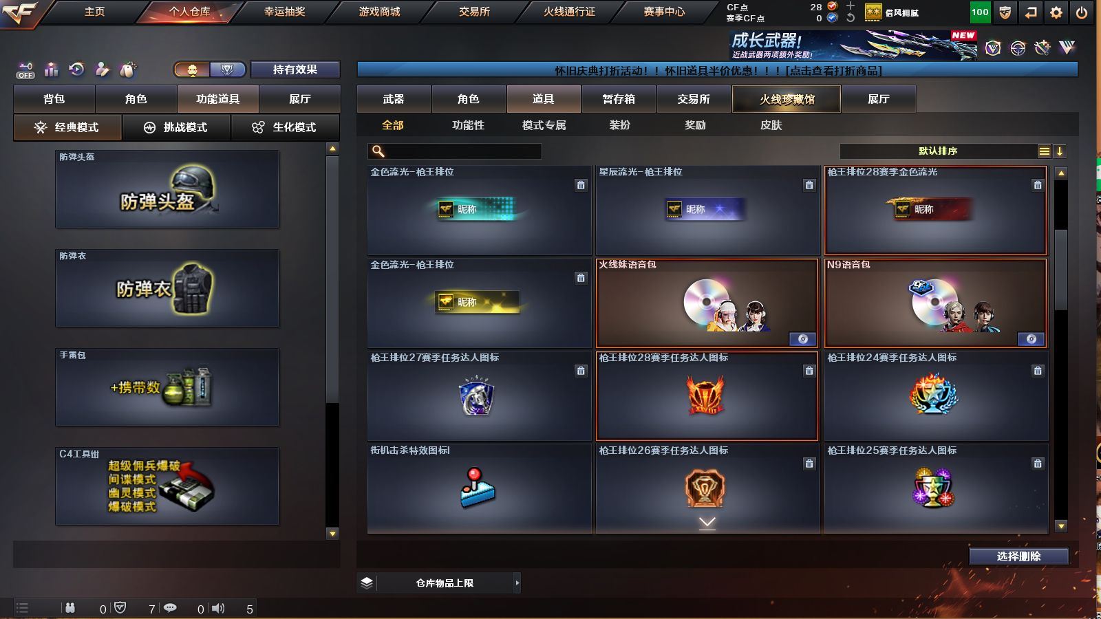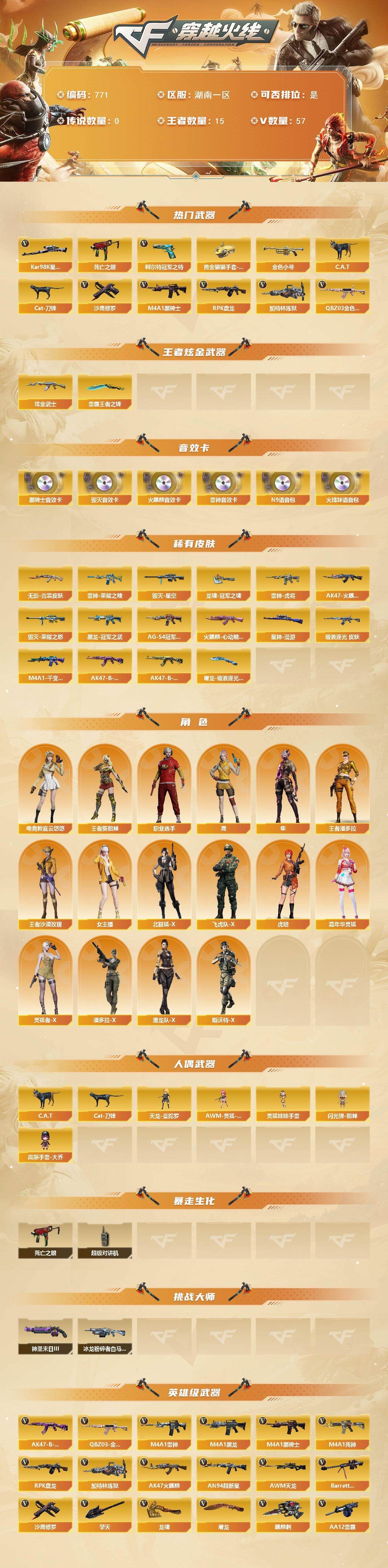 【热门武器】:QBZ03 - 金色蔷薇2,死亡之眼,柯尔特 - 冠军之特,Kar98K - 星神,金色小号,C.A.T,Cat - 刀锋,M4A1 - 黑骑士,RPK - 盘龙,加特林 - 炼狱3,沙鹰 - 修罗3,黄金猫猫手套 - 白鲨【王者炫金武器】:雷霆王者之锋,炫金武士【音效卡】:AK47 - 火麒麟音效卡,M4A1 - 雷神音效卡,M4A1 - 黑骑士音效卡,Barrett - 毁灭音效卡,N9 语音包,火线妹语音包【皮肤】:金色蔷薇 - 破浪逐光 皮肤,星神 - 漫游,雷神 - 荣耀之魄,雷神 - 虎将,AK47 - 火麒麟 - 传奇 EVEN,火麒麟 - 心动糖果,毁灭 - 荣耀之怒,毁灭 - 星空,M4A1 - 千变 - 孔明皮肤,黑龙 - 冠军之武,黑骑士 - AG-S4 冠军典藏,无影 - 霓裳皮肤,AK47-B - 常胜将军 - 曹操,AK47-B - 常胜将军 - 孙权,屠龙 - 破浪逐光 皮肤,龙啸 - 冠军之啸【角色】:电竞教官 - 云悠悠,鹰,隼,王者 - 葵 - 貂蝉,王者潘多拉,王者沙漠玫瑰,北极狐 - X,飞虎队 - X,虎妞,嘉年华灵狐,灵狐者 - X,女主播,潘多拉 - X,潜龙队 - X,斯沃特 - X,职业选手【人偶武器】:天龙 - 曼陀罗,AWM - 灵狐 - 15 周年嘉年华,C.A.T,Cat - 刀锋,闪光弹 - 貂蝉,高爆手雷 - 大乔,灵狐娃娃手雷【暴走生化】:死亡之眼,超级对讲机【挑战大师】:冰龙粉碎者 - 白马银枪,神圣爆裂者 - 末日 III【英雄级武器】:AK47 - 火麒麟2,M4A1 - 黑龙,M4A1 - 雷神3,M4A1 - 黑骑士,M4A1 - 死神,AN94 - 超新星,AK47 - 黑鲨2,QBZ03 - 天罚,无影 - 神兵利器,QBZ03 - 金色蔷薇2,M4A1 - 猎神,王者之圣 - 觉醒版,AK-47 - 猩红传说,王者之城 - 觉醒版,AK47-B - 常胜将军,王者芳薇 - 觉醒版,AWM - 天龙,Barrett - 毁灭,Kar98K - 星神,王者之光 - 觉醒版,王者风神 - 觉醒版,RPK - 盘龙,加特林 - 炼狱3,AA-12 - 雷霆,沙鹰 - 修罗3,柯尔特 - 冠军之特,柯尔特 - 电竞装甲,屠龙,龙啸,擎天2,麒麟刺,幻灵之锋,擎天 - 竞技荣光,唐刀 - 神工天巧,尼泊尔 - 电竞装甲,雷霆王者之锋 - 觉醒版,高爆手雷 - 竞技荣光,高爆手雷 - 神工天巧,闪光弹 - 竞技荣光3,闪光弹 - 神工天巧,闪光弹 - 雷霆王者 - 觉醒版,烟雾弹 - 竞技荣光,烟雾弹 - 神工天巧,烟雾弹 - 雷霆王者 - 觉醒版【道具】:全能枪王背包,炫彩背包,超级背包,黄金生化钩,绿色巨人,灵魂忍者,变异宝贝,迷雾幽灵,生化弹匣,夺命之镰,防化服2,金色流光 - 枪王排位2,星辰流光 - 枪王排位,枪王排位 28 赛季金色流光,防弹头盔5,防弹衣5,C4 工具钳3,手雷包 * 3【特殊枪械】:1 黑骑士,1 盘龙,3 炼狱;柯尔特-冠军之特,隼,电竞教官-云悠悠,王者沙漠玫瑰,RPK-盘龙,QBZ03-金色蔷薇,Kar98K-星神,