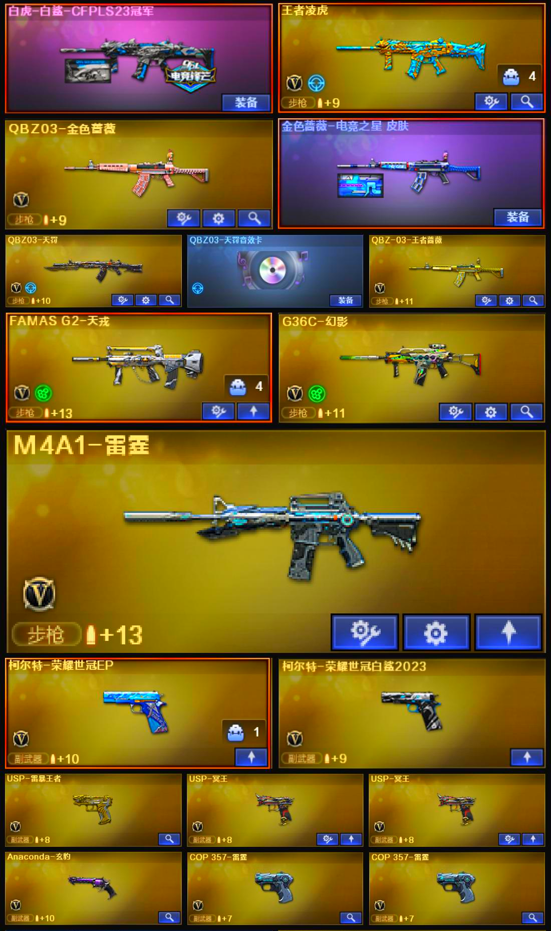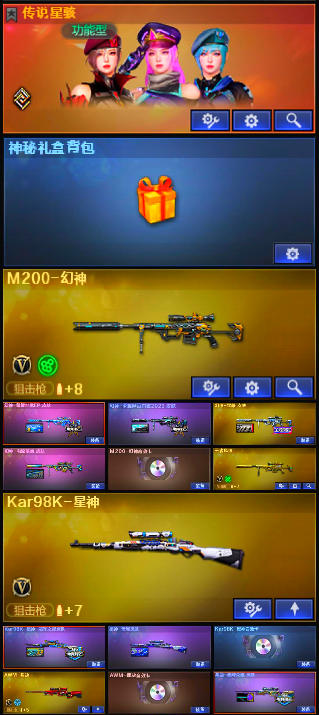 氪金天花板+星骇金色礼盒+幻神三件套+星神三件套+裁决三件套+满质量手枪+奇幻泡泡象主流满音效;USP-雷暴王者,柯尔特-荣耀世冠白鲨2023,传说星骇,隼,RPK-盘龙,QBZ03-金色蔷薇,G36C-幻影,