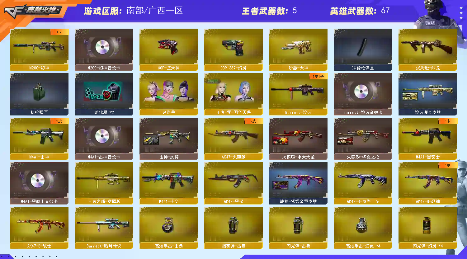 64V/100级/元帅/6王者/1英雄/M200-幻神/M4A1-黑骑士/汤姆逊-烈龙/雷神-小红/COP-堕天神/COP 357-幻灵/王者青龙/M200-幻神音效卡/M4A1-雷神音效卡/M4A1-黑骑士音效卡/-毁灭音效卡/雷神-虎将/火麒麟-雷神/火麒麟-华夏之心/火麒麟-平天大圣/毁灭耀金皮肤/战神-紫绶金章皮肤/迷迭香/王者-零-国色天香/初恋灵狐/芳心审判者/风暴女/嘉年华灵狐;M200-幻神,