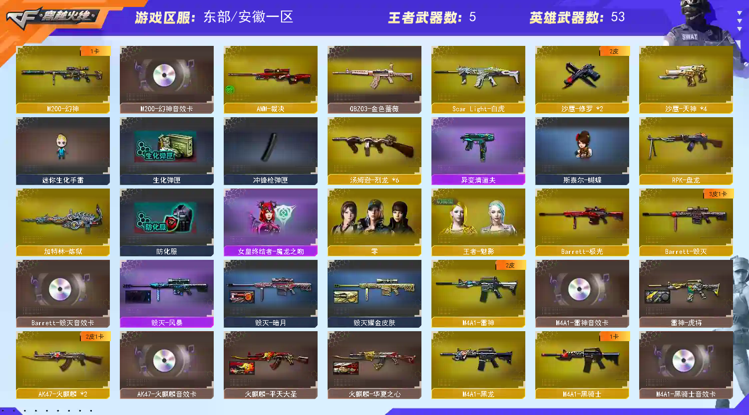 66V排位全套,生化全套,6烈加蝴蝶斯太尔,幻神加音效卡,外加王者之魄,王者之怒,王者之锋,王者之幻,王者之心等等;RPK-盘龙,QBZ03-金色蔷薇,M200-幻神,Scar Light-白虎,