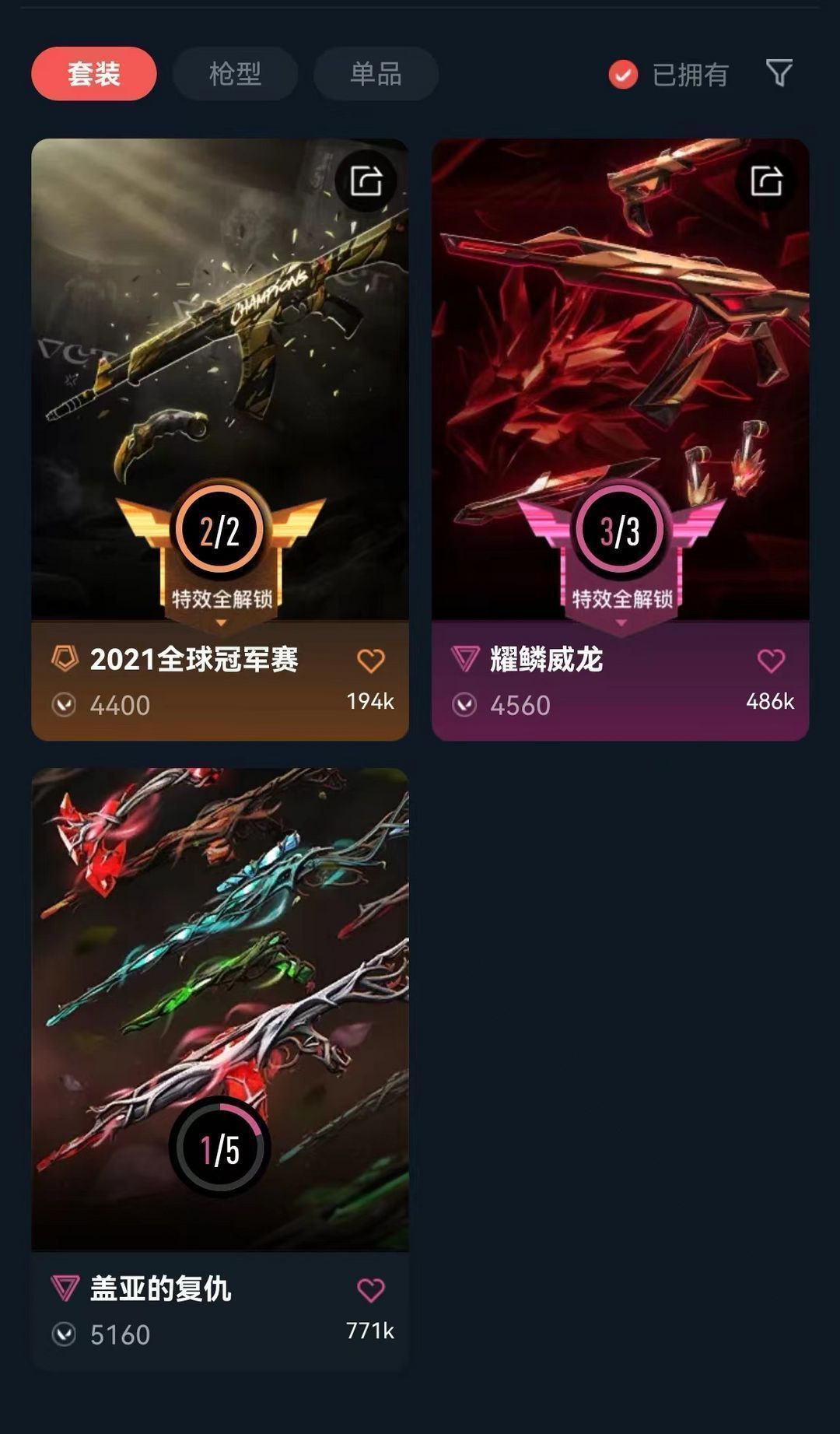 可排炸鱼拉黑❤21冠军套+威龙套❤盖亚AK❤21爪刀❤喜欢收藏