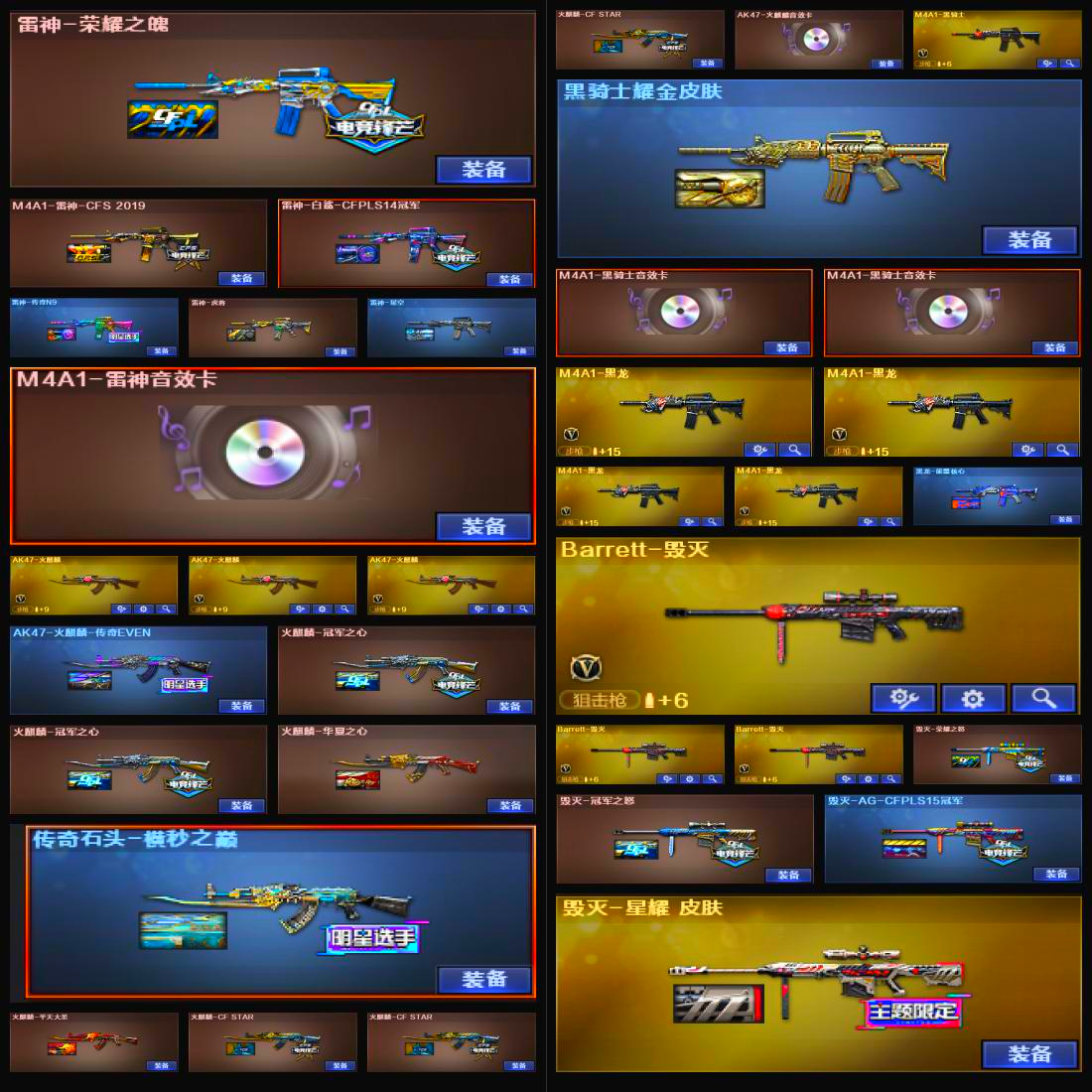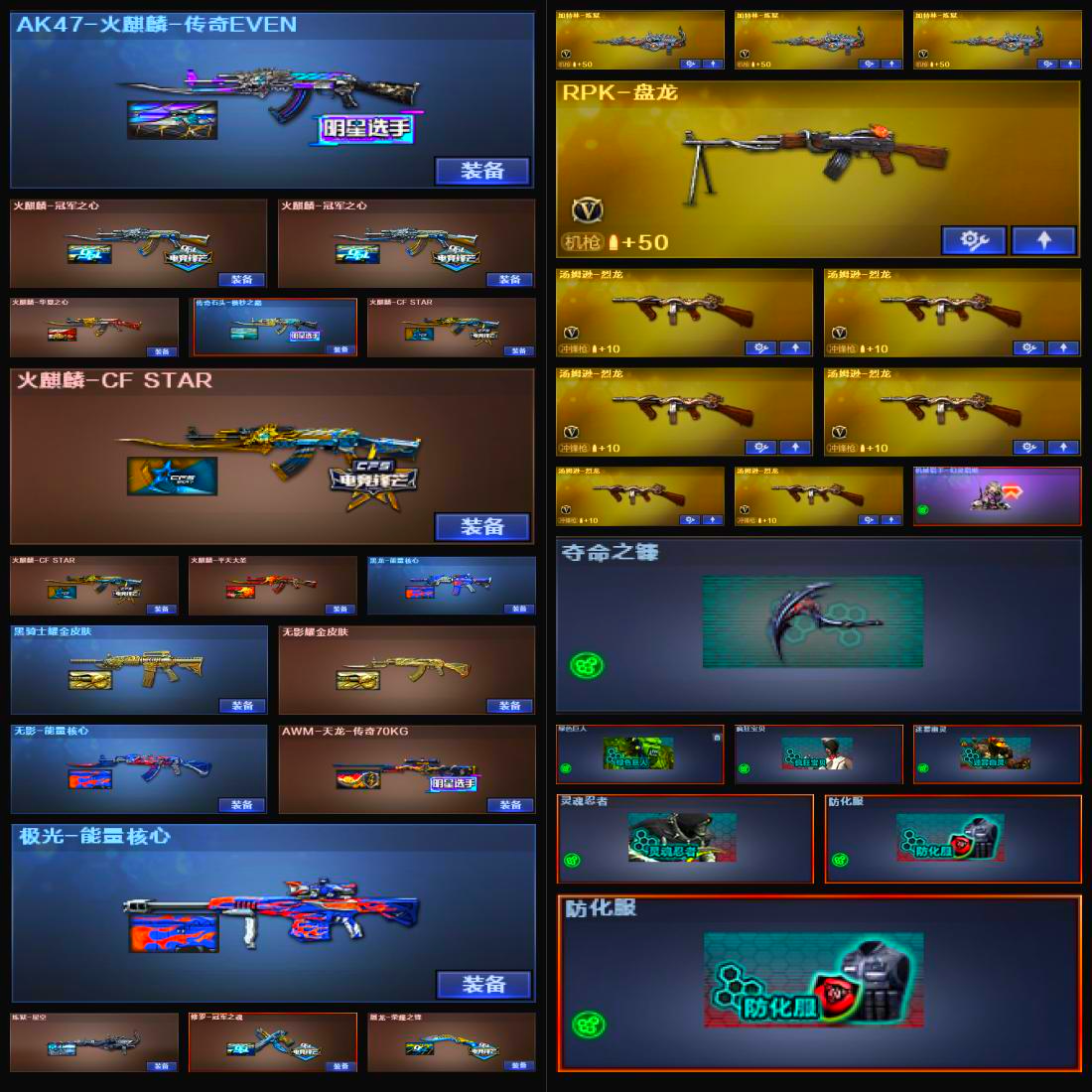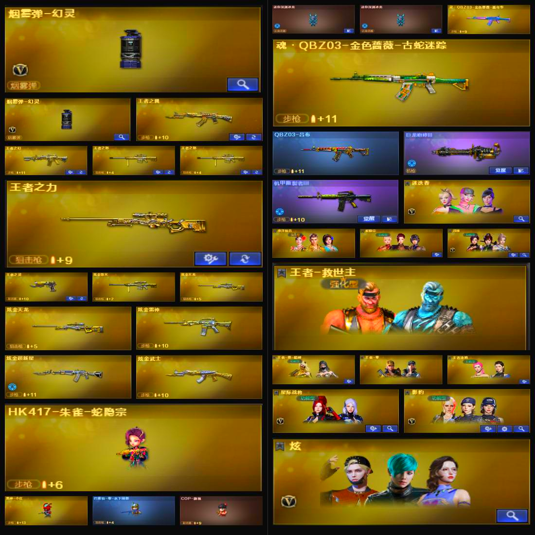 【亮点解析 幻神三件套 98k星神带卡 幻神6皮 生化六烈】 【m200-幻神+音效卡+幻神-冠军之幻+幻神-星耀+幻神-宠儿+幻神-ag17冠军+n92022mvp+电流骇客】 【98k星神+音效卡】 【传说光耀】 【g36c幻影+破浪逐光】 【scar白虎】 【qbz金色蔷薇】 【生化 3炼狱 6烈龙】 【裁决】 【毁灭+音效卡+毁灭-冠军之怒+毁灭-荣耀之怒】 【极光】 【幻灵套】 【堕天神套】 【荣耀世冠套】 【火麒麟+音效卡+火麒麟-even+火麒麟-横秒之巅+火麒麟-冠军之心】 【黑龙】 【雷神+音效卡+雷神-传奇n9+雷神-白鲨14冠军+雷神-荣耀之魄】 【黑骑士+音效卡】 【王者之心 王者之魄 王者之势】 【hk417-朱雀 青龙】 【14手呛 修罗*4 cop雷霆 usp雷暴 cop堕天神*2 cop幻灵*2】 【20近战 屠龙*3 擎天 麒麟刺*7 斩神刀雷暴 幻灵之锋】 【手雷 雷霆雷*5 雷暴雷*2 堕天神*7 幻灵雷*7】 【四防 影豹 王者葵貂蝉 王者涂鸦】;USP-雷暴,荣耀世冠-柯尔特,RPK-盘龙,QBZ03-金色蔷薇,G36C-幻影,M200-幻神,Scar Light-白虎,