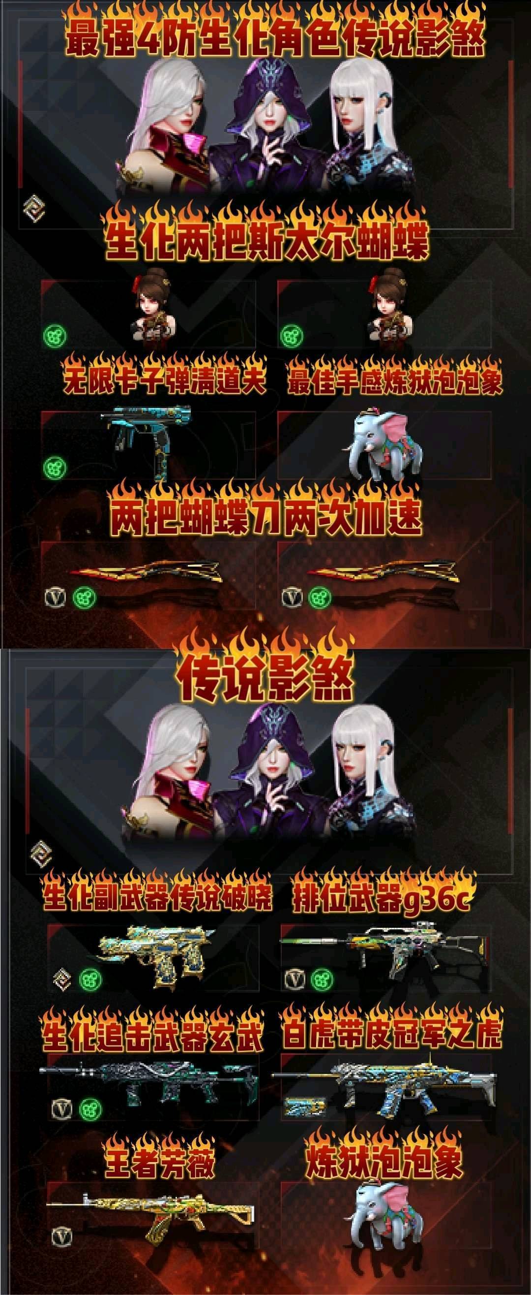 首发异变清道夫蛇影双骄玄豹步枪炼狱泡泡象生化4防传说影煞双炽芒蝶刃6盘6烈双蝴蝶清道夫冠虎玄武宙斯;USP-雷暴,炽芒蝶刃,传说影煞,RPK-盘龙,G36C-幻影,炼狱-泡泡象,Scar Light-白虎,