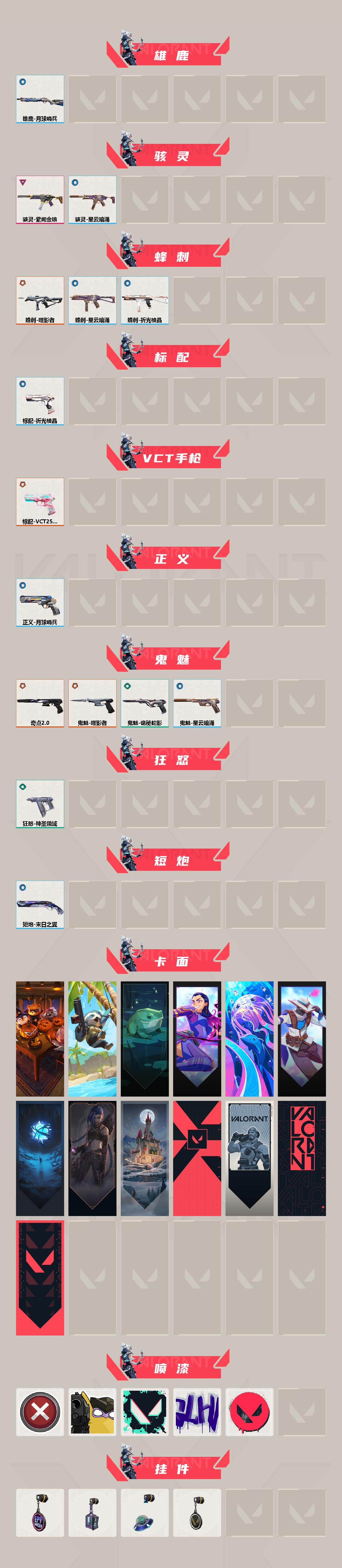【套装】:噬影者套装 【英雄】:幻棱,炼狱,维斯,暮蝶,钛狐,壹决,铁臂,捷风,幽影,不死鸟,贤者,猎枭,蝰蛇,零,芮娜,奇乐,尚勃勒,斯凯,夜露,星礈,K/O,海神,盖可,黑梦,钢锁 【近战武器】:近战武器-奇点//2.0 蝴蝶刀,近战武器-RGX 11z Pro//3.0 爪刀,近战武器-噬影者 簇刃,近战武器-诡秘蛇影 军刀,近战武器-神圣领域 战刀 【狂徒】:狂徒-创·纪元,狂徒-噬影者,狂徒-盖亚的复仇,狂徒-耀鳞威龙,狂徒-诡秘蛇影 【幻影】:幻影-侦察力量,幻影-异鳞魔蛇,幻影-海洋之星//2.0,幻影-神圣领域,幻影-末日之翼 【戍卫】:戍卫-噬影者,戍卫-月球哨兵,戍卫-折光棱晶 【獠犬】:獠犬-日冕雄师,獠犬-神圣领域 【冥驹】:冥驹-星云暗涌 【飞将】:飞将-末日之翼 【莽侠】:莽侠-诡秘蛇影,莽侠-月球哨兵 【战神】:战神-神圣领域 【奥丁】:奥丁-末日之翼 【判官】:判官-诡秘蛇影 【雄鹿】:雄鹿-月球哨兵 【骇灵】:骇灵-紫阙金琅,骇灵-星云暗涌 【蜂刺】:蜂刺-噬影者,蜂刺-星云暗涌,蜂刺-折光棱晶 【标配】:标配-折光棱晶 【VCT手枪】:标配-VCT25 x BLG 【正义】:正义-月球哨兵 【鬼魅】:鬼魅-奇点//2.0,鬼魅-噬影者,鬼魅-诡秘蛇影,鬼魅-星云暗涌 【狂怒】:狂怒-神圣领域 【短炮】:短炮-末日之翼 【卡面】:南瓜盛典 卡面,树懒大作战 卡面,霓帧牛蛙 卡面,无畏契约GO!一卷:芮娜 卡面,深海水族 卡面,无畏契约GO!一卷:零 卡面,无垠星环 卡面,《双城之战》金克丝 卡面,胡桃狂想 卡面,代号红色 卡面,新兵报到 卡面,V契约 卡面,无畏契约 卡面 【喷漆】:买装还是存钱 喷漆,放下武器 喷漆,胜利属于无畏契约 喷漆,GLHF 喷漆,无畏契约 喷漆 【挂饰】:第九季//第三幕 纪念币 挂饰,动力机箱 挂饰,天外飞客 挂饰,无畏契约 纪念币 挂饰;盖亚的复仇 狂徒,噬影者 狂徒,异鳞魔蛇 幻影,侦察力量 幻影,紫阙金琅 骇灵,