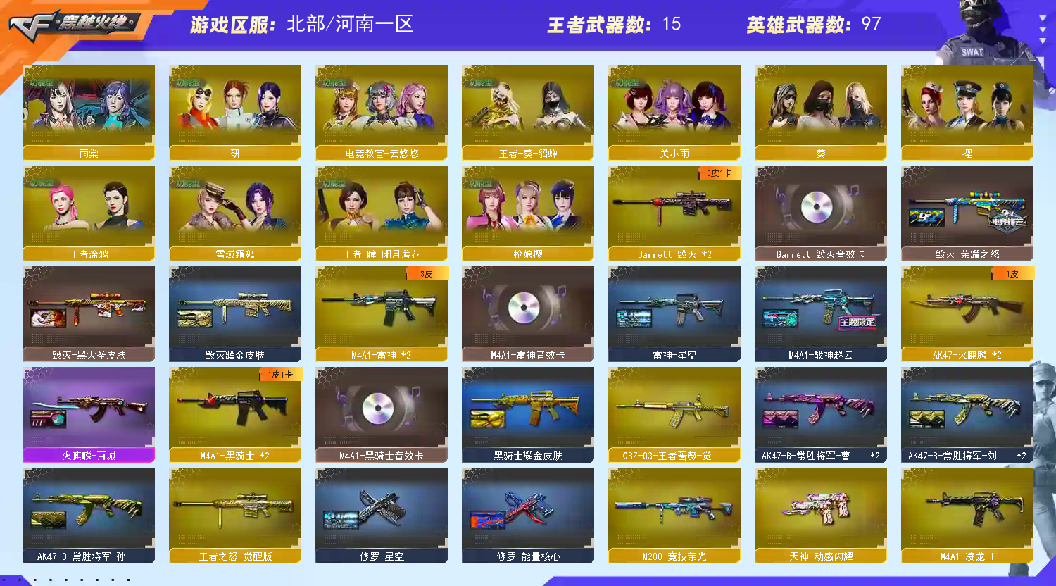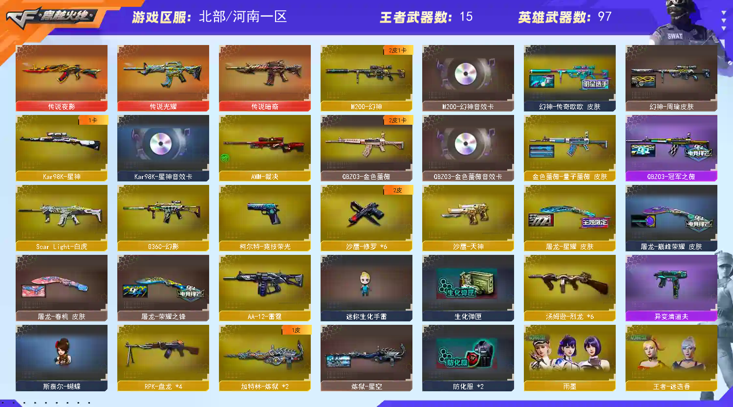 G36C幻影✅幻神传奇欧欧周瑜双皮音效卡✅星神音效卡✅QBZ双皮音效卡✅6烈龙蝴蝶清道夫6盘龙炼狱✅黄金鲨臂✅柯尔特✅银翼白虎✅生化爆破全装号 稀有传说光耀/传说暗裔/传说夜影/G36C幻影/M200幻神(传奇欧欧皮肤+周瑜皮肤+幻神音效卡+蓝粉色光效)/98K星神(星神音效卡)/M200竞技荣光/柯尔特竞技荣光/黄金猫猫手套白鲨 稀有6烈龙斯泰尔蝴蝶/异变清道夫/4盘龙2加特林炼狱/炼狱枪娘挚电/QBZ191银翼/Scar白虎/HK417朱雀/裁决雪莉杨/天龙曼陀罗/M4A1凌龙/HK417朱雀蛇隐踪/CAT刀锋/COP旗袍/金刚伞 稀有电竞教官云悠悠/关小羽/研/枪娘樱/雨棠(生化四防/捕食者之眼/佣兵觉醒/生化背包变更)/雨墨(爆破四防)/王者葵貂蝉(爆破四防)/王者迷迭香/王者瞳闭月羞花/王者涂鸦(爆破四防)/灵狐者职业经理/雅典娜 幻神传奇欧欧皮肤周瑜皮肤/金色蔷薇冠军之薇皮肤量子蔷薇皮肤/雷神战神赵云皮肤白鲨CFPLS14冠军皮肤星空皮肤/火麒麟AG战队皮肤百城皮肤/毁灭荣耀之怒皮肤耀金皮肤黑大圣皮肤/炼狱星空皮肤 修罗星空皮肤/屠龙星耀皮肤荣耀之锋皮肤巅峰荣耀皮肤春桃皮肤/麒麟刺荣耀世冠白鲨皮肤/M200幻神音效卡/98K星神音效卡/QBZ03金色蔷薇音效卡/毁灭音效卡/雷神音效卡/黑骑士音效卡 QBZ0王者蔷薇觉醒/王者雷怒觉醒/王者风势觉醒/王者之光觉醒/王者之怒觉醒/王者之心觉醒/王者之城觉醒/王者之锋觉醒/王者之击觉醒/王者之啸觉醒X2/王者之魄高爆手雷/王者之魄闪光弹X3 炫金雷神/炫金骑士/QBZ03吕布/阐释者3/1911宇航兔兔/MAC10涂鸦/真的是手枪/猫猫手套/迷你深渊冰龙/手斧镜/迷你生化手雷/雪域霜炫彩背包/竞技荣光套装/幻灵套装/古蛇迷踪套装 BS战队炫彩背包/KZ战队炫彩背包/CFS限定背包/超级对讲机/14个背包/最高荣誉元帅/CFVIP5/安全分100分/各种道具几百天到永久不等;电竞教官-云悠悠,RPK-盘龙,QBZ03-金色蔷薇,G36C-幻影,M200-幻神,Scar Light-白虎,Kar98K-星神,