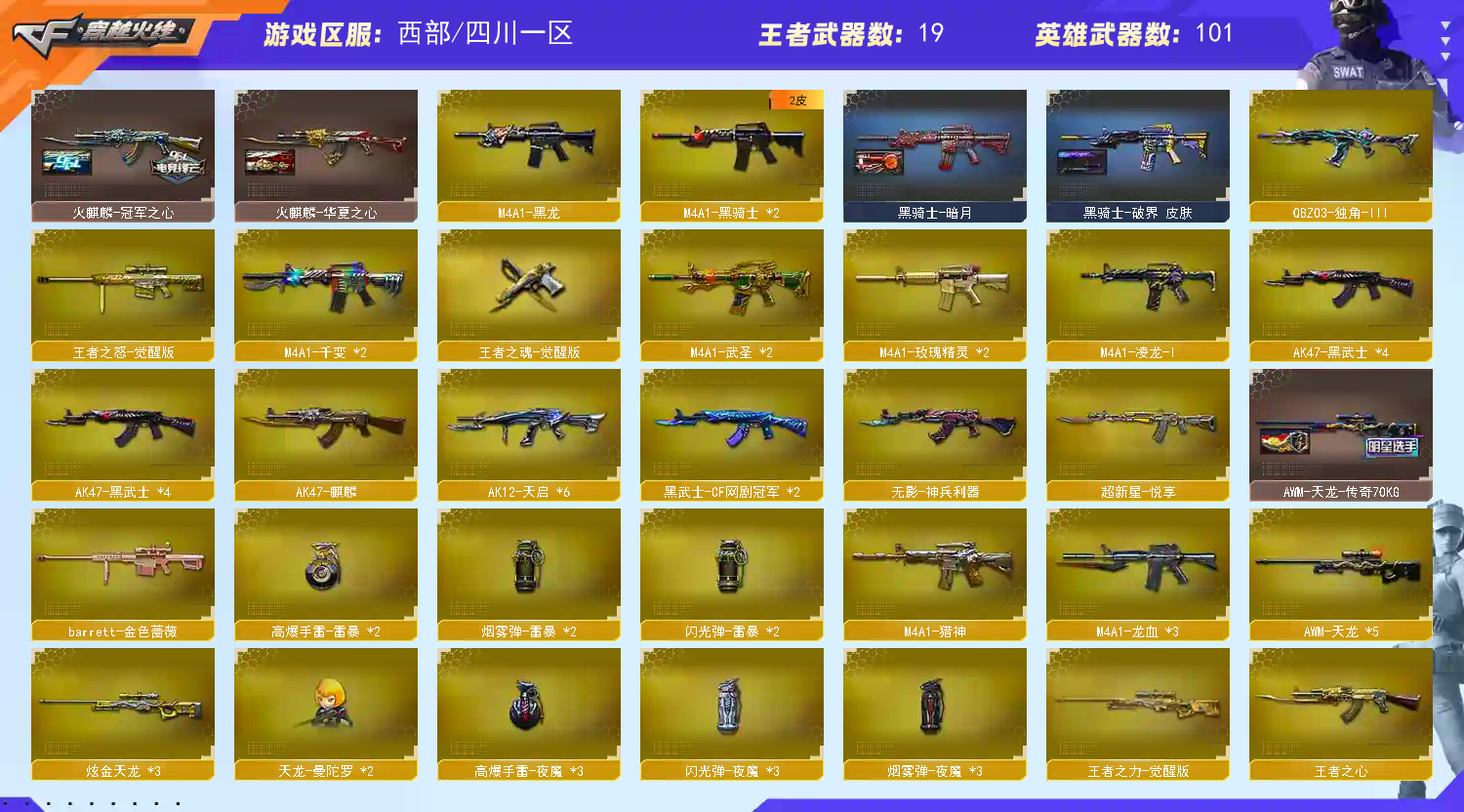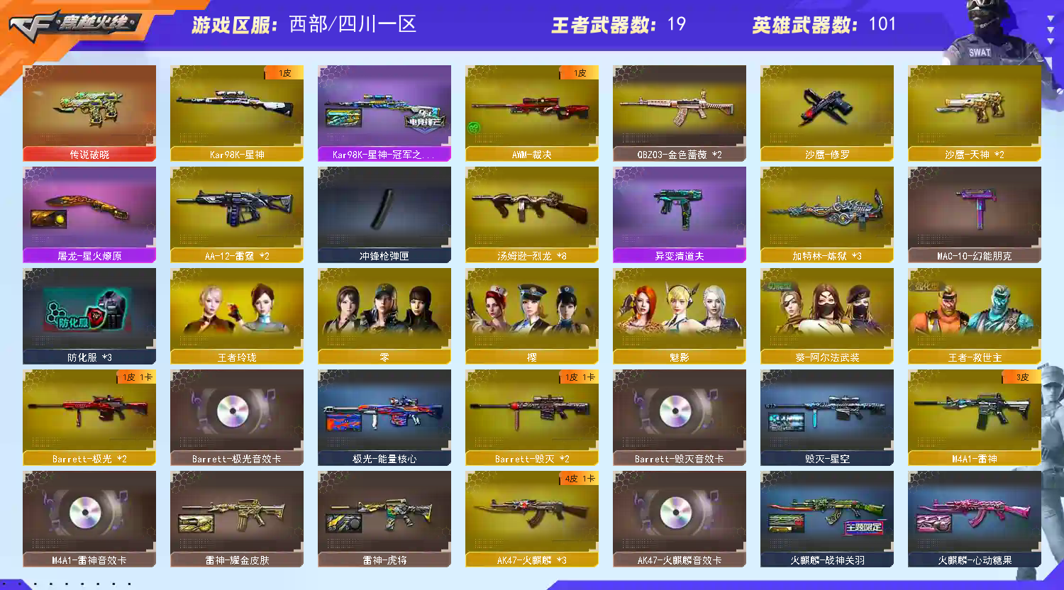 【Kar98K-星神+Kar98K星神冠军之星】【传说破晓】【QBZ03-金色蔷薇】【生化 3炼狱 6烈龙 异变清道夫】【裁决】【毁灭+音效卡】【极光+音效卡】【火麒麟+音效卡+火麒麟-冠军之心】【麒麟】【黑龙】【雷神+音效卡】【黑骑士】【王者之怒 王者之力】【千变 黑武士 天启 龙血 玫瑰精灵】【7手枪 修罗 天神*2 王者之魂】【15近战 屠龙*4 龙啸*3 麒麟刺*4 斩神刀雷暴 】【手雷 雷暴雷*2 夜魔雷*3】【角色 樱 魅影 王者救世主】;QBZ03-金色蔷薇,Kar98K-星神,