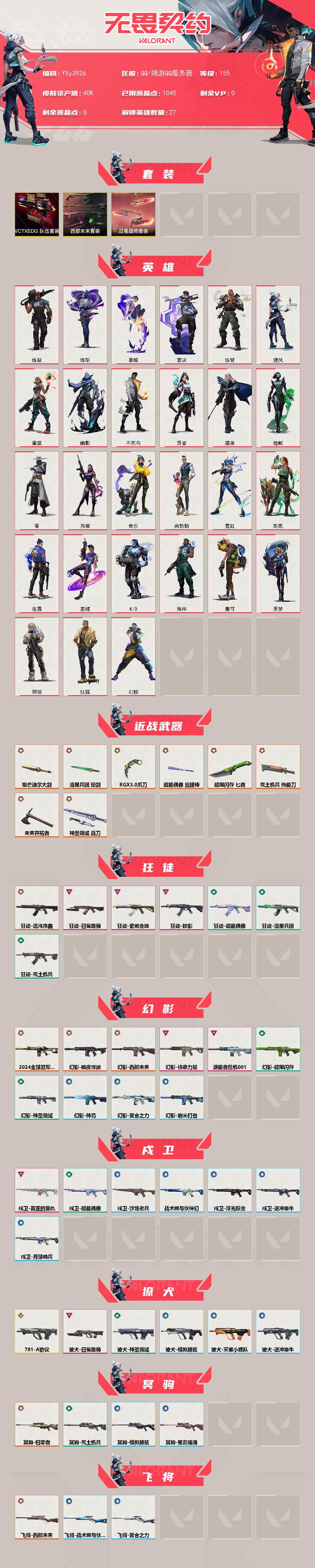 冻结三分钟内解除,短信通知重新上即可!喜欢收藏不迷路、游戏异常进小黑屋、时间不够请提前续租或者不要开局 【套装】:西部未来套装,VCTxEDG 队伍套装,日冕雄师套装 【英雄】:幻棱,炼狱,维斯,暮蝶,钛狐,壹决,铁臂,捷风,雷兹,幽影,不死鸟,贤者,猎枭,蝰蛇,零,芮娜,奇乐,尚勃勒,霓虹,斯凯,夜露,星礈,K/O,海神,盖可,黑梦,钢锁 【近战武器】:近战武器-RGX 11z Pro//3.0 爪刀,近战武器-未来开拓者,近战武器-埃芒迪尔大剑,近战武器-流星兵团 短剑,近战武器-超能偶像 应援棒,近战武器-超限闪存 匕首,近战武器-荒土机兵 热能刀,近战武器-神圣领域 战刀 【狂徒】:狂徒-混沌序曲,狂徒-掠影,狂徒-日冕雄师,狂徒-紫阙金琅,狂徒-超能偶像,狂徒-荒土机兵,狂徒-流星兵团 【幻影】:幻影-2024全球冠军赛,幻影-黯夜怪谈,幻影-西部未来,幻影-源能者危机001,幻影-侦察力量,幻影-超限闪存,幻影-神圣领域,幻影-聚合之力,幻影-纳米击,幻影-神罚,幻影-西部未来 【戍卫】:戍卫-盖亚的复仇,戍卫-超能偶像,戍卫-浮光跃金,戍卫-逆冲蛮牛,戍卫-沙场老兵,戍卫-战术熊与伙伴们,戍卫-月球哨兵 【獠犬】:獠犬-781-A协议,獠犬-日冕雄师,獠犬-神圣领域,獠犬-采蜜小蜂队,獠犬-模拟赫兹,獠犬-逆冲蛮牛 【冥驹】:冥驹-归零者,冥驹-荒土机兵,冥驹-模拟赫兹,冥驹-星云暗涌 【飞将】:飞将-西部未来,飞将-聚合之力,飞将-战术熊与伙伴们 【莽侠】:莽侠-超限闪存,莽侠-纤云弄巧,莽侠-月球哨兵 【战神】:战神-神圣领域,战神-采蜜小蜂队,战神-浮光跃金 【奥丁】:奥丁-西部未来,奥丁-流星兵团,奥丁-纳米击 【判官】:判官-超能偶像,判官-采蜜小蜂队,判官-纳米击x 【雄鹿】:雄鹿-日冕雄师,雄鹿-模拟赫兹,雄鹿-逆冲蛮牛,雄鹿-月球哨兵 【骇灵】:骇灵-荒土机兵,骇灵-流星兵团,骇灵-浮光跃金,骇灵-星云暗涌 【蜂刺】:蜂刺-超限闪存,蜂刺-聚合之力,蜂刺-纤云弄巧,蜂刺-星云暗涌 【标配】:标配-超能偶像,标配-荒土机兵,标配-浮光跃金,标配-战术熊与伙伴们 【VCT手枪】:标配-VCT x EDG 【正义】:正义-西部未来,正义-掠影,正义-日冕雄师,正义-超限闪存,正义-纳米击,正义-纤云弄巧,正义-月球哨兵 【鬼魅】:鬼魅-天界神兵,鬼魅-流星兵团,鬼魅-采蜜小蜂队,鬼魅-模拟赫兹,鬼魅-星云暗涌 【狂怒】:狂怒-神圣领域,狂怒-聚合之力,狂怒-逆冲蛮牛,狂怒-战术熊与伙伴们 【短炮】:短炮-纤云弄巧 【卡面】:终章:激斗汉堡 卡面,进入射程 卡面,分崩离析 卡面,纳米击 卡面,抑制技术 卡面,激斗汉堡 卡面,瓦娃雪糕 P2 卡面,从黄昏到黎明 卡面,荒土机兵 卡面,银弹猎手 卡面,逆冲蛮牛 卡面,《双城之战》拥抱 卡面,精灵大战 卡面,欢迎来到底城 卡面,南瓜盛典 卡面,VCT CN首冠 卡面,唱片的故事 卡面,钢弓与箭弦 卡面,无畏契约:暮蝶 卡面,排除故障 卡面,战术桌游 卡面,悠享食光 卡面,修车达人 卡面,热舞环节 卡面,模拟赫兹 卡面,浮光跃金 卡面,超限闪存 卡面,维斯工牌 卡面,正义的化身 卡面,终章:生意人麦宝 卡面,铁之华 卡面,失而复得 卡面,时间到 卡面,最高舞台 卡面,复活专家 卡面,归乡 // 蝰蛇 卡面,超能偶像 卡面,生意人麦宝 卡面,音熊登场 卡面,先瓦为敬 - 银色 卡面,声感陷阱设计图 卡面,红鳞松叶 卡面,霓帧牛蛙 卡面,钢锁工牌 卡面,战术小伙伴的夏日 卡面,采蜜小蜂队 卡面,聚合之力 卡面,梦幻奶茶 卡面,终章:打造专属狂徒 卡面,趁热吃 卡面,西装暴徒 卡面,失控边缘 卡面,哨卫者之领域 卡面,暮蝶工牌 卡面,战术熊与伙伴们 卡面,源能反应 卡面,流星兵团 卡面,纤云弄巧 卡面,暂别喧嚣 卡面,打造专属狂徒 卡面,零点嗅探设计图 卡面,无畏契约GO!一卷:芮娜 卡面,无畏契约GO!一卷:零 卡面,无垠星环 卡面,《双城之战》金克丝 卡面,代号红色 卡面,新兵报到 卡面,V契约 卡面,无畏契约 卡面 【喷漆】:小小心意 喷漆,战“素”兔 喷漆,宇宙的指引 喷漆,请求重启 喷漆,逆冲蛮牛 喷漆,纳米击 喷漆,鼻尖上的蝴蝶 喷漆,简笔画黯兽 喷漆,独守蝰腹 喷漆,他们将落荒而逃 喷漆,通缉:战术鹅 喷漆,荒土机兵 喷漆,别挡我吃球! 喷漆,嗨宝南瓜灯 喷漆,嘭! 喷漆,都算到了 喷漆,控场勿近 喷漆,皮蛋呼呼 喷漆,像素星礈 喷漆,图谋不轨的零 喷漆,伤心心 喷漆,小丑猫 喷漆,模拟赫兹 喷漆,高丽风情小熊 喷漆,蹲到一个 喷漆,全力集中 喷漆,超限闪存 喷漆,RUA一下 喷漆,熊抱 喷漆,蛋糕还是爆能器? 喷漆,高丽风情小虎 喷漆,记在小本本 喷漆,防弹鹅 喷漆,高丽风情小蛙 喷漆,又被闪了 喷漆,终极羞辱 喷漆,超级粉丝 喷漆,黯兽卖萌 喷漆,捷风差距 喷漆,惊声尖叫 喷漆,2021冠军巡回赛花火 喷漆,五人成星 喷漆,超能偶像 喷漆,放我出去 喷漆,战术熊的巴拉莱卡琴 喷漆,掩护我 喷漆,大佬发枪 喷漆,边缘试探 喷漆,拼一枪 喷漆,聚合之力 喷漆,采蜜小蜂队 喷漆,梦幻小队 喷漆,五个全都齐了 喷漆,加油!加油! 喷漆,开心到爆炸 喷漆,皮蛋萌舞 喷漆,我觉得不行 喷漆,头号粉丝 喷漆,吸一口快乐 喷漆,永远的答案 喷漆,再来一次? 喷漆,别挡我的路! 喷漆,我的刀呢? 喷漆,当然可以 喷漆,流星兵团 喷漆,战术熊与伙伴们 喷漆,禁止喷漆 喷漆,纤云弄巧 喷漆,买装还是存钱 喷漆,胜利属于无畏契约 喷漆,GLHF 喷漆,无畏契约 喷漆 【挂饰】:终章:猫猫木乃伊 挂饰,荒土机兵 挂饰,悠闲鸡块 挂饰,猫猫木乃伊 挂饰,水壶 挂饰,纳米击 挂饰,逆冲蛮牛 挂饰,可爱糖糖 挂饰,伞绳 挂饰,《双城