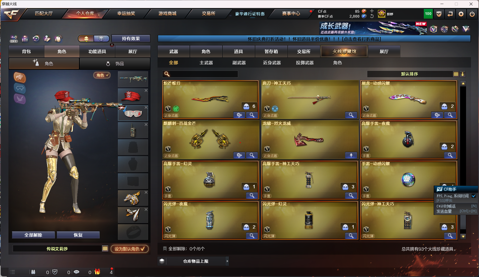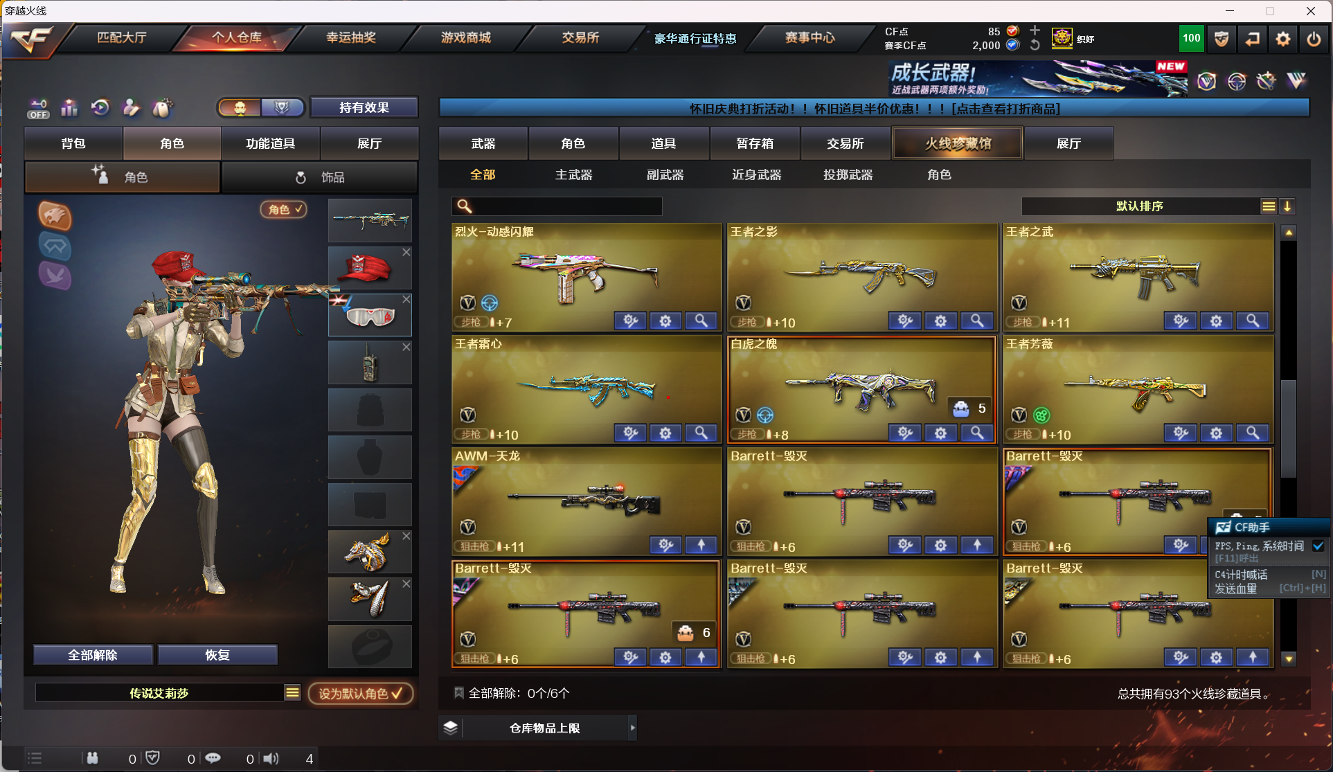 爆破号主流的武器都有神工天巧周年套传说夜影 灵眸 四防艾莉莎 隼 兰巾帼英雄 三防影豹 英雄武器 雷神 毁灭 金色蔷薇 天罚 玄武 星神 幻神 王者武器角色霜心 风神 芳薇 白虎之魄影 武 王者潘多拉 王者炫 王者瞳 音效卡有裁决 极光 毁灭 雷神 黑龙 皮肤有荣耀世冠白鲨qbz幻神 耀金 星空 凤灵 流光秘银 近战武器 炽芒蝶刃 神工天巧唐刀 小人枪 魔童降世 m37葵 火麒麟绝迹 炼狱迷你小刚 女主播鹿小町火线妹妮妮解说语音包 本人是女生玩的不多请爱惜~巅峰赛和排位开了话 麻烦打完啊 也麻烦通行证战币任务周任务可以帮忙做一做谢谢老板了;