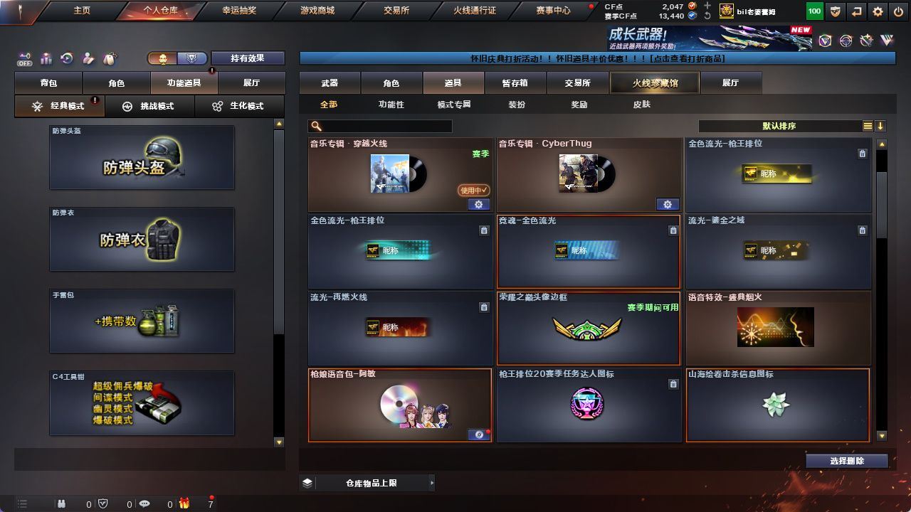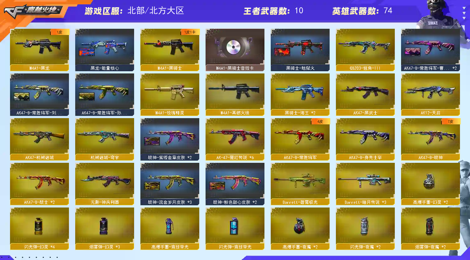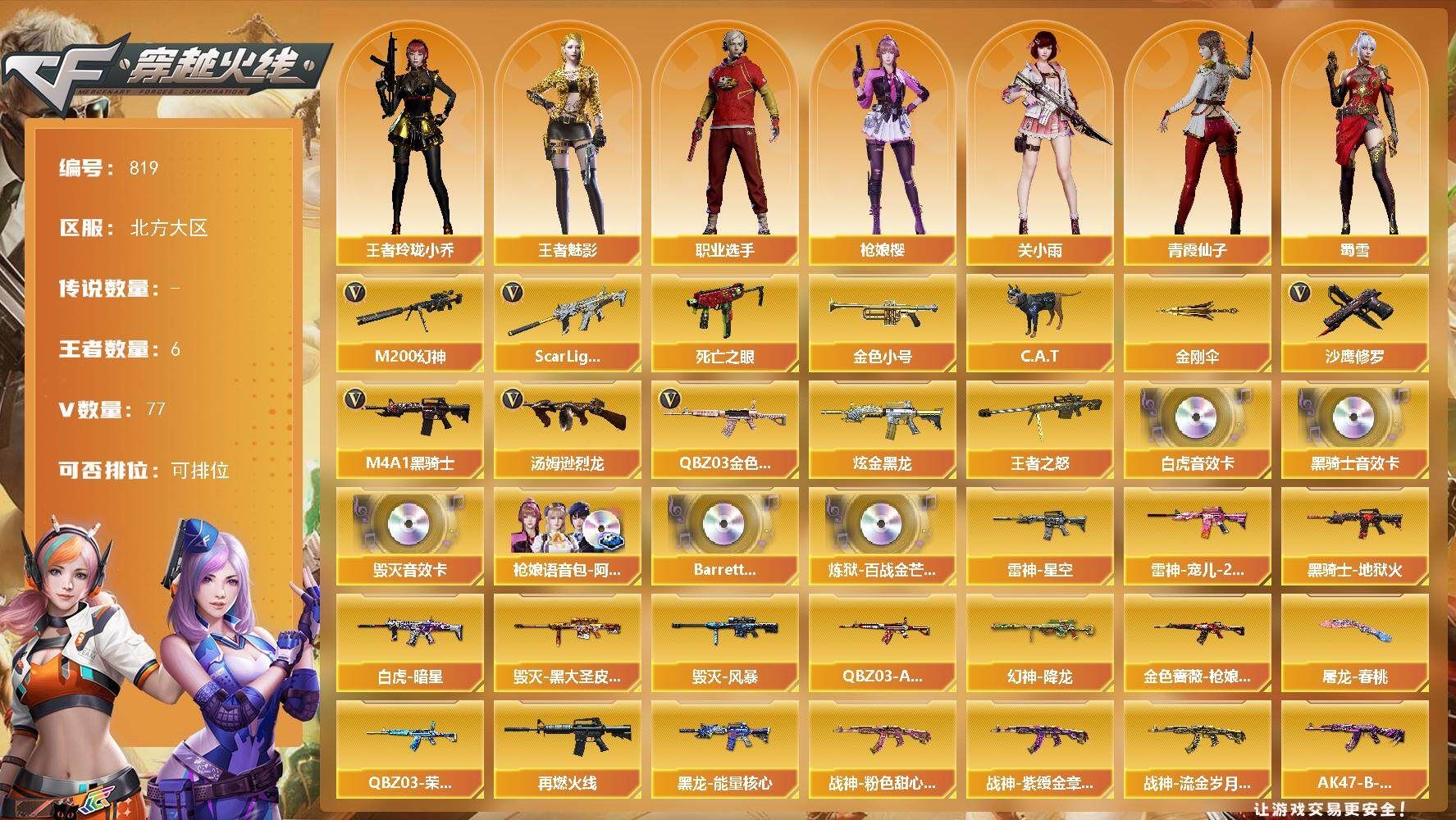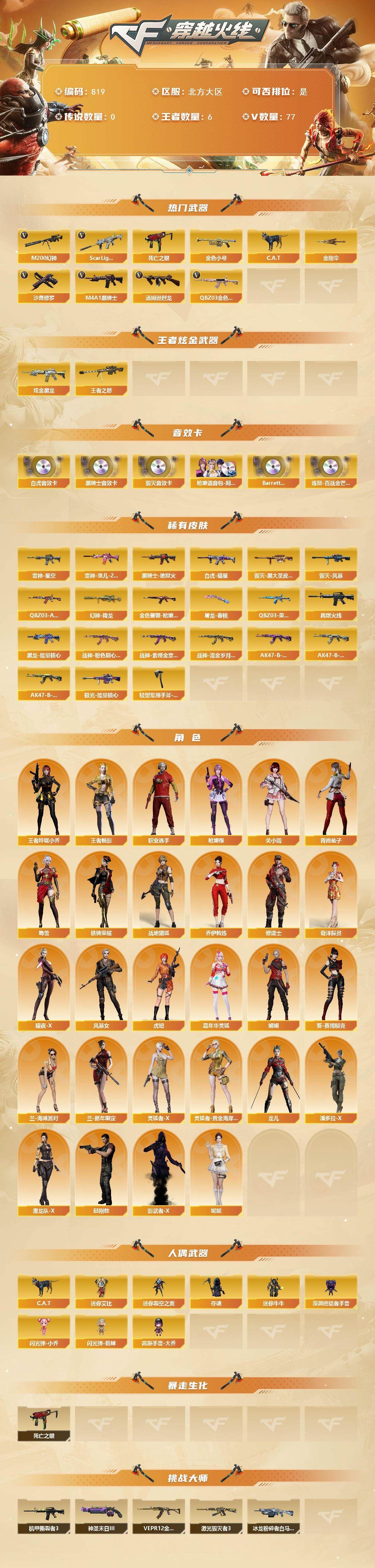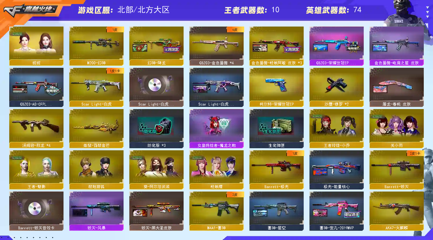 【热门武器】:QBZ03-金色蔷薇*4,Scar Light-白虎,M200-幻神,死亡之眼,金色小号,C.A.T,M4A1-黑骑士,汤姆逊-烈龙*4,沙鹰-修罗*2,金刚伞【王者炫金武器】:王者之怒,炫金黑龙【音效卡】:M4A1-黑骑士音效卡,Barrett-毁灭音效卡,Scar Light-白虎音效卡,枪娘语音包-阿敏,Barrett-碧霄极光音效卡,炼狱-百战金芒-庆典舞曲音效卡【皮肤】:幻神-降龙,Scar Light-白虎-暗星,QBZ03-AG-CFPLS19冠军,金色蔷薇-枪娘阿敏 皮肤*3,QBZ03-荣耀世冠EP 皮肤,雷神-星空,雷神-宠儿-2019MVP,M4A1-再燃火线,毁灭-黑大圣皮肤,毁灭-风暴,黑龙-能量核心,黑骑士-地狱火,战神-粉色甜心皮肤*2,战神-紫绶金章皮肤*2,战神-流金岁月皮肤*3,AK47-B-常胜将军-曹操*2,AK47-B-常胜将军-刘备,AK47-B-常胜将军-孙权,极光-能量核心,屠龙-春桃 皮肤,轻型军用手斧-再燃火线【角色】:关小雨,枪娘樱,妮妮,战地猎狐,王者-魅影,王者玲珑-小乔,奇洋探员,乔伊教练,修道士,暗夜-X,风暴女*2,虎妞,嘉年华灵狐,娟娟,葵-赛博朋克,兰-海滩派对,兰-新年限定,灵狐者-X,灵狐者-黄金海岸,龙儿,潘多拉-X,潜龙队-X,邱刚敖,青霞仙子,蜀雪,铁骑荣耀,影武者-X,职业选手【人偶武器】:C.A.T,迷你裂空之翼,夺魂,迷你牛牛,深渊终结者手雷,闪光弹-小乔,闪光弹-貂蝉,高爆手雷-大乔,迷你艾比【暴走生化】:死亡之眼【挑战大师】:冰龙粉碎者-白马银枪,VEPR-12-金魔,激光毁灭者III,机甲撕裂者III,神圣爆裂者-末日III【英雄级武器】:AK47-火麒麟,M4A1-黑龙,M4A1-雷神,M4A1-黑骑士,AK47-黑武士,AK12-天启,AK47-机械迷城,Scar Light-白虎,无影-神兵利器,QBZ03-独角-III,M4A1-玫瑰精灵,QBZ03-金色蔷薇*4,王者之魄-觉醒版,王者之势-觉醒版,AK-47-猩红传说*6,AK47-B-战神,王者冰魄-觉醒版,黑骑士-海王*2,AK47-B-常胜将军,王者风势-觉醒版,Barrett-毁灭,Barrett-极光,M200-幻神,炼狱-百战金芒,汤姆逊-烈龙*4,沙鹰-修罗*2,柯尔特-荣耀世冠EP,屠龙,龙啸,马来剑-夜魔,擎天,幻灵之锋,麒麟刺-百战金芒,王者之击-觉醒版,高爆手雷-夜魔*2,高爆手雷-幻灵*2,高爆手雷-竞技荣光,闪光弹-夜魔*2,闪光弹-幻灵*4,闪光弹-竞技荣光,烟雾弹-夜魔*2,烟雾弹-幻灵*3,烟雾弹-荣耀世冠EP,Barrett-碧霄极光【道具】:AG战队炫彩背包,EP战队炫彩背包,亚洲杯纪念炫彩背包,女皇终结者-背包,炫彩背包-诺拉,炫彩背包,百战金芒炫彩背包,背包-洛丽塔,背包-葫芦兄弟,超级背包,女皇终结者-魔龙之吻,救世主-黑桃战神,妩媚妖姬,绿色巨人,灵魂忍者,迷雾幽灵,生化弹匣,夺命之镰,防化服*3,金色流光-枪王排位*2,流光-鎏金之域,流光-再燃火线,语音特效-盛典烟火,萌萌小葵表情,炽雪表情,斯沃特表情,EP战队名片,防弹头盔*9,防弹衣*6,C4工具钳*6,手雷包*5【特殊枪械】:1白虎,1黑骑士,4烈龙;妮妮,QBZ03-金色蔷薇,M200-幻神,Scar Light-白虎,