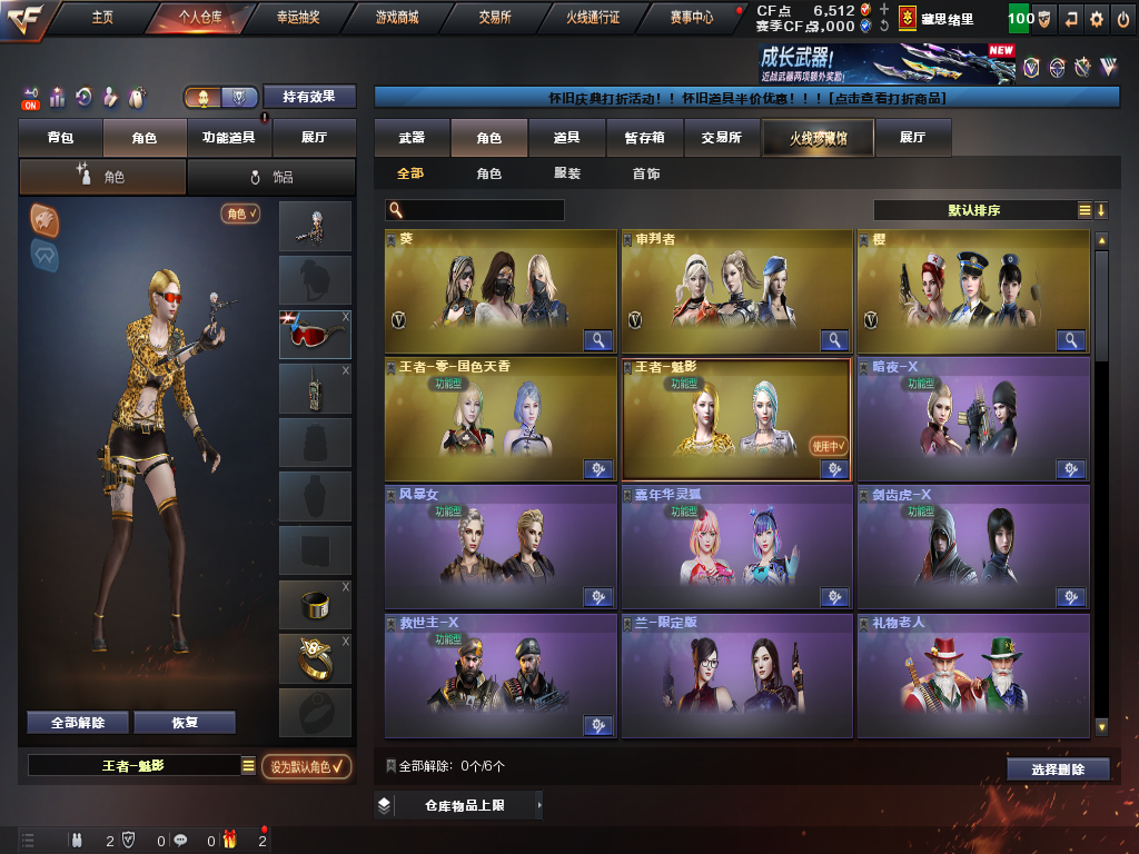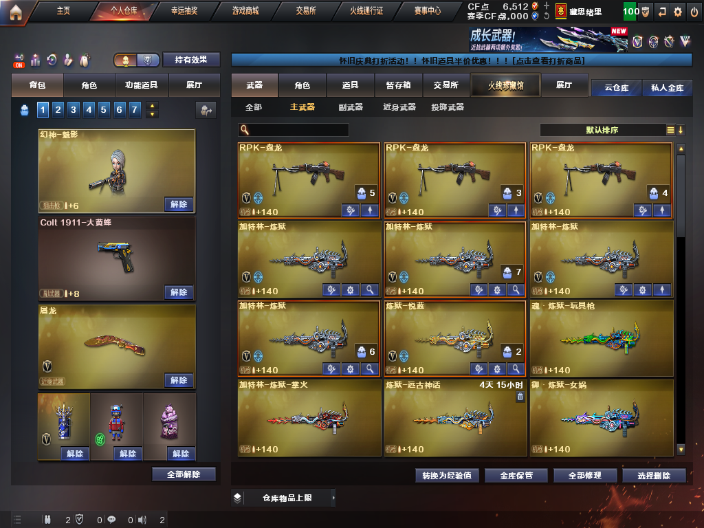 【主武器】幻神-魅影/裁决/毒刺-金线/⑥烈龙/炼狱悦蓝觉醒版/④炼狱/③盘龙/千变/火麒麟/黑龙/2雷神/3黑骑士/超新星/武圣/黑鲨/蔷薇qbz/2烈火/毁灭/暗月传说大炮/④AA12雷霆/炫金雷神/天龙曼陀罗/神圣爆裂者末日3/ 【副武器}】⑤修罗/王者之魂觉醒版/天神/王者之灵/ 【近身武器】屠龙/龙啸/擎天/麒麟刺/王者之击觉醒版/黄金生化钩/ 【投掷武器】⑥凤凰之熄高爆 【角色】王者魅影+生化四防/王者零国色天香/审判者/樱/葵/对讲机/炫彩背包/圣灵戒/魔龙戒 【皮肤】火麒麟-冠军之心皮肤/雷神-虎将皮肤/毁灭-星空-耀金皮肤/ 【音效卡】毁灭音效卡/黑骑士音效卡/ 【道具】紫金大元首/全背包/VIP6/AC/烟雾头/步枪/冲锋枪/机枪/狙击枪/生化弹夹/变异宝贝/疯狂宝贝/灵魂忍者/绿巨人/迷雾幽灵/勇往直前包/机械猎手幻灵猎姬皮肤/生化爆破全装;炽芒蝶刃,RPK-盘龙,QBZ03-金色蔷薇,Scar Light-白虎,Kar98K-星神,