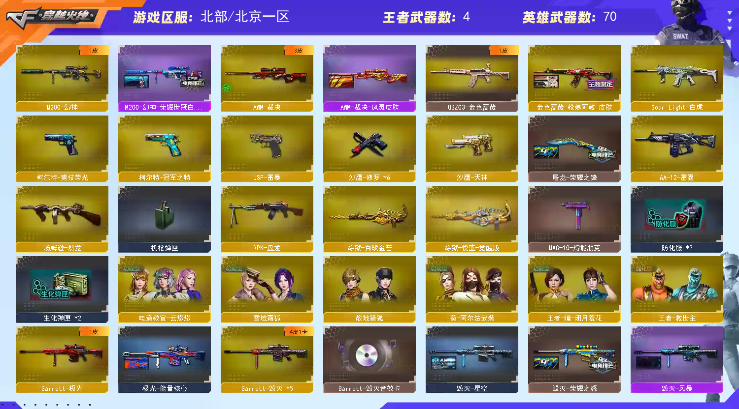 各位老板,上不去号的重启上号器给如有频繁登录,关闭Wegame,重新登录上号器,本账号已经在公安局做了虚以财产登记。若是因为外挂行为导致账号被封。u号zu实ming制的。还有游戏ip登录记录,不管你在哪都能找到你你,最后造成的财产损失,不是你承担就是你家人承担。切勿以身犯法。文明游戏,挂机拉黑 请老板完成对局后再下线.祝老板游戏愉快把把mvp;USP-雷暴,柯尔特-冠军之特,电竞教官-云悠悠,RPK-盘龙,QBZ03-金色蔷薇,M200-幻神,Scar Light-白虎,