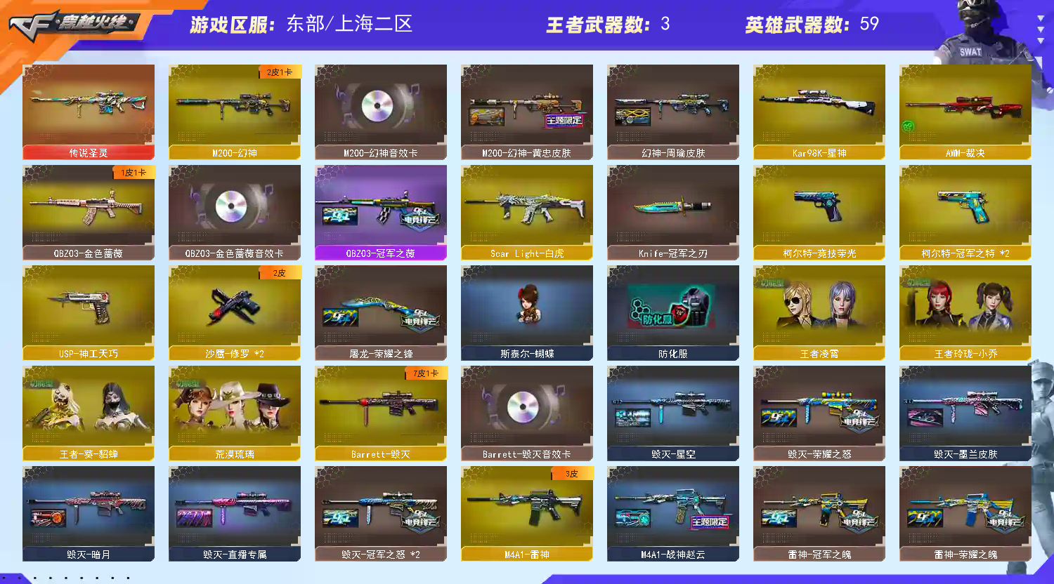 【幻神3件套!!!】【金色蔷薇3件套!!!】【m200幻神+幻神音效卡+周瑜皮肤+黄忠皮肤+柯尔特冠军之特*2+usp神工天巧+冠军之刃】【m200竞技荣光套装】【98k星神】【传说圣灵】【白虎+白虎之魄】【qbz03金色蔷薇+金色蔷薇音效卡+冠军之薇皮肤+qbz03王者蔷薇】【火麒麟+火麒麟音效卡+冠军之心皮肤】【毁灭+毁灭音效卡+冠军之怒皮肤+荣耀之怒皮肤+直播专属皮肤】【雷神+冠军之魄皮肤+荣耀之魄皮肤】【黑骑士+黑骑士音效卡】【王者火魄】【烈火 无影神兵利器 裁决】——【热门武器/小人呛】【斯泰尔蝴蝶 金钢伞 cop旗袍 】——【柯尔特冠军之特*2 usp神工天巧 柯尔特竞技荣光 修罗 天神动感闪耀】——【幻灵之锋 龙啸 麒麟刺 擎天 擎天竞技荣光 屠龙 屠龙动感闪耀】——【竞技荣光投掷武器套装*7+神工天巧投掷武器套装*3】——【角色】【4防(荒漠琉璃 王者葵貂蝉 王者玲珑小乔 王者凌霄 灵狐者职业经理 女主播 )】【乔伊教练】;柯尔特-冠军之特,Knife-冠军之刃,QBZ03-金色蔷薇,M200-幻神,Scar Light-白虎,Kar98K-星神,