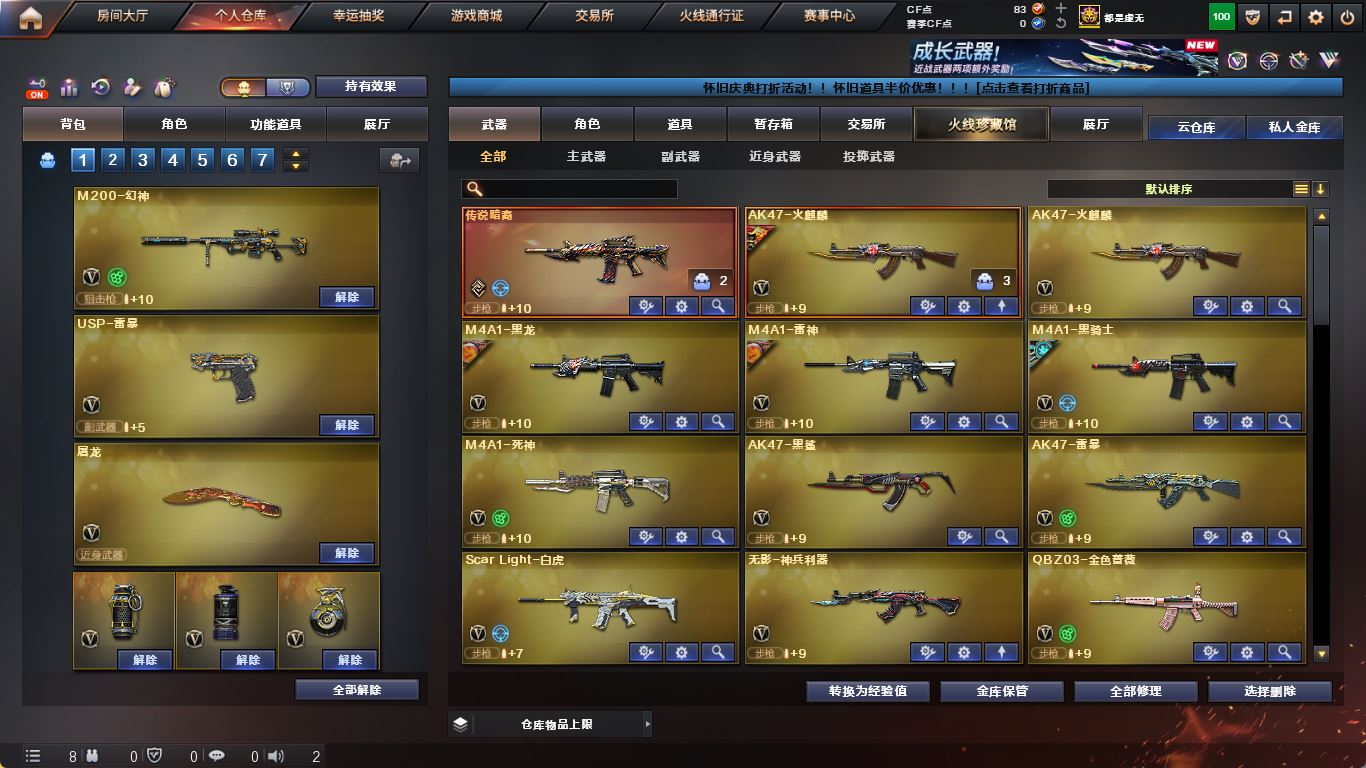【M200-幻神】【传说暗裔】【ScarLight-白虎】【QBZ03-金色蔷薇】【生化 盘龙 2炼狱 6烈龙】【毁灭】【雷暴】【火麒麟】【黑龙】【雷神】【黑骑士+音效卡+白马银枪】【王者之心 王者之势】【死神 黑鲨 】【9手枪 修罗*4 天神 usp雷暴】【11近战 屠龙 龙啸*2 擎天 麒麟刺 斩神刀雷暴 幻灵之锋】【手雷 雷暴雷*5 电竞装甲 幻灵雷】【四防 王者魅影 王者炽天使】;USP-雷暴,荣耀世冠-柯尔特,RPK-盘龙,QBZ03-金色蔷薇,M200-幻神,Scar Light-白虎,传说暗裔,