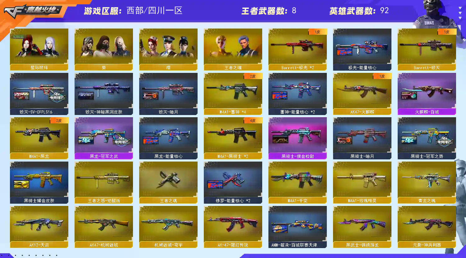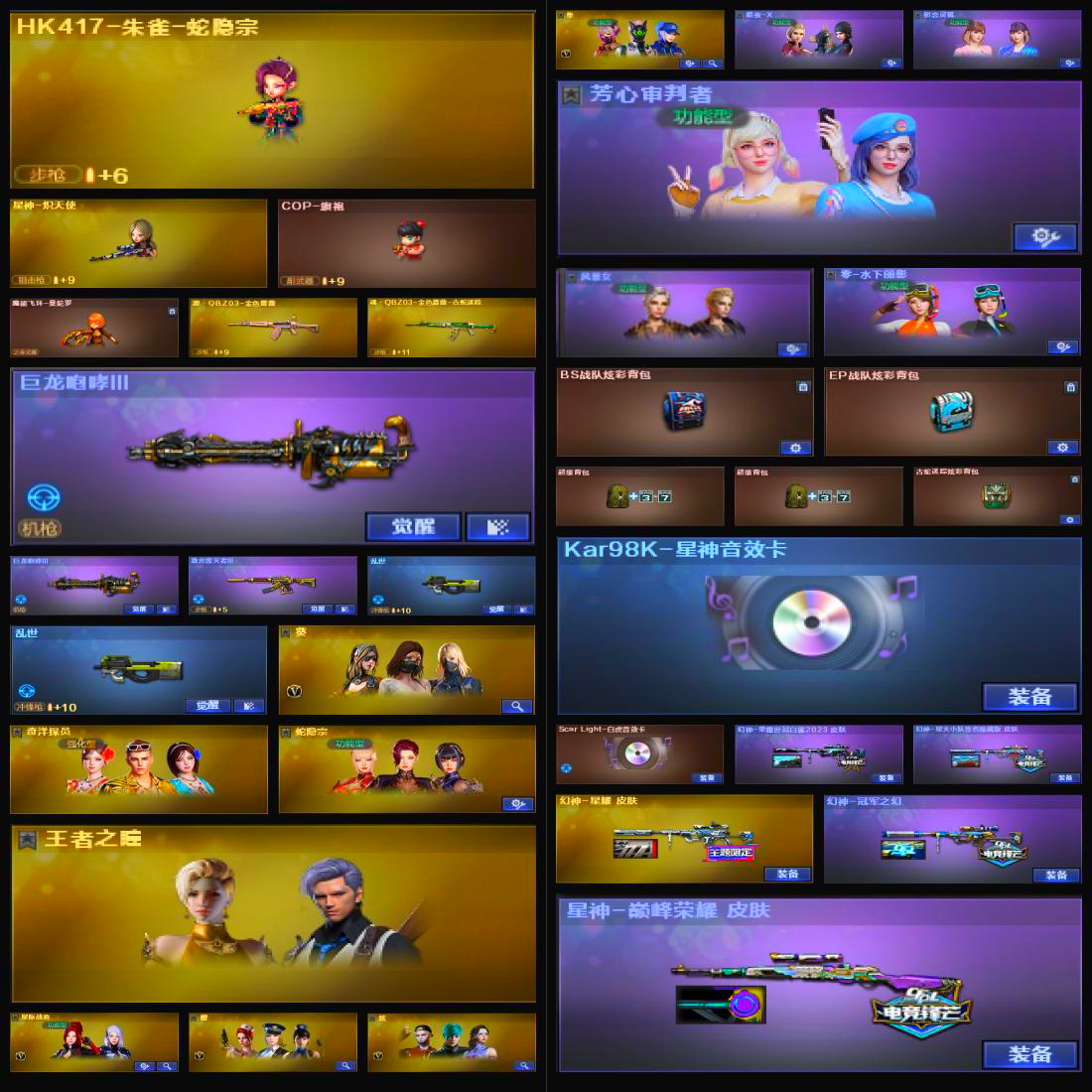 【传说幽瞳】【M200-幻神+幻神-星耀+幻神-冠军之幻+星火小队+幻神-荣耀世冠白鲨2023】【Kar98K-星神+音效卡+巅峰荣耀】【g36c幻影】【ScarLight-白虎+音效卡+白鲨23冠军】【QBZ03-金色蔷薇+宠儿】【生化 2盘龙 炼狱 6烈龙 死亡之眼】【裁决】【毁灭】【极光】【火麒麟】【黑龙+黑龙-冠军之武】【雷神】【黑骑士+黑骑士-冠军之势】【青龙之魄 王者之怒】【死神 天启 超新星 机械迷城】【10手枪 修罗*3 天神*4 cop雷霆 柯尔特荣耀世冠白鲨2023】【16近战 屠龙*8 龙啸*2 擎天 麒麟刺 斩神刀雷暴 王者之锋】【手雷 雷霆雷*5 雷暴雷】【角色 星际战将 隼 王者之瞳】;柯尔特-荣耀世冠白鲨2023,隼,RPK-盘龙,QBZ03-金色蔷薇,传说幽瞳,G36C-幻影,M200-幻神,