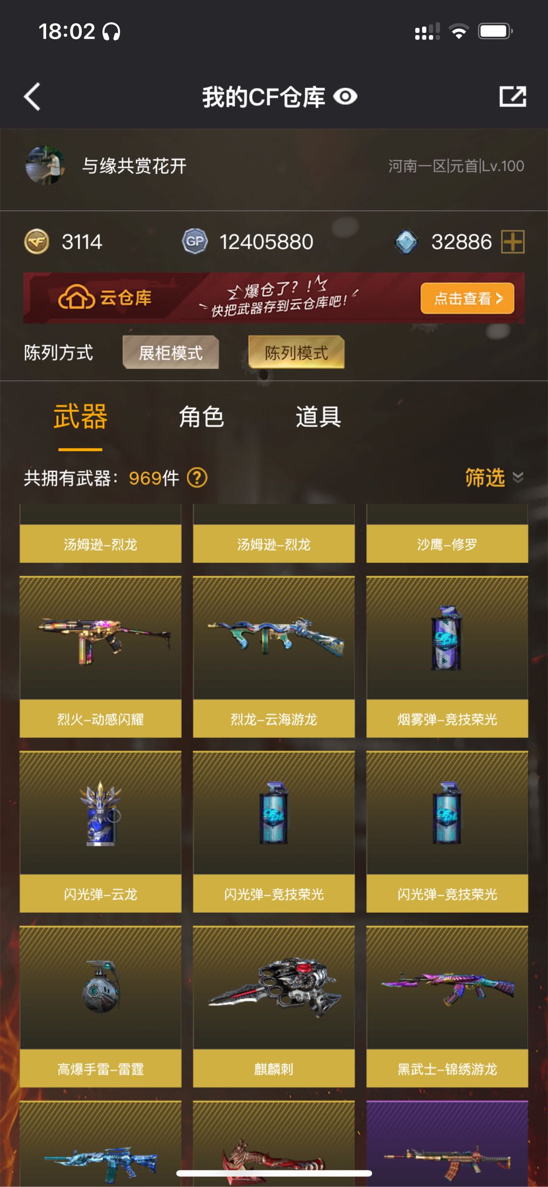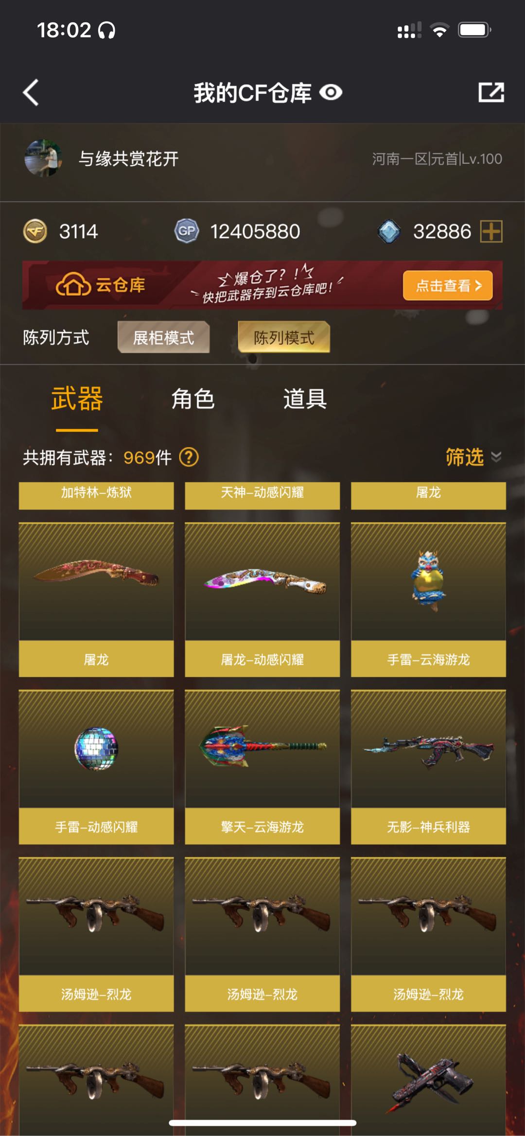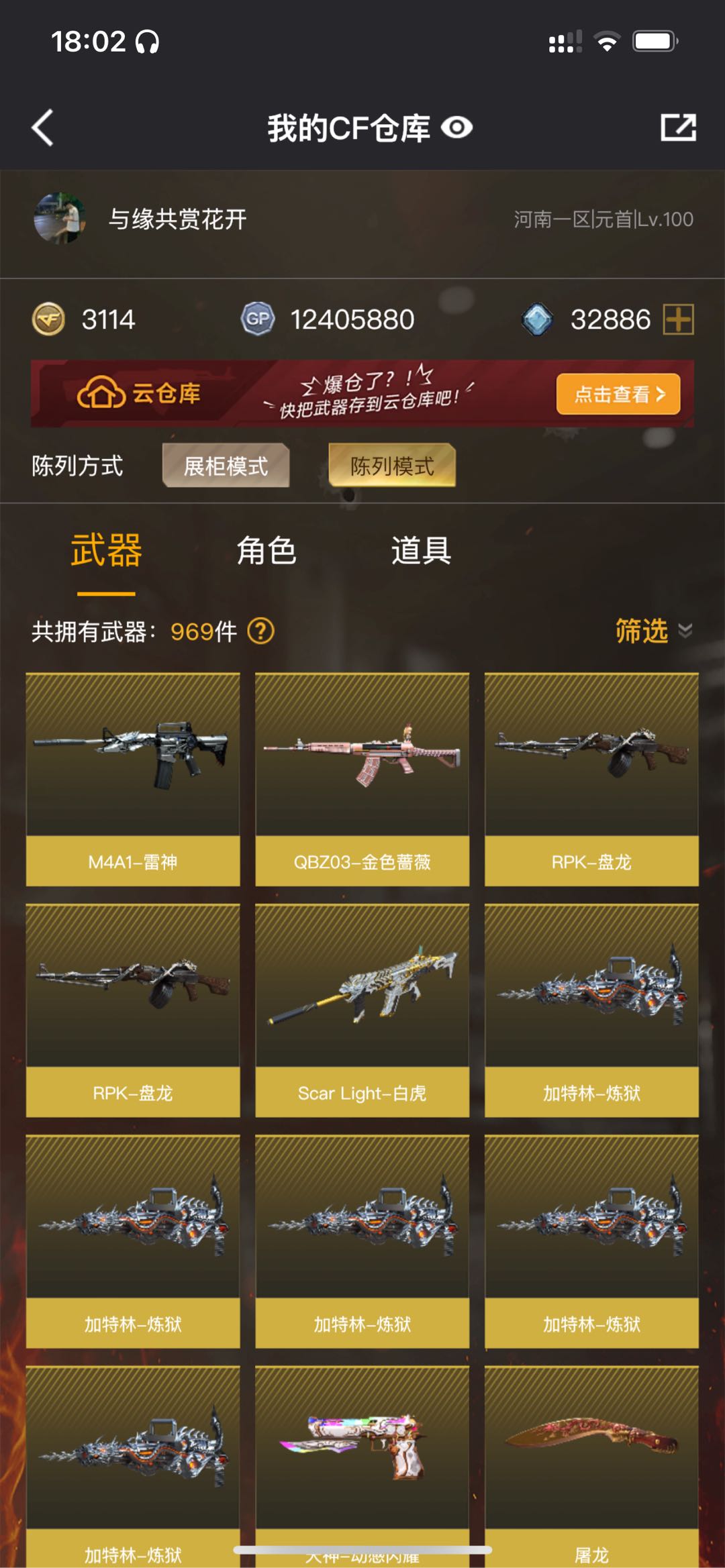 【主武器】M200-幻神/G36c-幻影/白虎/玄武/朱雀/⑥烈龙⑤炼狱②盘龙/毒蜂/死亡之眼/雷神/火麒麟/无影/黑武士/超新星热带奇洋/蔷薇qbz/烈火动感闪耀/天龙/毁灭/极光/王者之光觉醒/王者之力觉醒/神圣爆裂者末日3/EVO赤血龙魂/ 【副武器】修罗/天神/③涂鸦手枪 【近身武器】②屠龙/麒麟刺/屠龙大公司所以/擎天云海游龙/龙啸热带奇洋/太极扇火凤/黄金尼泊尔/迷你波特博士/迷你牛牛/手斧镜 【投掷武器】迷你生化手雷/②高爆雷霆王者/高爆雷霆/手雷动感闪耀/手雷云海游龙/手雷热带奇洋 【角色】鹰+三防/隼+三防/王者刀锋+生化四防/战地猎狐/奇洋探员/乔伊教练/修道士/云海游龙/灵狐者职业经理+爆破四防/炽天使/对讲机/炫彩背包/双戒指 【皮肤】幻神-电流骇客皮肤/雷神-CFS2019-星空-耀金皮肤/屠龙-星火燎原皮肤/毁灭星空皮肤/火麒麟天龙修罗STAR皮肤 【音效卡】朱雀音效卡/擎天云海游龙音效卡/烈龙动感闪耀音效卡 【道具】元首/全背包/VIP5/AC/烟雾头/闪光镜/钩子/防化服/变异宝贝/疯狂宝贝/迷雾幽灵/绿巨人/灵魂忍者/手枪/步枪/冲锋枪/机枪/狙击枪/生化弹夹/生化爆破全装;隼,RPK-盘龙,QBZ03-金色蔷薇,G36C-幻影,M200-幻神,Scar Light-白虎,