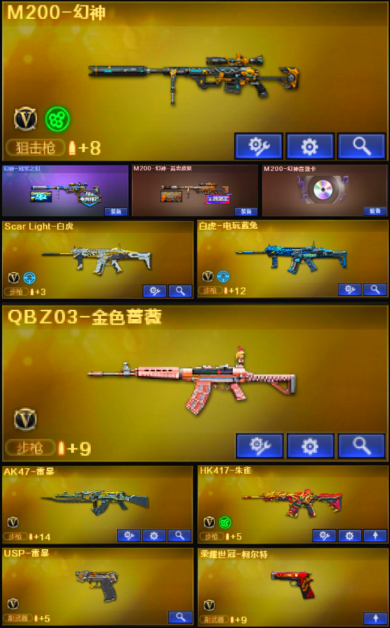 【北.部】天花板♥幻神三件套♥白虎qbz♥六盘六烈蝴蝶♥斯泰尔双面令狐♥双质量手枪♥满雷套;USP-雷暴,荣耀世冠-柯尔特,炽芒蝶刃,RPK-盘龙,QBZ03-金色蔷薇,M200-幻神,Scar Light-白虎,