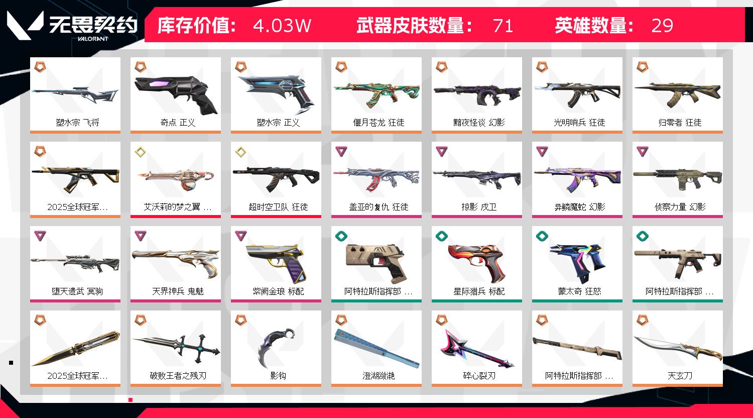 !!!!!因无畏契约检测严格,为防止后台插件导致封号,请务必重启电脑!!!!本人商户多年,所属账号已在派出所备案,若出现账号封禁/毁号等情况,会马上与平台联系,取得信息后立马报警处理!请租客文明游戏,不要开挂或挂机! 1.请勿使用第三方软件/插件/外挂,平台检测到会直接结束订单并拉黑。 2.登陆界面稍等2分钟会上去(自动登录)老板不要着急,一次不行多来几次,wegame界面要耐心等2分钟 3..密令会自动输入如果一次不成功多来几次 4.请及时续租,不要挂机,导致禁赛的一律拉黑 5.祝老板玩的愉快,喜欢可以收藏关注;艾沃莉的梦之翼 奥丁,盖亚的复仇 狂徒,掠影 戍卫,异鳞魔蛇 幻影,侦察力量 幻影,塑水宗 飞将,堕天遗武 冥驹,