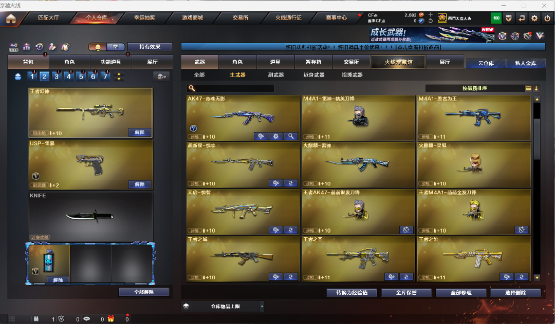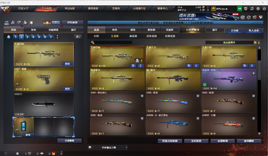 四防角色职业经理,王者涂鸦,王者春,岚兮儿,晴雅,云悠悠。弹夹齐全可用cf点补,毁灭音效卡,火麒麟音效卡黑骑士音效卡。 六烈龙斯太尔蝴蝶,白虎电玩蓝兔,金色蔷薇,王幻,王怒,王击,王刺,王势,王力,王心等王者武器,王者小人枪可排位。 禁止排位挂机中途退出游戏等违规操作;USP-雷暴,电竞教官-云悠悠,晴雅,RPK-盘龙,QBZ03-金色蔷薇,