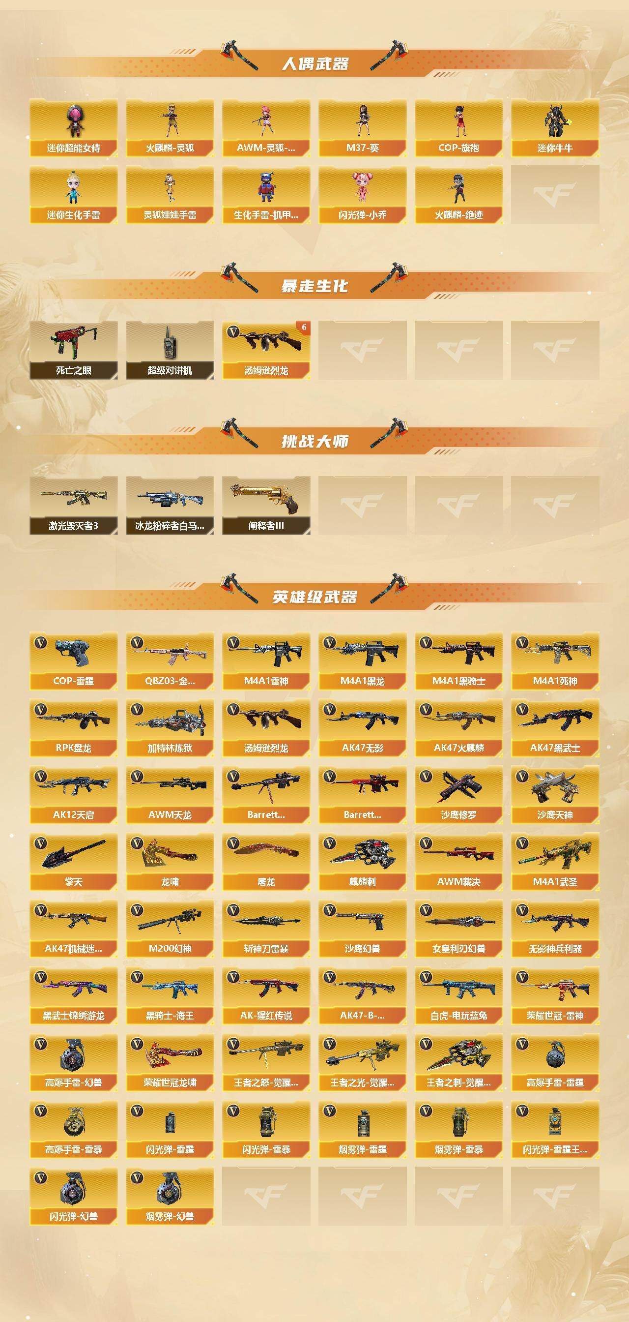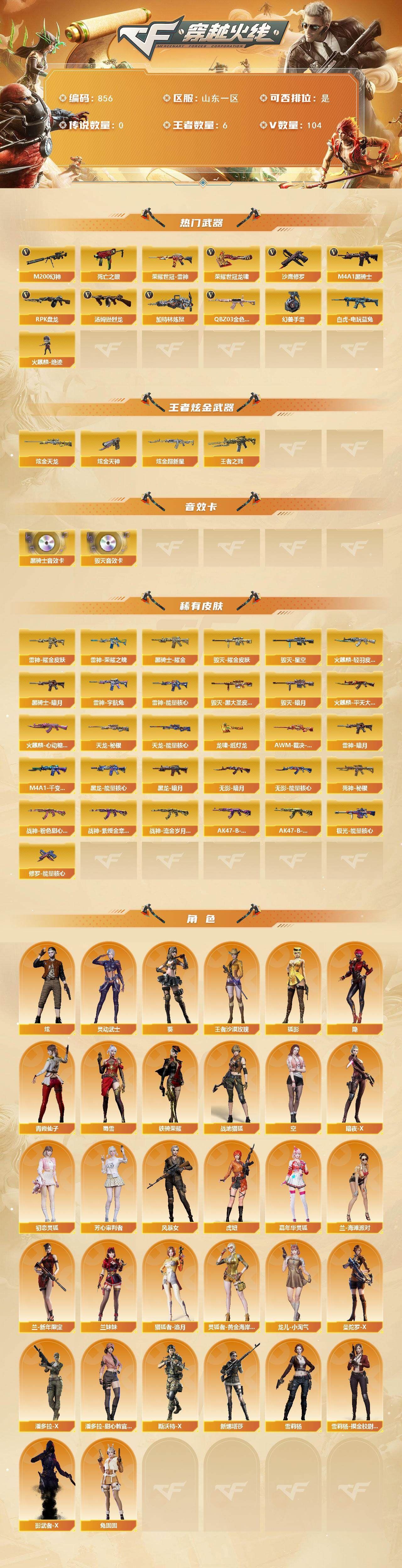 【热门武器】:QBZ03-金色蔷薇*2,M200-幻神,死亡之眼*2,荣耀世冠-雷神,白虎-电玩蓝兔,M4A1-黑骑士,汤姆逊-烈龙*6,RPK-盘龙*2,加特林-炼狱,火麒麟-绝迹,沙鹰-修罗*3,荣耀世冠-龙啸,高爆手雷-幻兽【王者炫金武器】:王者之戮,炫金超新星,炫金天龙,炫金天神【音效卡】:M4A1-黑骑士音效卡,Barrett-毁灭音效卡【皮肤】:AWM-裁决-凤灵皮肤,雷神-暗月,雷神-能量核心,雷神-荣耀之魄,雷神-耀金皮肤,雷神-宇航兔皮肤,火麒麟-轻羽皮肤,火麒麟-平天大圣,火麒麟-心动糖果,毁灭-暗月*2,毁灭耀金皮肤,毁灭-星空,毁灭-黑大圣皮肤,M4A1-千变-孔明皮肤,黑龙-能量核心,黑龙-暗月,黑骑士-暗月,黑骑士耀金皮肤,无影-暗月*3,无影-能量核心,死神-秘银,战神-粉色甜心皮肤*3,战神-紫绶金章皮肤,战神-流金岁月皮肤*2,AK47-B-常胜将军-曹操,AK47-B-常胜将军-孙权,天龙-秘银,天龙-能量核心,极光-能量核心*2,修罗-能量核心,龙啸-纸灯龙皮肤【角色】:葵,炫,隐,战地猎狐,王者沙漠玫瑰,狐影,空,暗夜-X,初恋灵狐,芳心审判者,风暴女,虎妞,嘉年华灵狐,兰-海滩派对,兰-新年限定,兰妹妹,猎狐者-追月,灵动武士,灵狐者-黄金海岸,龙儿-小淘气,曼陀罗-X,潘多拉-X,潘多拉-甜心教官,青霞仙子,斯沃特-X,蜀雪,铁骑荣耀,兔囡囡,新娜塔莎,雪莉杨,雪莉杨-摸金校尉,影武者-X【人偶武器】:火麒麟-绝迹,火麒麟-灵狐,AWM-灵狐-15周年嘉年华,M37-葵,COP-旗袍*2,迷你牛牛,迷你生化手雷,生化手雷-机甲核心,闪光弹-小乔,迷你超能女侍,灵狐娃娃手雷【暴走生化】:死亡之眼*2,超级对讲机【挑战大师】:冰龙粉碎者-白马银枪,激光毁灭者III,阐释者III【英雄级武器】:AK47-火麒麟*4,M4A1-黑龙*4,M4A1-雷神*2,M4A1-黑骑士,AK47-无影*5,M4A1-死神*2,AK47-黑武士,AK12-天启*3,M4A1-武圣,AK47-机械迷城,无影-神兵利器,黑武士-锦绣游龙,QBZ03-金色蔷薇*2,AK-47-猩红传说*3,AK47-B-战神,黑骑士-海王,白虎-电玩蓝兔,荣耀世冠-雷神,AWM-天龙,Barrett-毁灭*3,Barrett-极光*2,AWM-裁决,M200-幻神,王者之怒-觉醒版,王者之光-觉醒版,RPK-盘龙*2,加特林-炼狱,汤姆逊-烈龙*6,沙鹰-修罗*3,沙鹰-天神*2,COP-雷霆,沙鹰-幻兽,屠龙*5,龙啸*3,擎天*2,麒麟刺*3,荣耀世冠-龙啸,斩神刀-雷暴,女皇利刃-幻兽,王者之刺-觉醒版,高爆手雷-雷霆*5,高爆手雷-幻兽,高爆手雷-雷暴,闪光弹-雷霆*5,闪光弹-幻兽,闪光弹-雷暴,闪光弹-雷霆王者-觉醒版,烟雾弹-雷霆*5,烟雾弹-幻兽,烟雾弹-雷暴【道具】:BS战队炫彩背包,云山科技背包,全能枪王背包,女皇终结者-背包,战舰背包,炫彩背包,背包-洛丽塔,虎牙炫彩背包,超级背包,哔哩哔哩名片,女皇终结者-魔龙之吻,救世主-黑桃战神,绿色巨人,灵魂忍者,迷雾幽灵,生化弹匣,夺命之镰,防化服*3,金色流光-枪王排位*2,星辰流光-枪王排位,巅峰赛先锋-金色流光,枪王排位28赛季金色流光,枪王排位29赛季金色流光,电玩兔兔表情,C4-再燃火线,防弹头盔*6,防弹衣*5,C4工具钳*5,手雷包*3【特殊枪械】:1黑骑士,6烈龙,2盘龙,1炼狱;王者沙漠玫瑰,RPK-盘龙,QBZ03-金色蔷薇,M200-幻神,