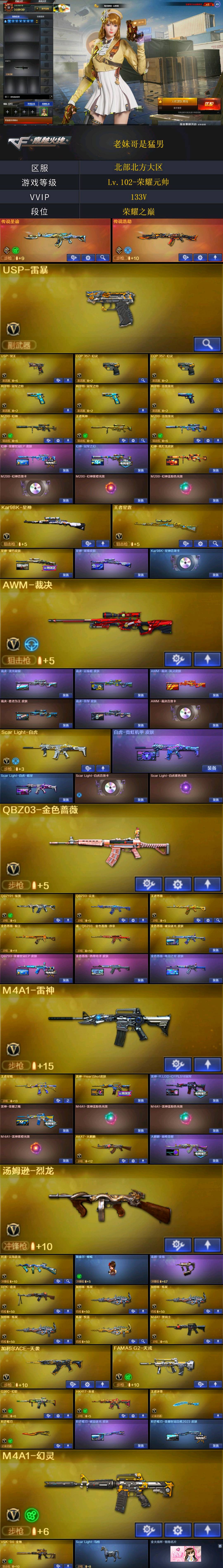 【商品标题】:北部北方大区-126V-可二次实名-【Lv.102-荣耀元帅】-【段位:枪王2】 【稀有武器】:M200-幻神/Kar98K-星神/VSK-94-金蚀/G36C-幻影/ScarLight-白虎/HK417-朱雀/M4A1-幻灵/USP-雷暴/COP357-幻灵(2)/柯尔特-竞技荣光/修罗-云海游龙/修罗-古蛇迷踪/柯尔特-冠军之特(2)/金色蔷薇-古蛇迷踪/QBZ03-云龙/QBZ03-金色蔷薇/AK47-火麒麟/M4A1-黑龙/M4A1-雷神(2)/M4A1-黑骑士/Barrett-毁灭(2)/AWM-裁决/M200-竞技荣光/RPK-盘龙/加特林-炼狱(3)/AA-12-雷霆/炽芒蝶刃/斩神刀-雷暴/幻灵之锋 【王者武器】:王者芳薇-觉醒版/王者风神-觉醒版/王者雷怒/王者星霆 【热门角色】:电竞教官-云悠悠/隐/鹰/影豹/奇洋探员/乔伊教练/蛇隐宗/王者-迷迭香/王者潘多拉/潘多拉-X/兔囡囡 【热门音效卡】:M200-幻神音效卡/Kar98K-星神音效卡/AWM-裁决音效卡/Scar Light-白虎音效卡/HK417-朱雀音效卡/QBZ03-天罚音效卡/Barrett-毁灭音效卡/M4A1-黑骑士音效卡/M4A1-黑龙音效卡 【热门皮肤】:幻神-冠军之幻/幻神-纸灯龙皮肤/雷神-HeartShot皮肤/金色蔷薇-破浪逐光皮肤/星神-破竹皮肤/擎天-傲竹金蛇皮肤/金色蔷薇-热带奇洋皮肤/屠龙-星火燎原(2)/裁决-羽掣皮肤/雷神-R.LGD-CFPLS18冠军/火麒麟-巅峰荣耀/白虎-霓虹机甲 皮肤/屠龙-破浪逐光皮肤/星神-璀璨皮肤/裁决-流光秘银/炽芒蝶刃-破浪逐光皮肤/ScarLight-白虎-暗星/炽芒蝶刃-荣耀世冠白鲨2023皮肤/极光-高能霹雳皮肤/黑骑士-AG-S4冠军典藏/屠龙-荣耀之锋(2)/屠龙-春桃皮肤/龙啸-冠军之啸(2)/雷神-荣耀之魄/毁灭-荣耀之魄 【其他亮点】:斯泰尔-蝴蝶/Scar Light-马枪/贝雷塔687-射手座/贝雷塔687-射手座 (截图展示段位不代表实际段位,如赛季更新等不可抗拒因素发生变化,其余道具看截图或咨询客服);USP-雷暴,柯尔特-冠军之特,炽芒蝶刃,电竞教官-云悠悠,RPK-盘龙,QBZ03-金色蔷薇,G36C-幻影,